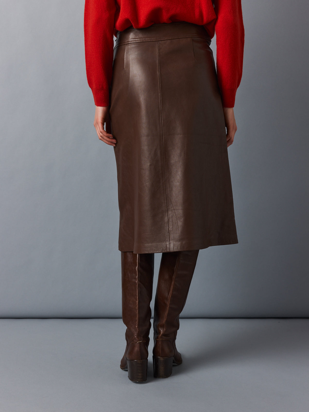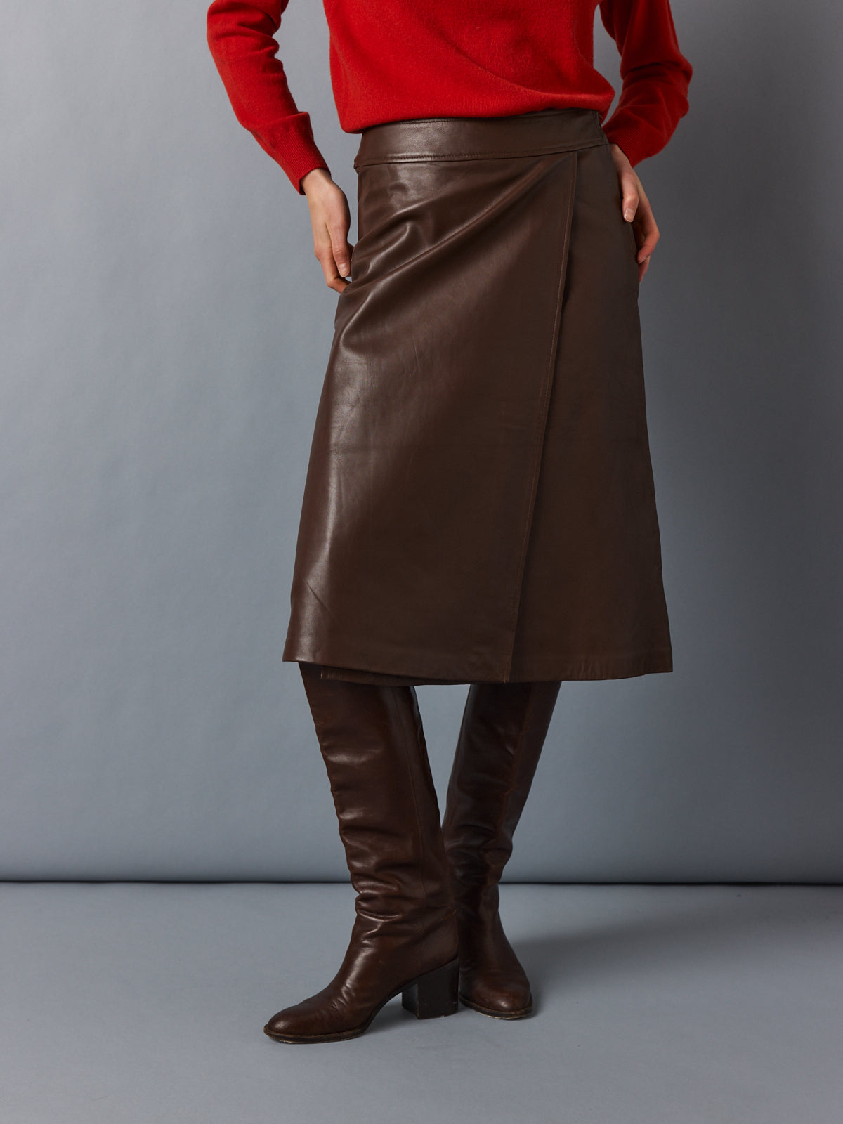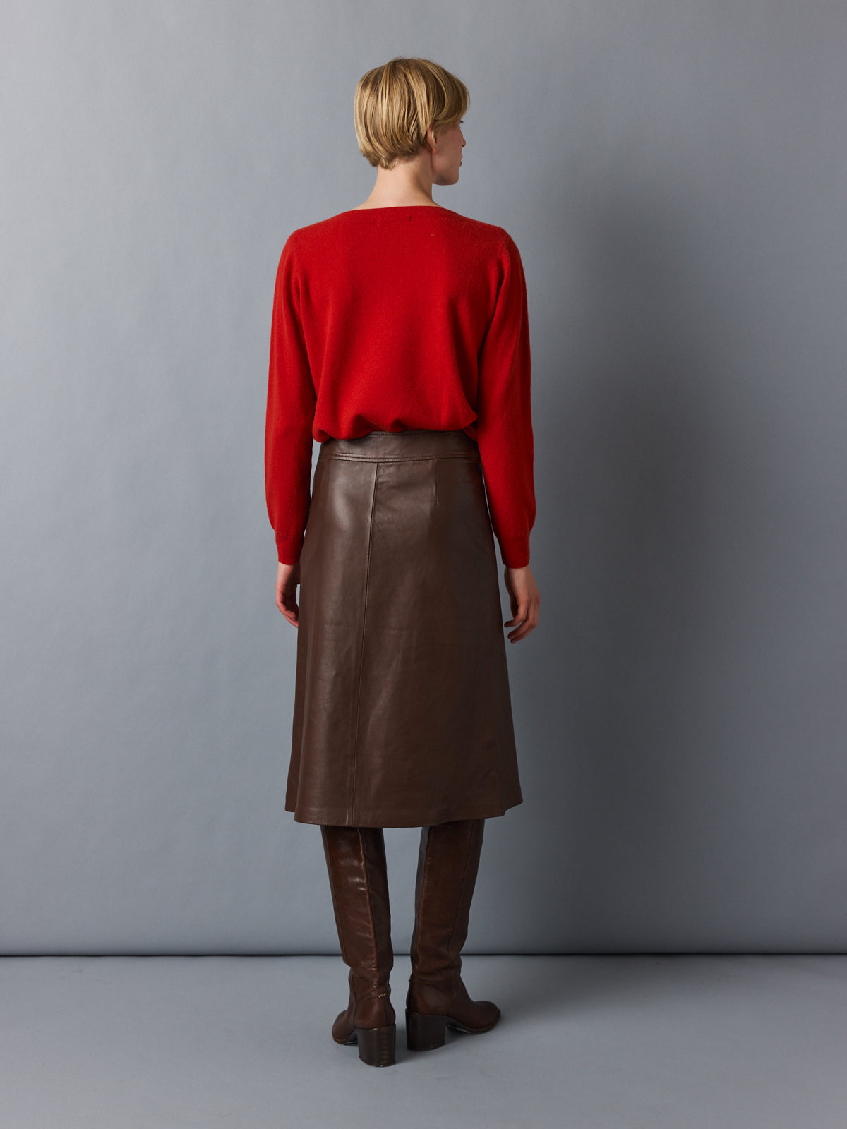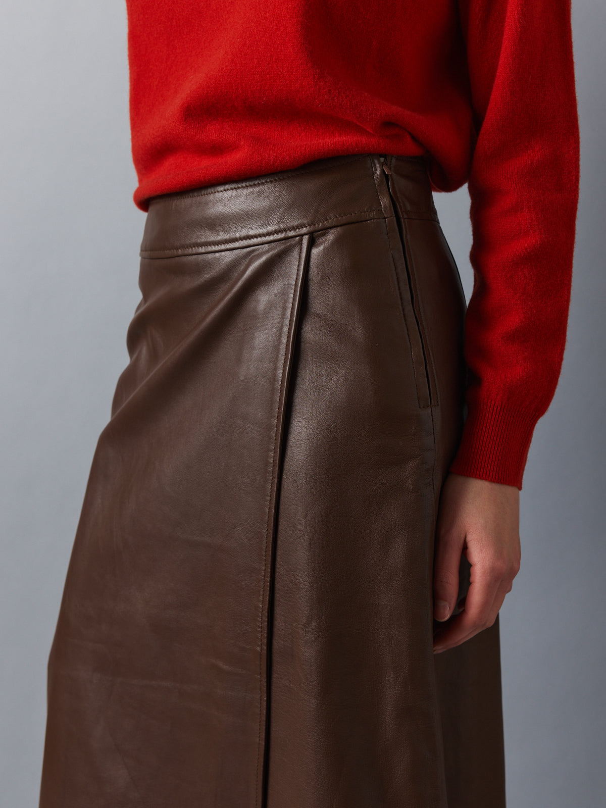 This A-line skirt in sturdy brown cow leather is designed to wear midi length and with a high waist. It features a asymmetric front closure with a side zip. Made in India.