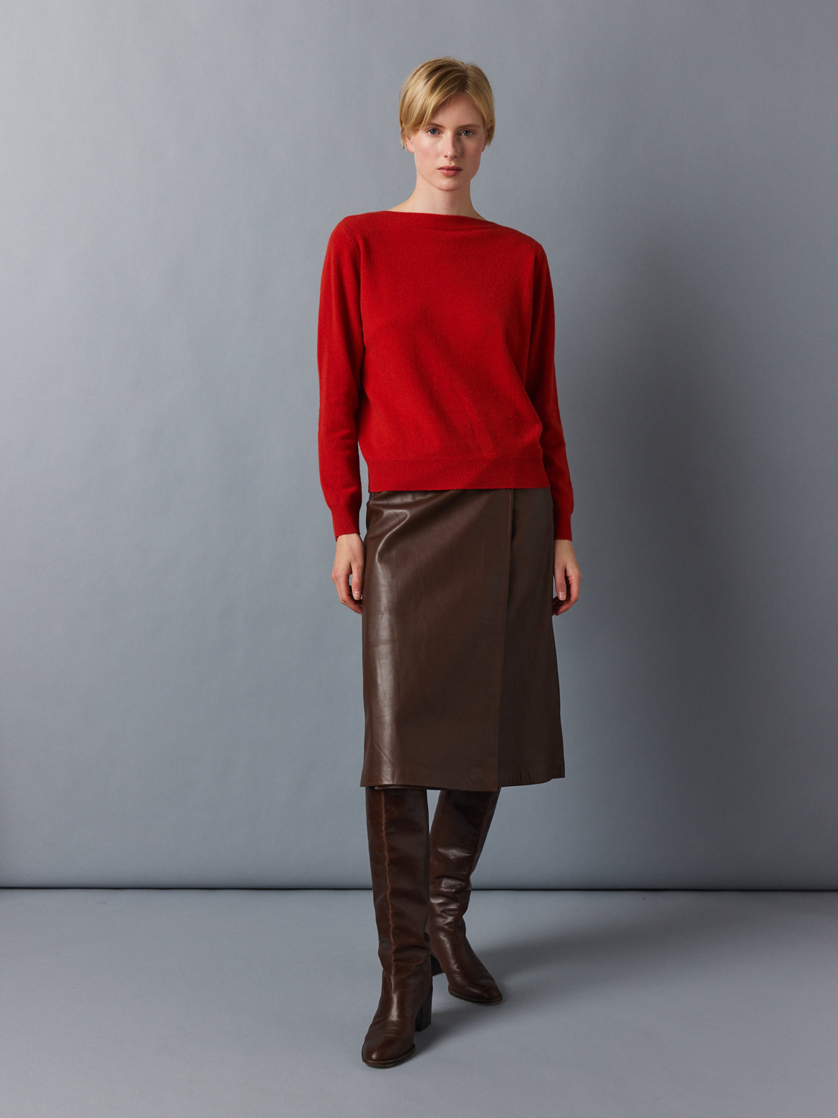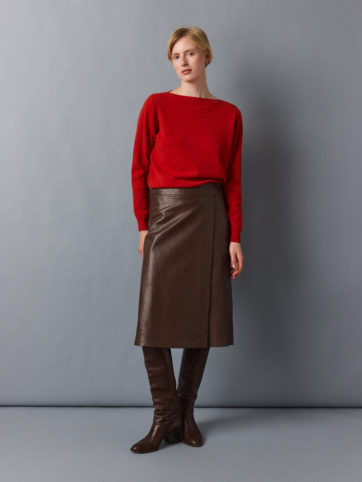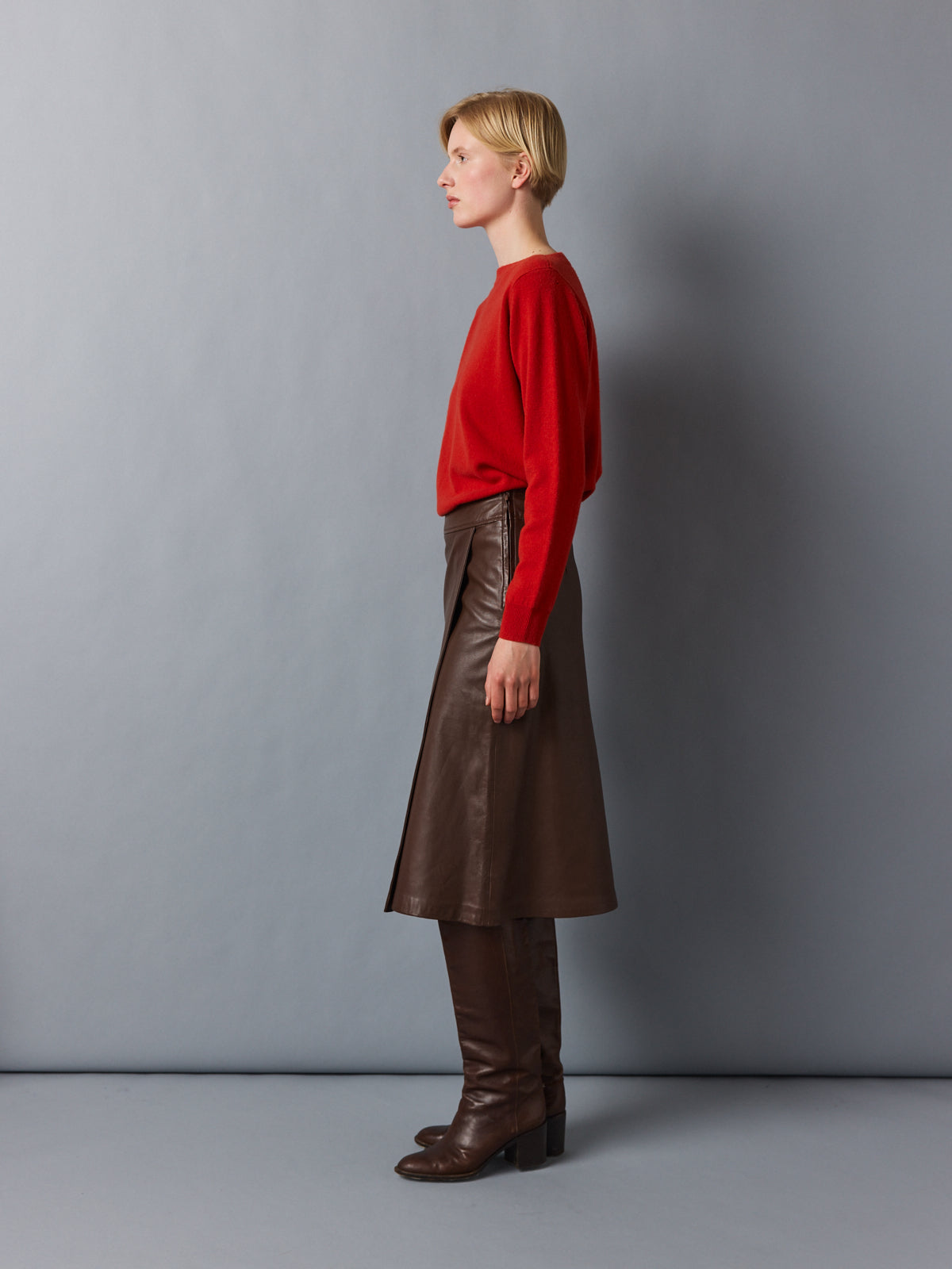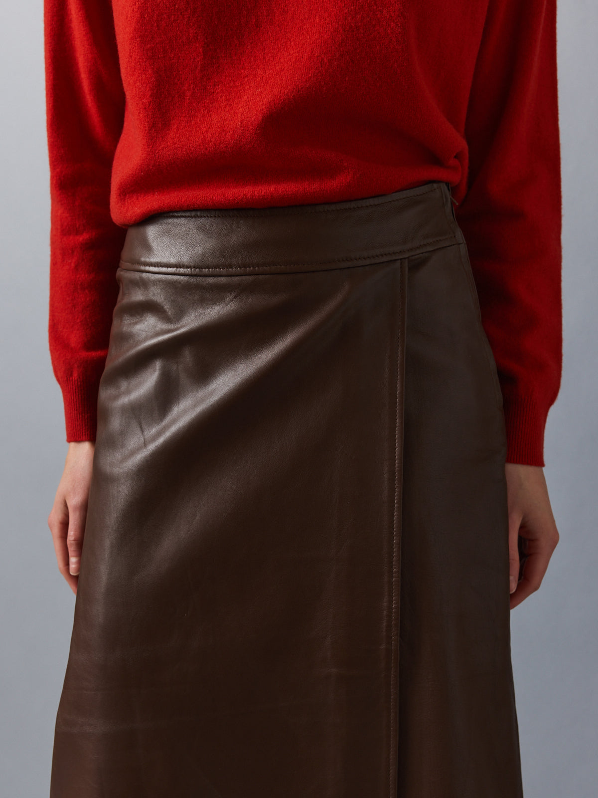 This A-line skirt in sturdy brown cow leather is designed to wear midi length and with a high waist. It features a asymmetric front closure with a side zip. Made in India.