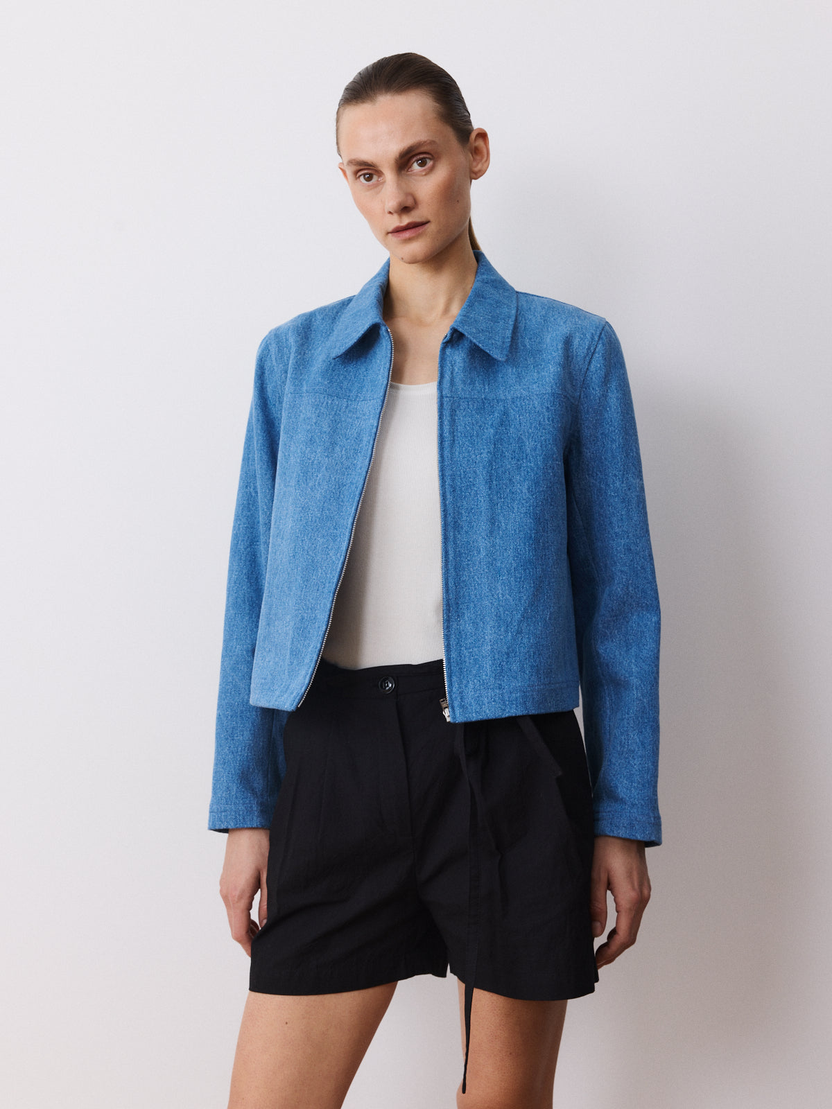 A fun take on the tailored summer jacket, this cropped style is cut from a heavy cotton denim in mid-blue with a pronounced twill and visible white grain. It features a straight fit, generous shirt collar, zip fastening and zip details at the sleeves.