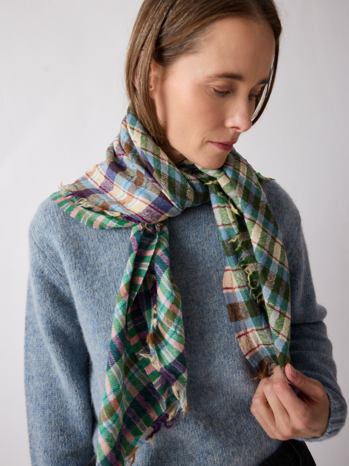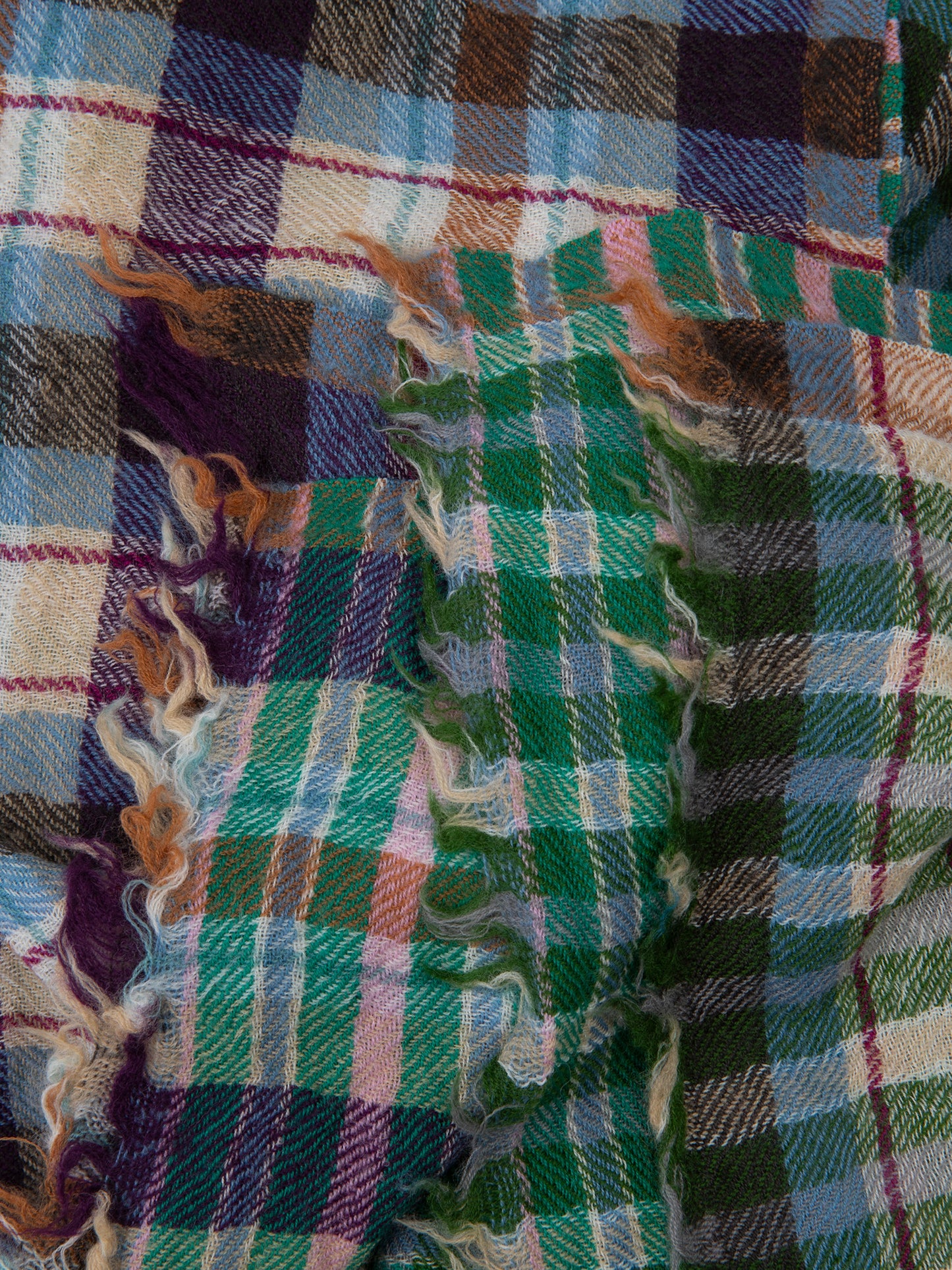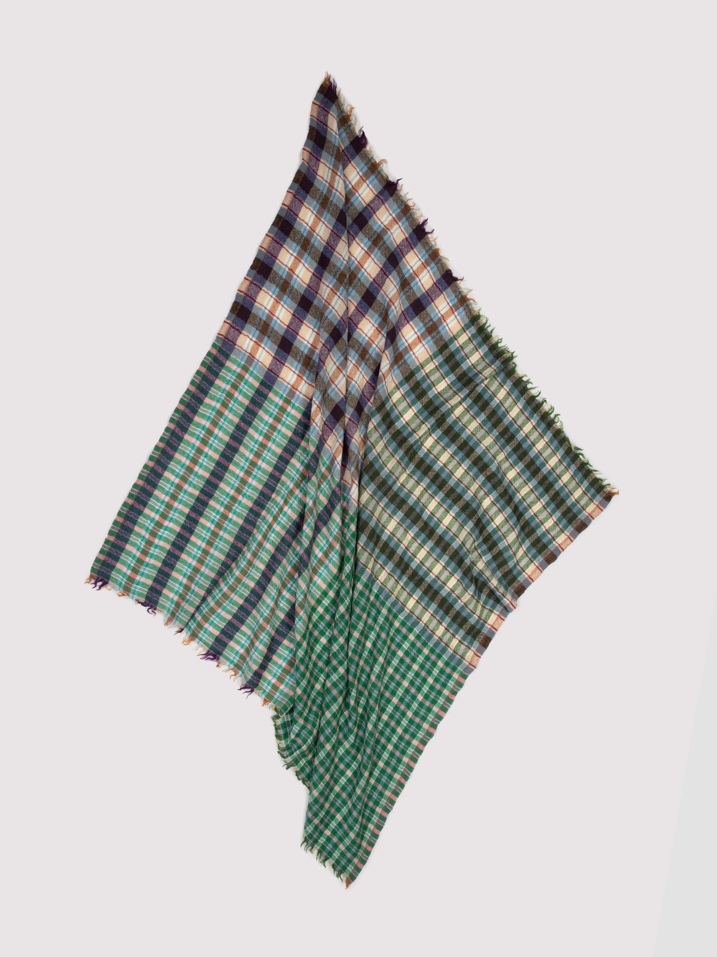 A fresh interpretation of the check scarf, designed with an ageless duotone pattern in layered checks. Green takes the lead as the most visible overtone, interwoven with salmon, purple, brown, and light blue for subtle depth. Ribbed edges add texture.