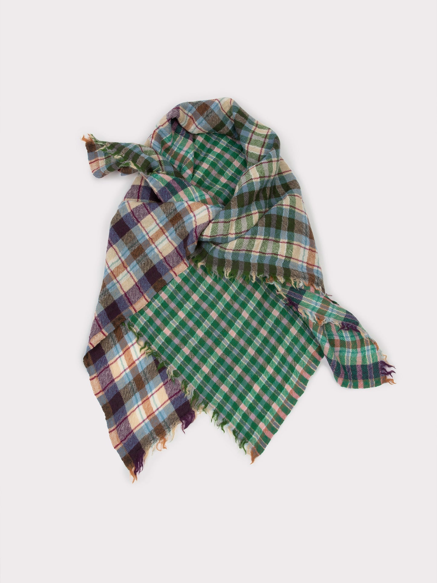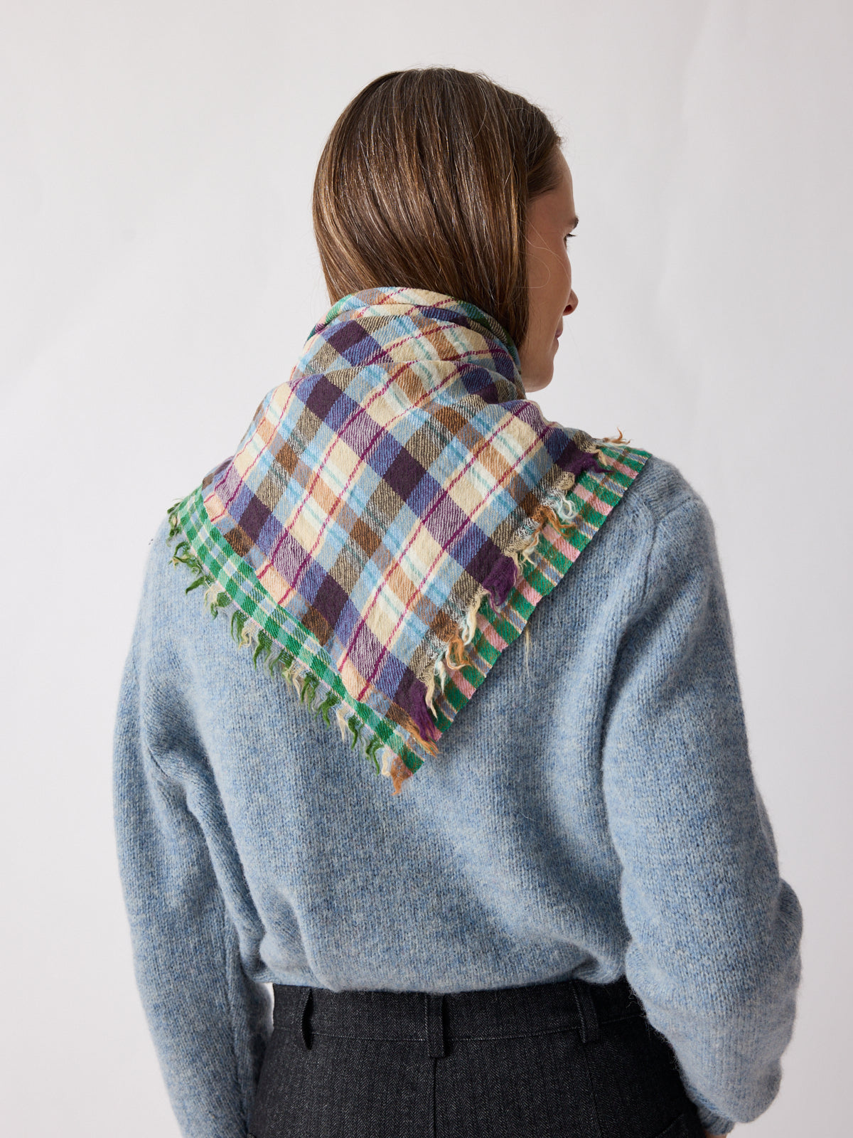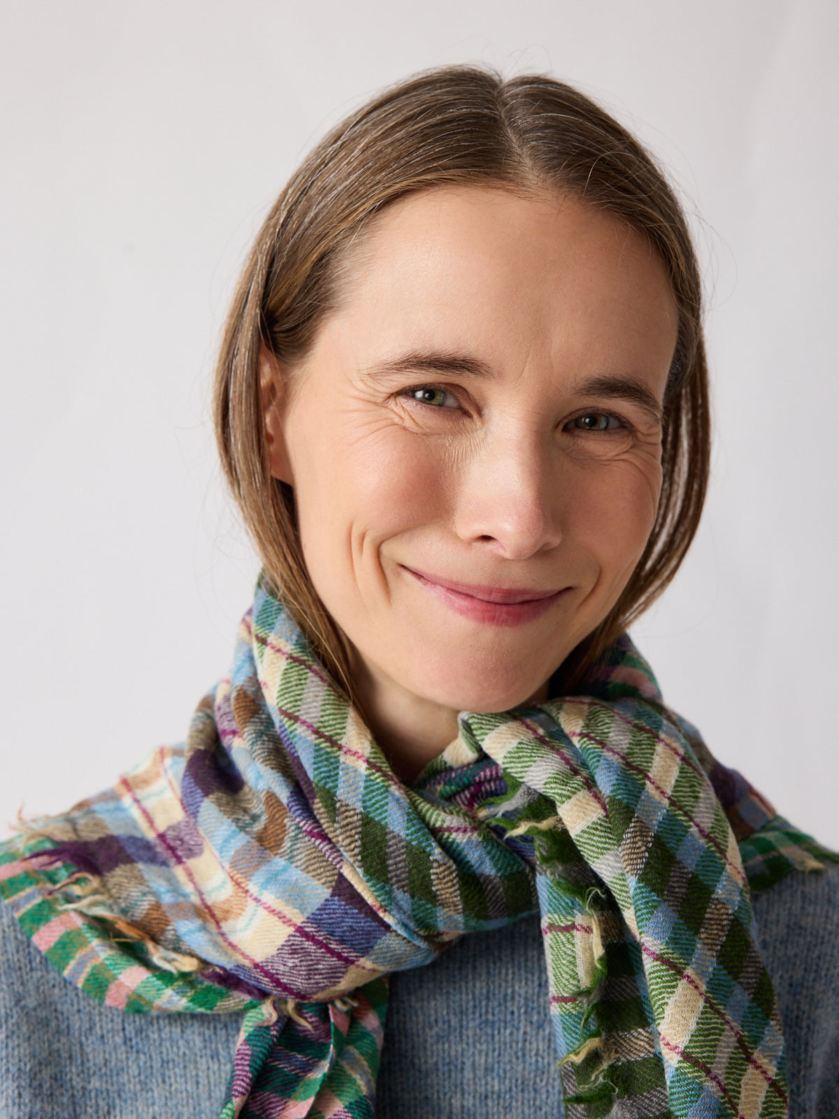 A fresh interpretation of the check scarf, designed with an ageless duotone pattern in layered checks. Green takes the lead as the most visible overtone, interwoven with salmon, purple, brown, and light blue for subtle depth. Ribbed edges add texture.