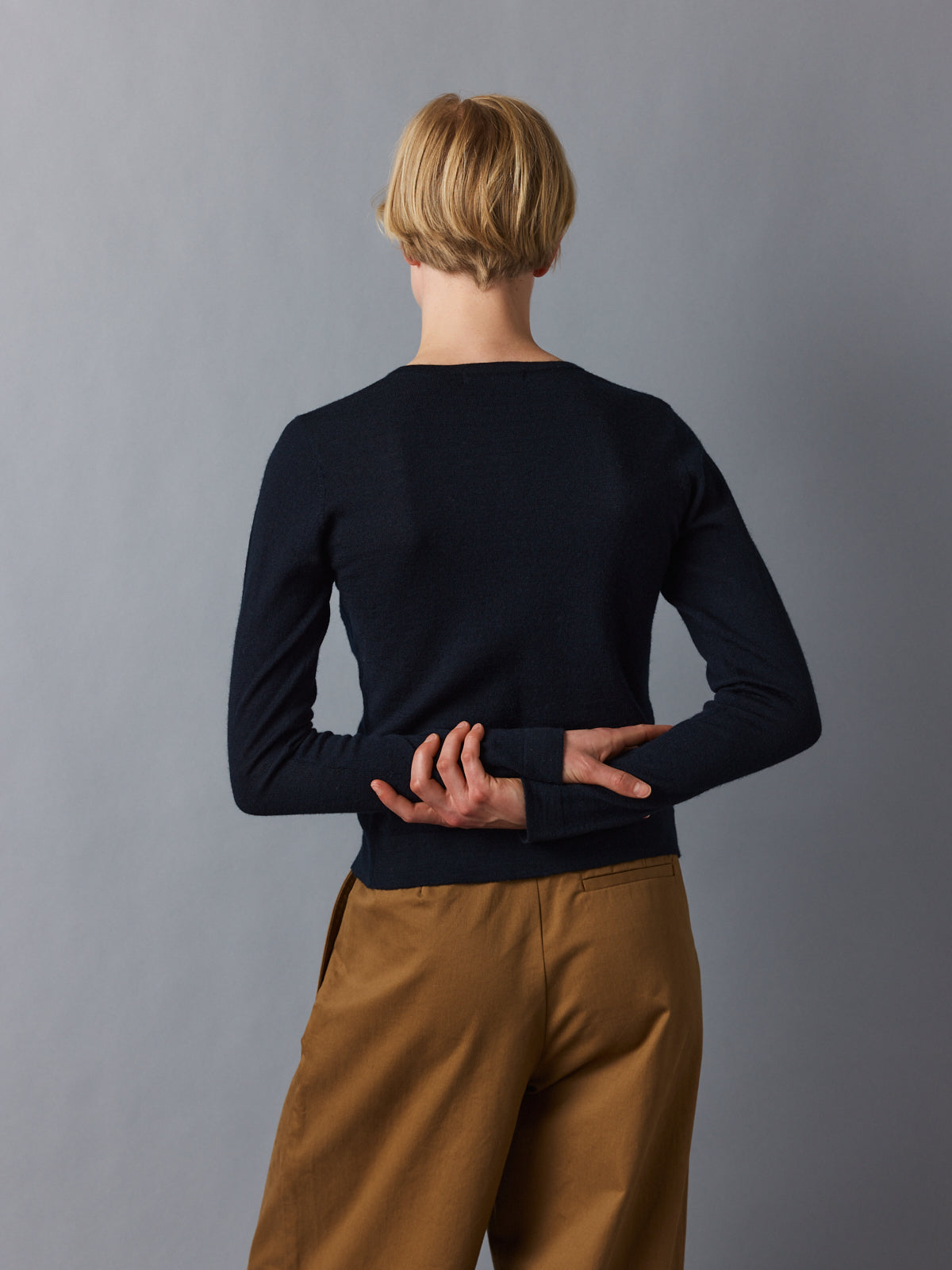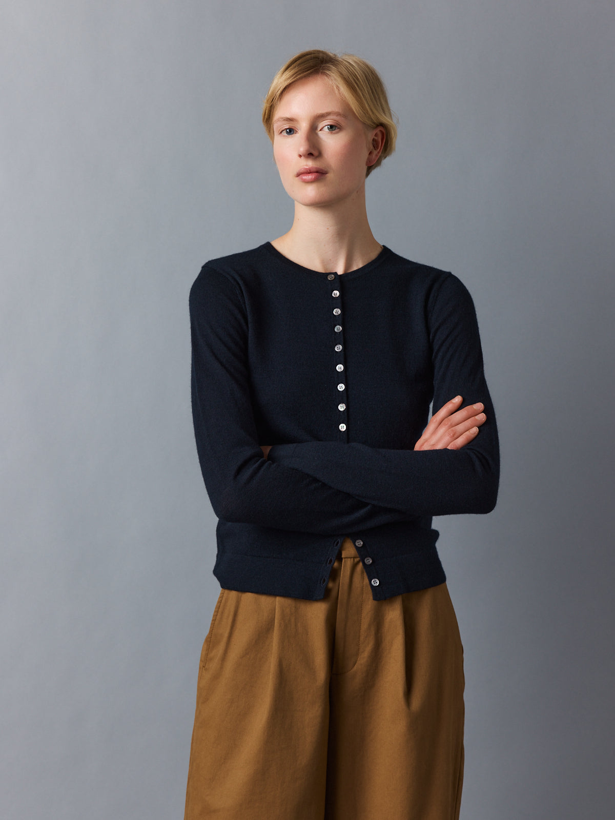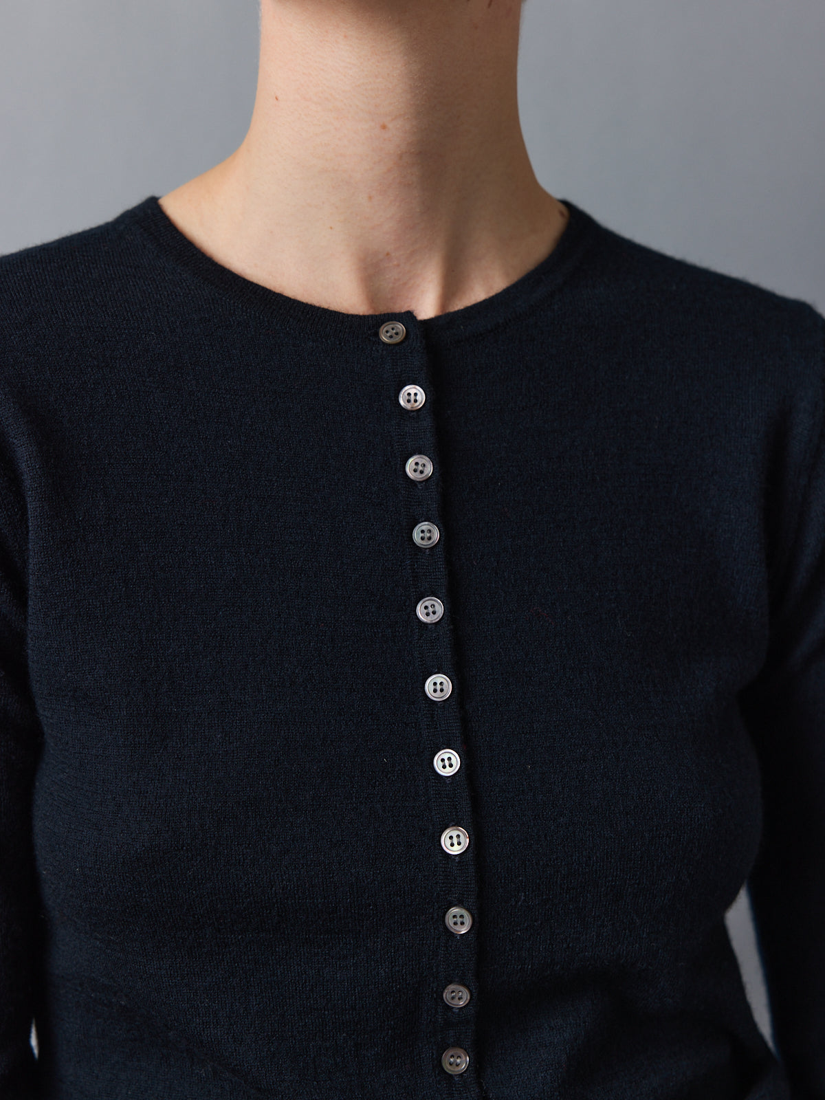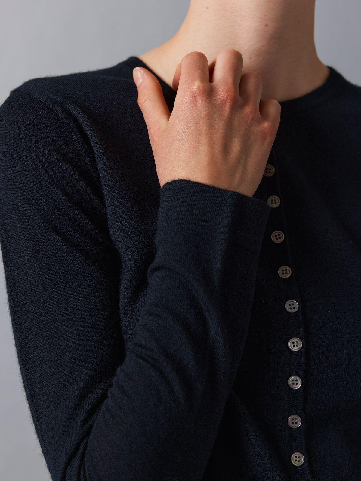 With its closely spaced buttons adding a romantic touch, this deep navy cardigan is crafted in fine 100% merino wool. Designed for a close-to-the-body fit, it features a crew neck, long sleeves, and slightly fitted waistband, creating a refined, considered silhouette.