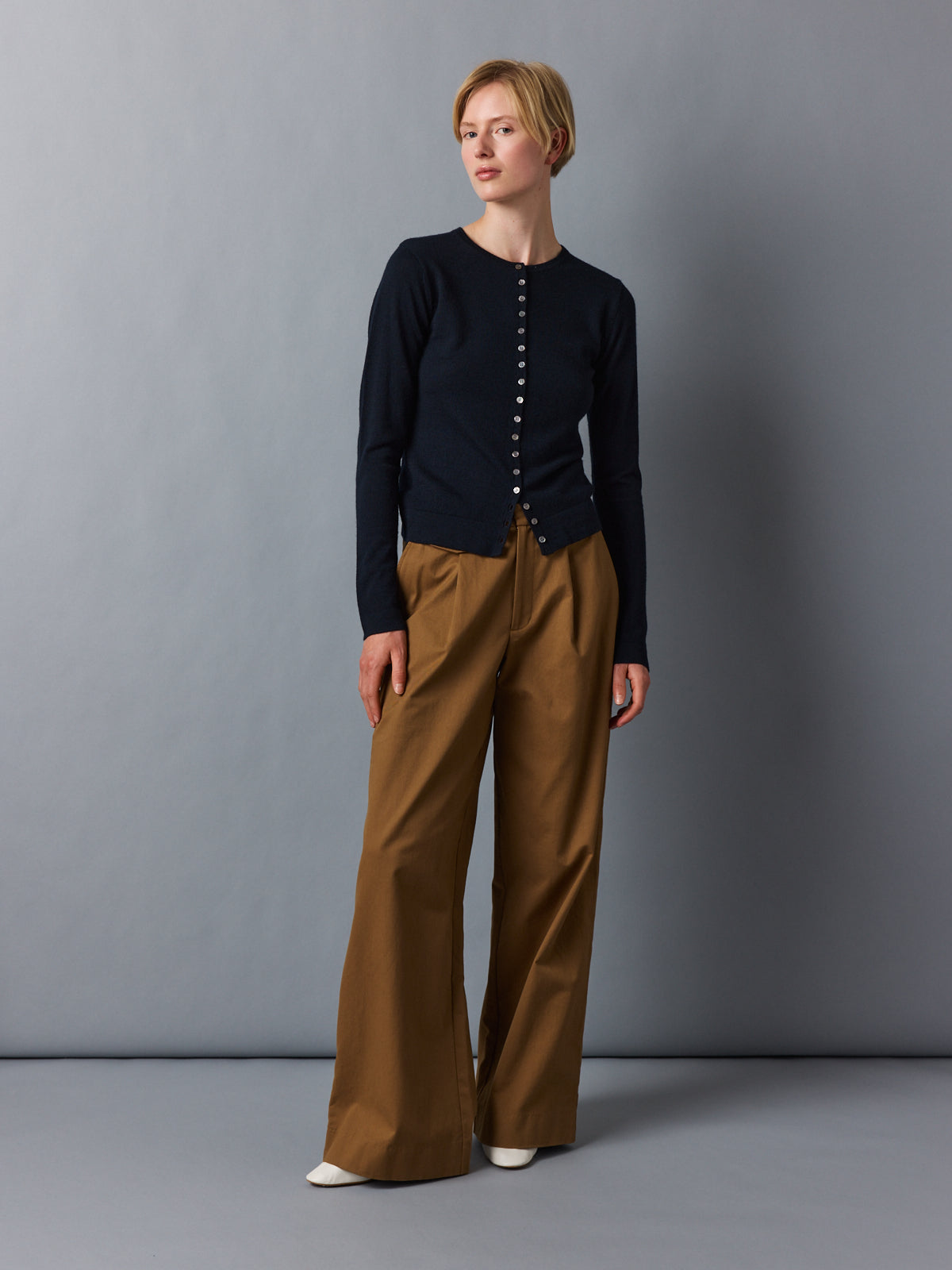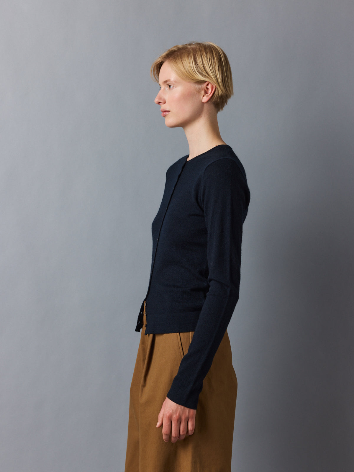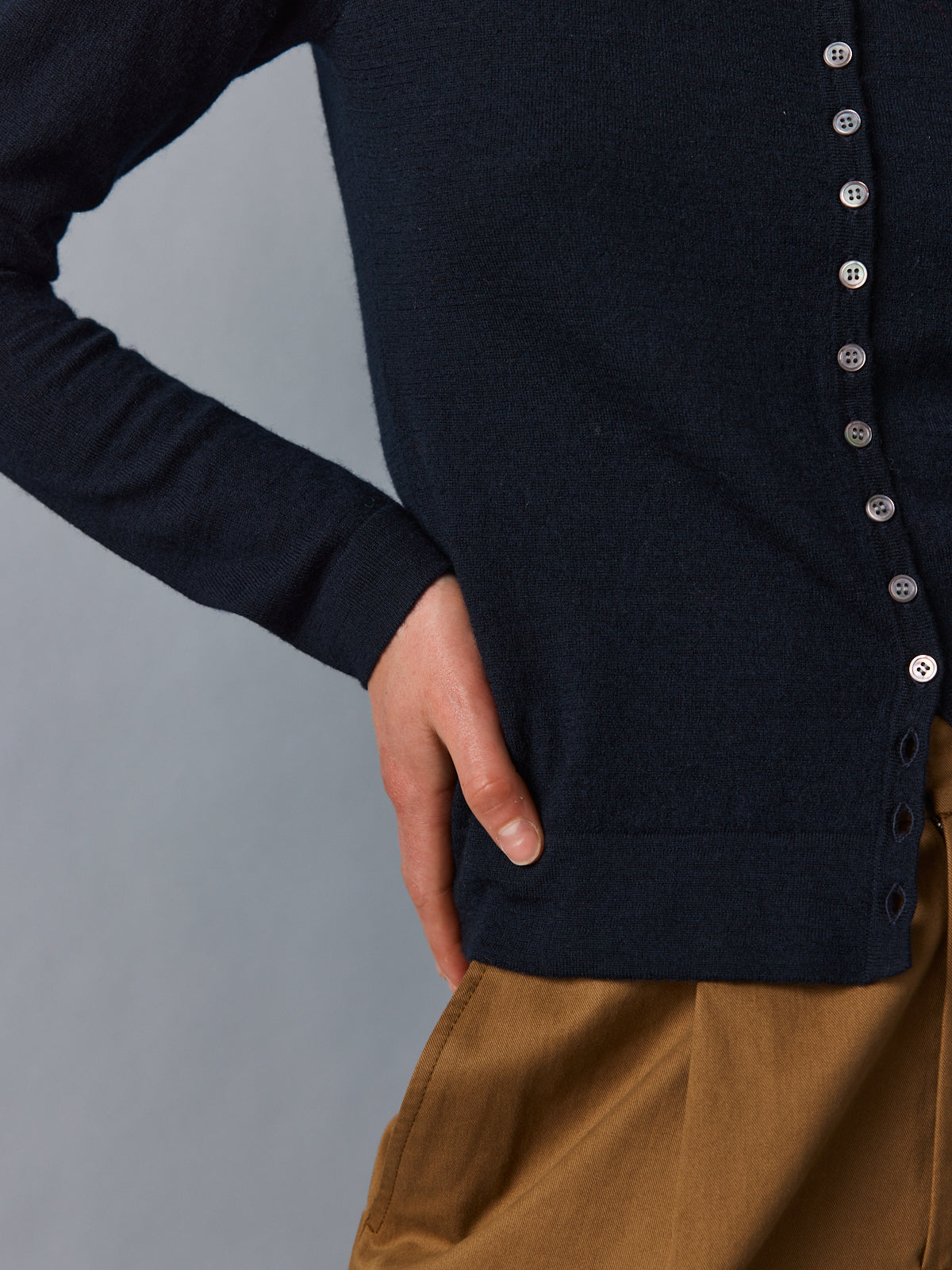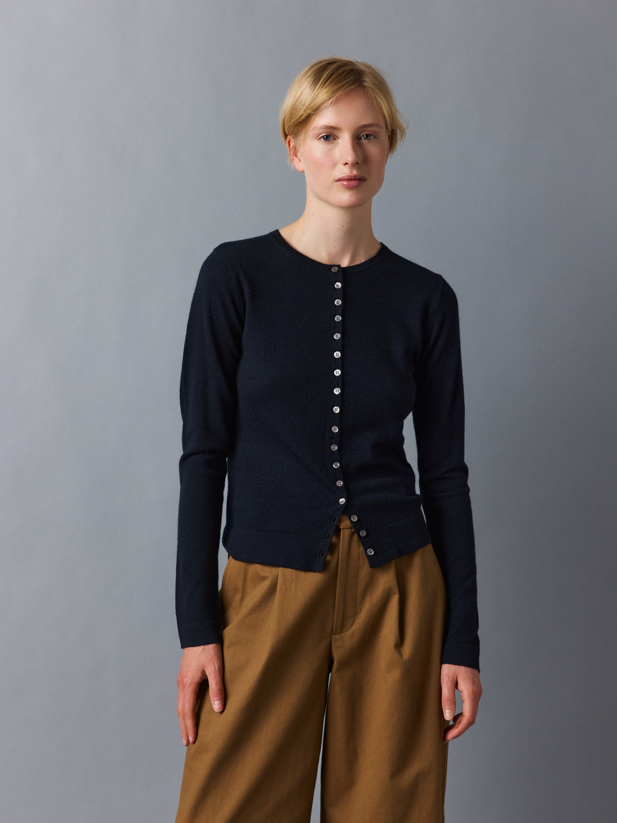 With its closely spaced buttons adding a romantic touch, this deep navy cardigan is crafted in fine 100% merino wool. Designed for a close-to-the-body fit, it features a crew neck, long sleeves, and slightly fitted waistband, creating a refined, considered silhouette.