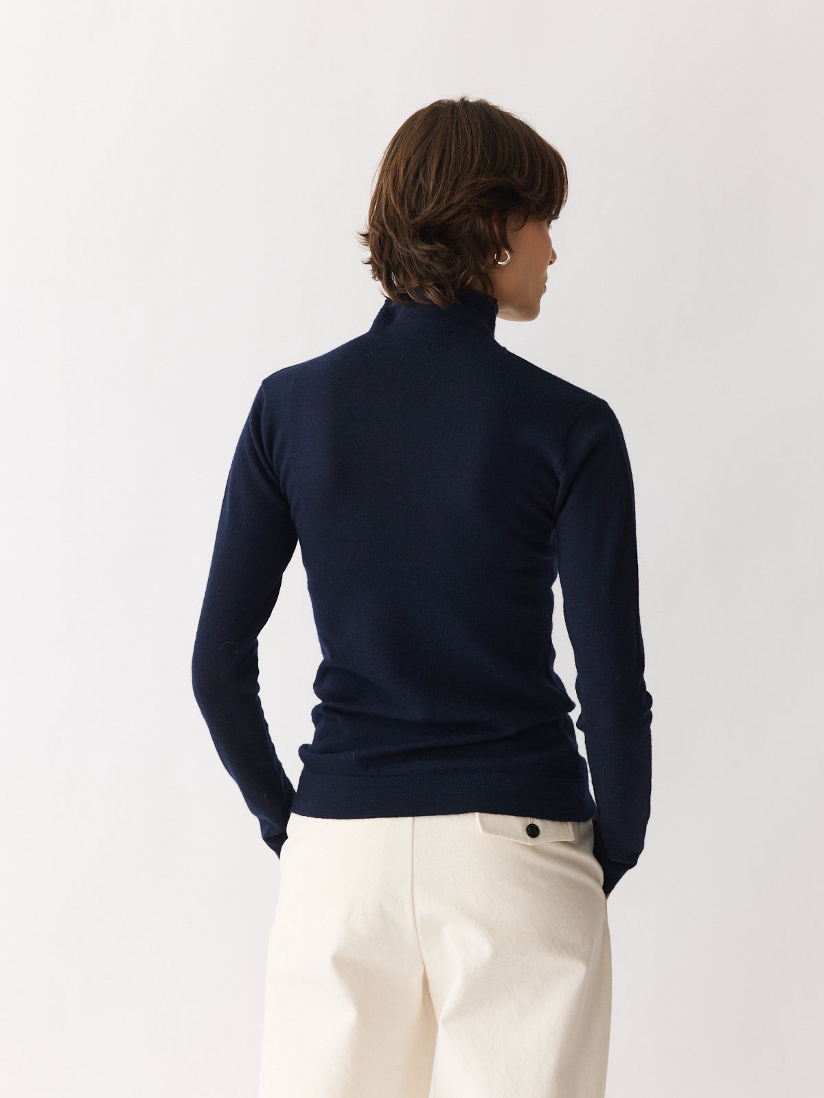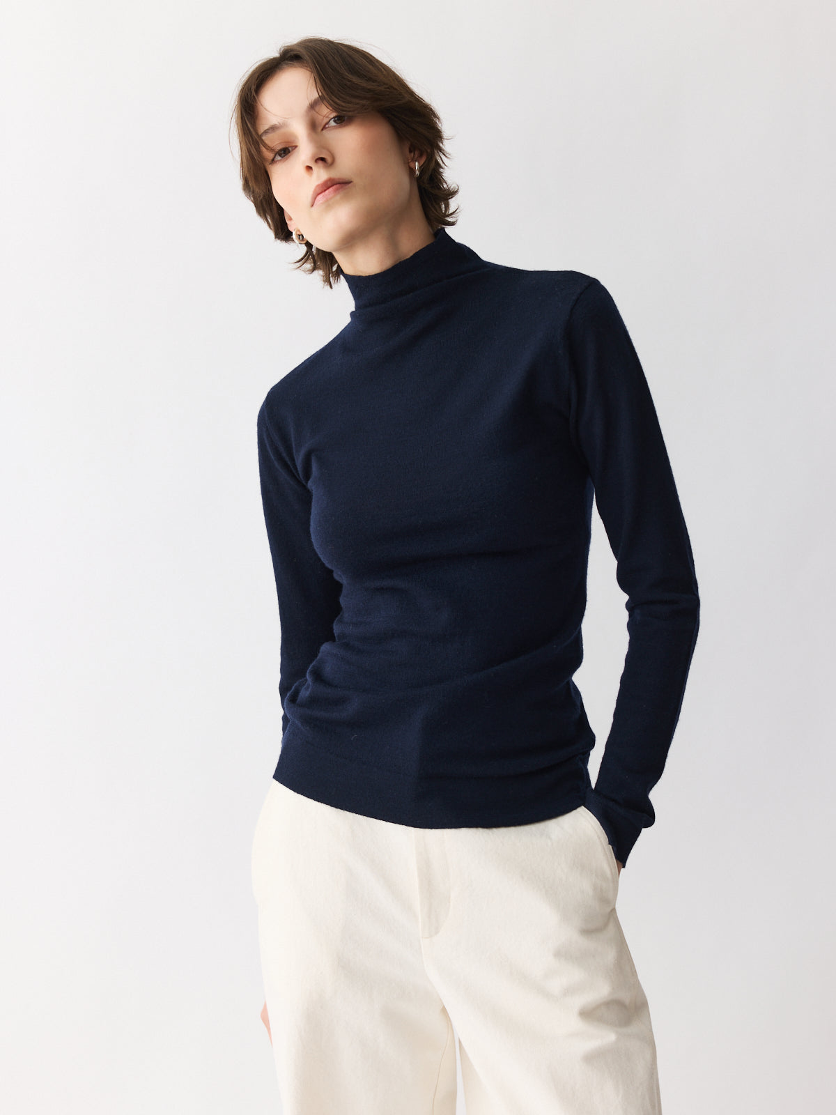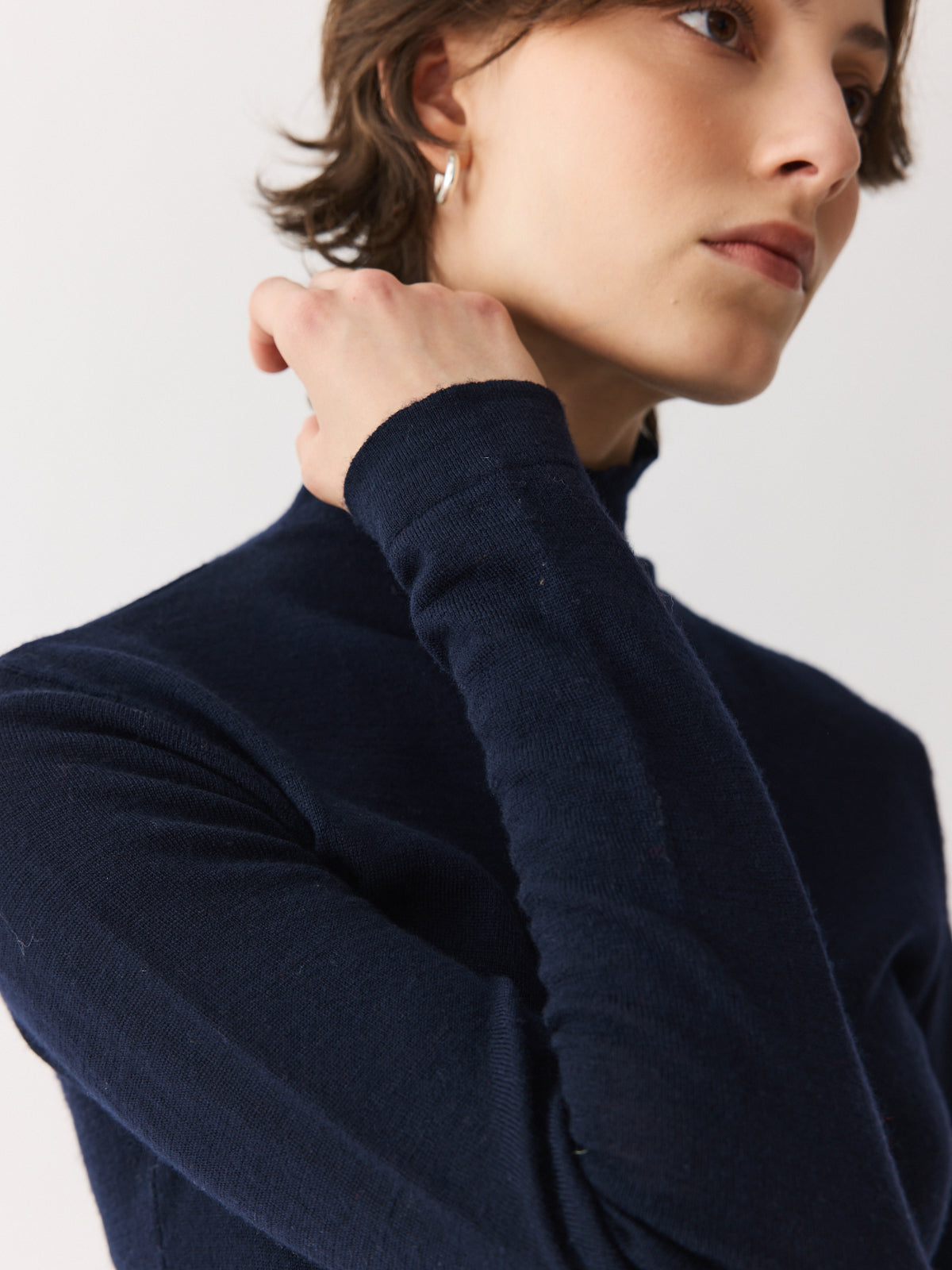 A refined seasonal essential, this fitted mock neck sweater is crafted in fine 100% merino wool in deep navy. Soft against the skin, it features long sleeves, neatly fitted shoulders, and a sleek silhouette, making it the perfect layer for everyday dressing.