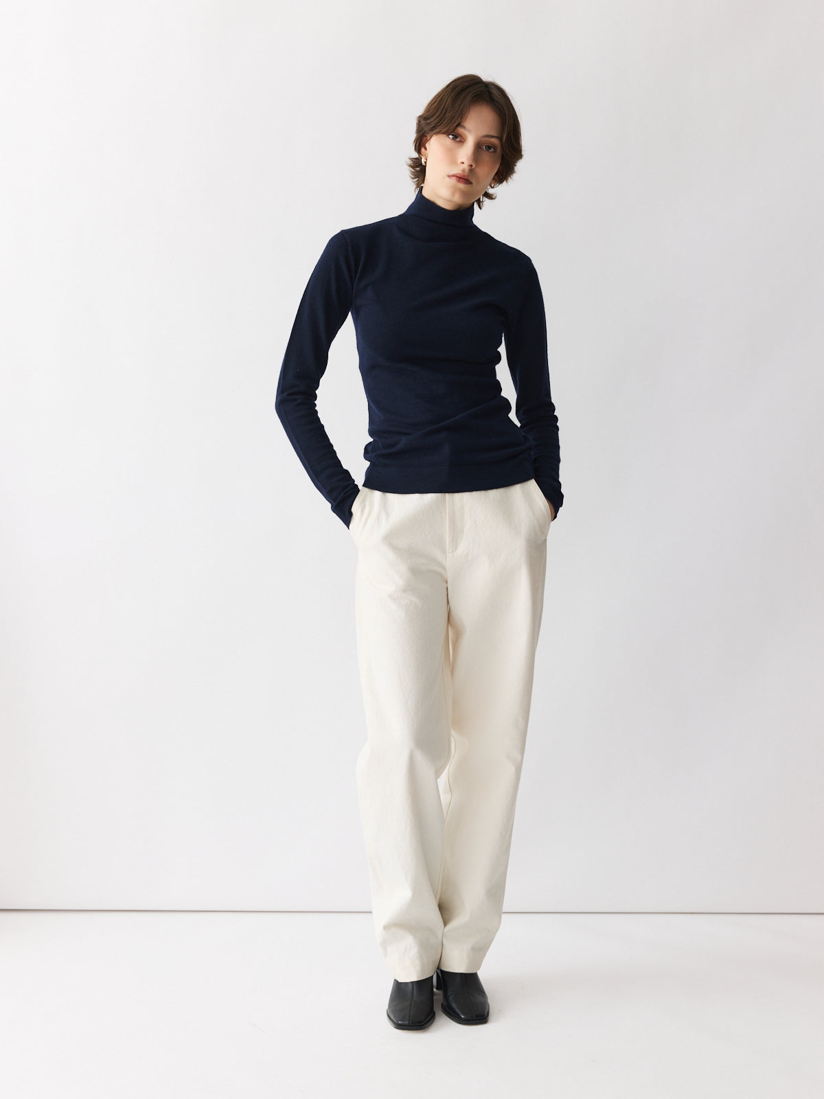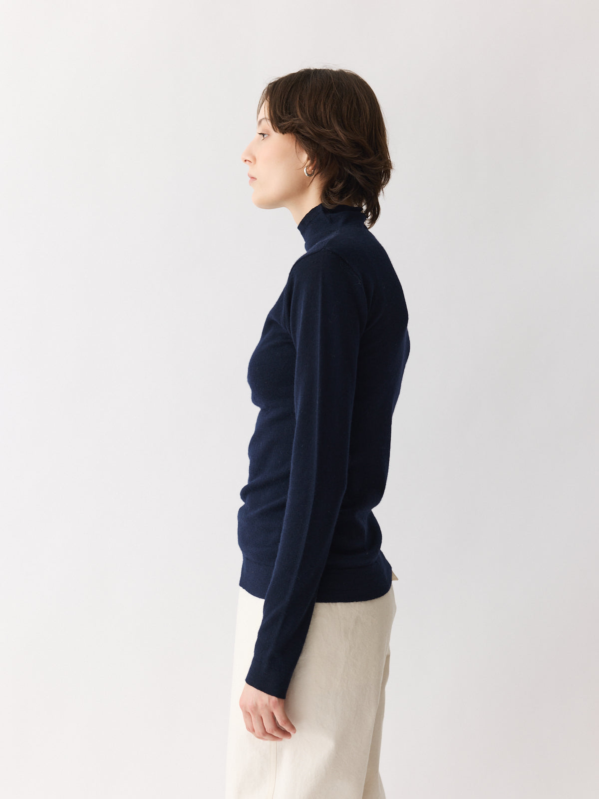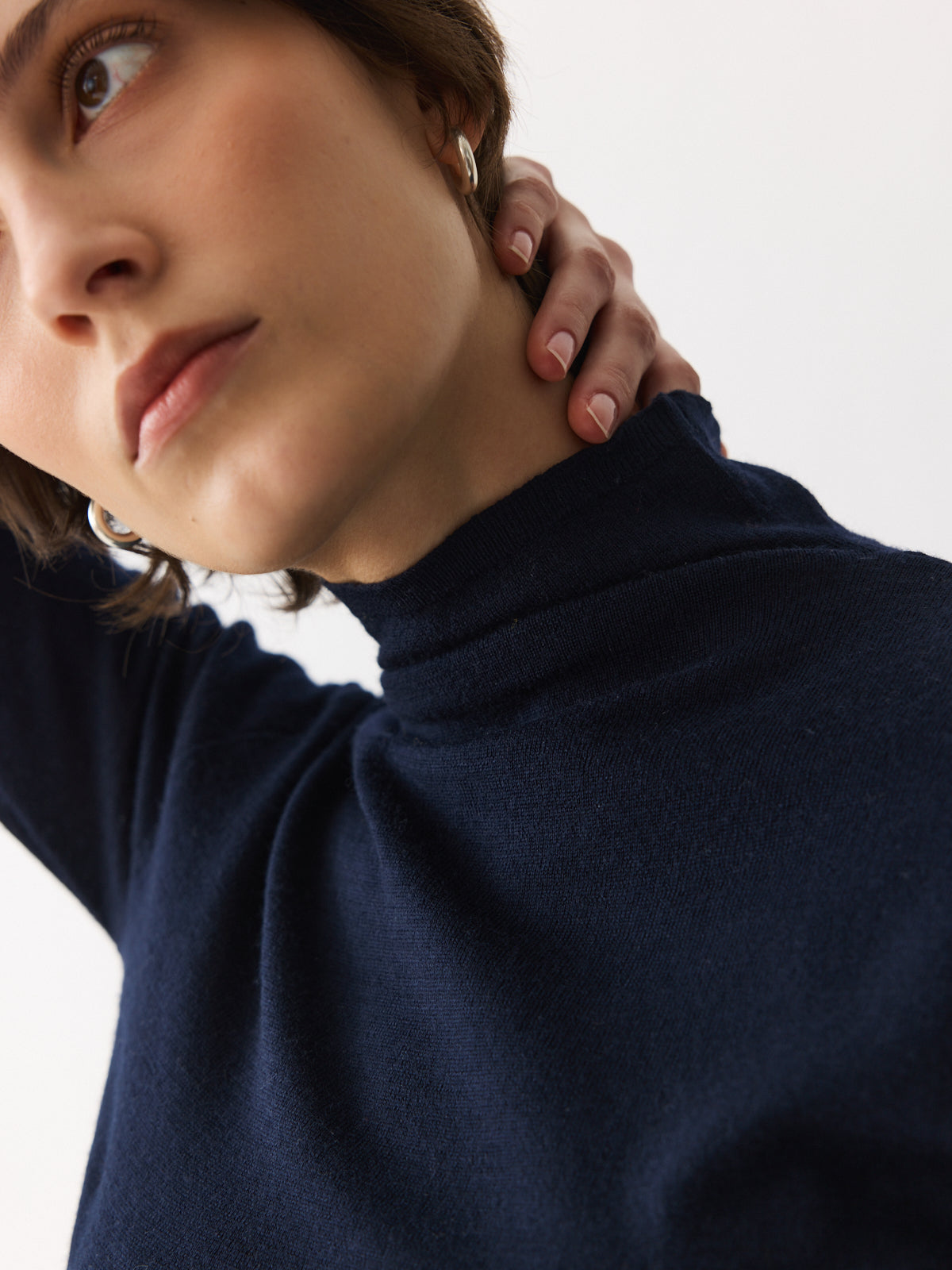 A refined seasonal essential, this fitted mock neck sweater is crafted in fine 100% merino wool in deep navy. Soft against the skin, it features long sleeves, neatly fitted shoulders, and a sleek silhouette, making it the perfect layer for everyday dressing.