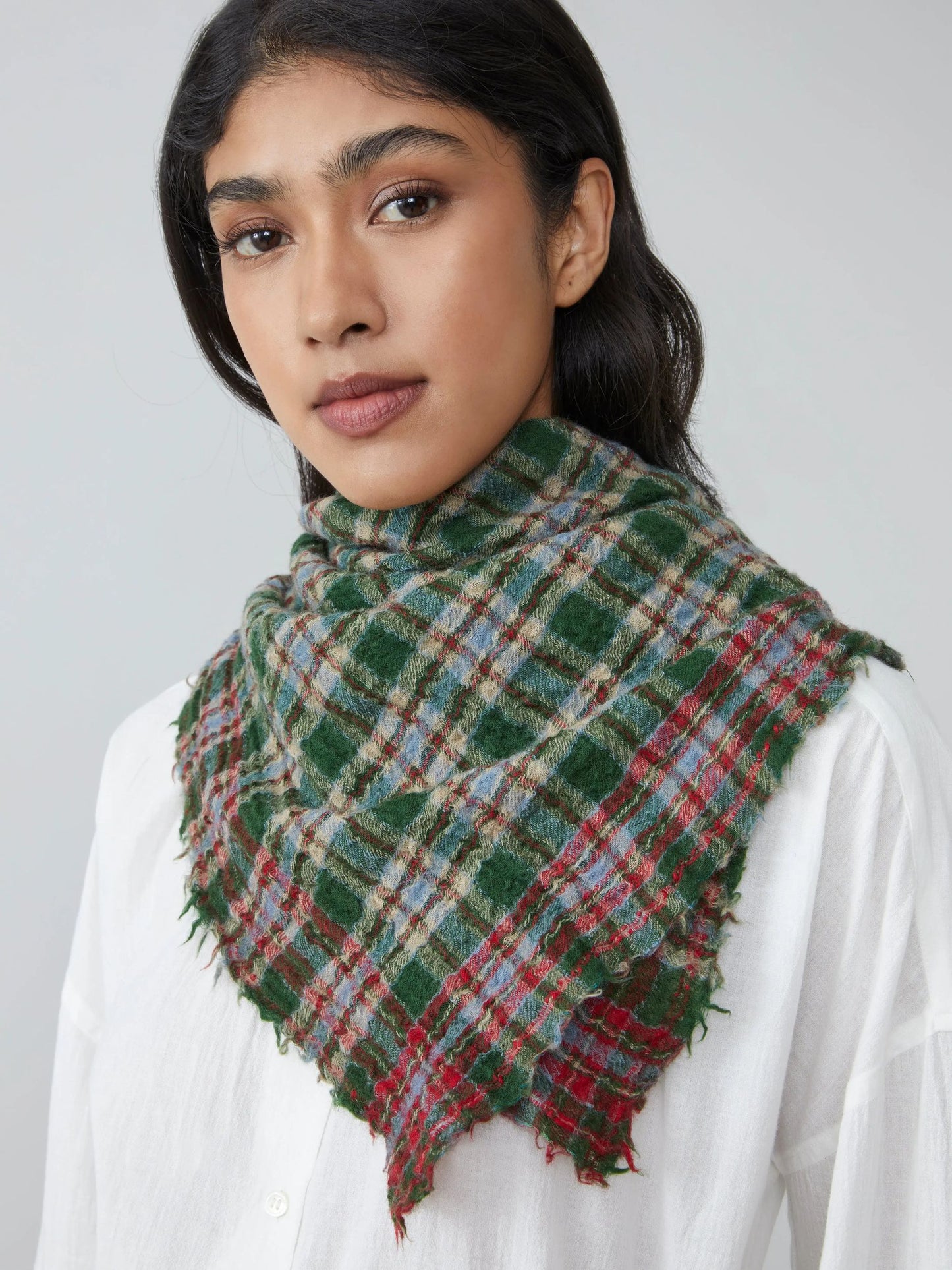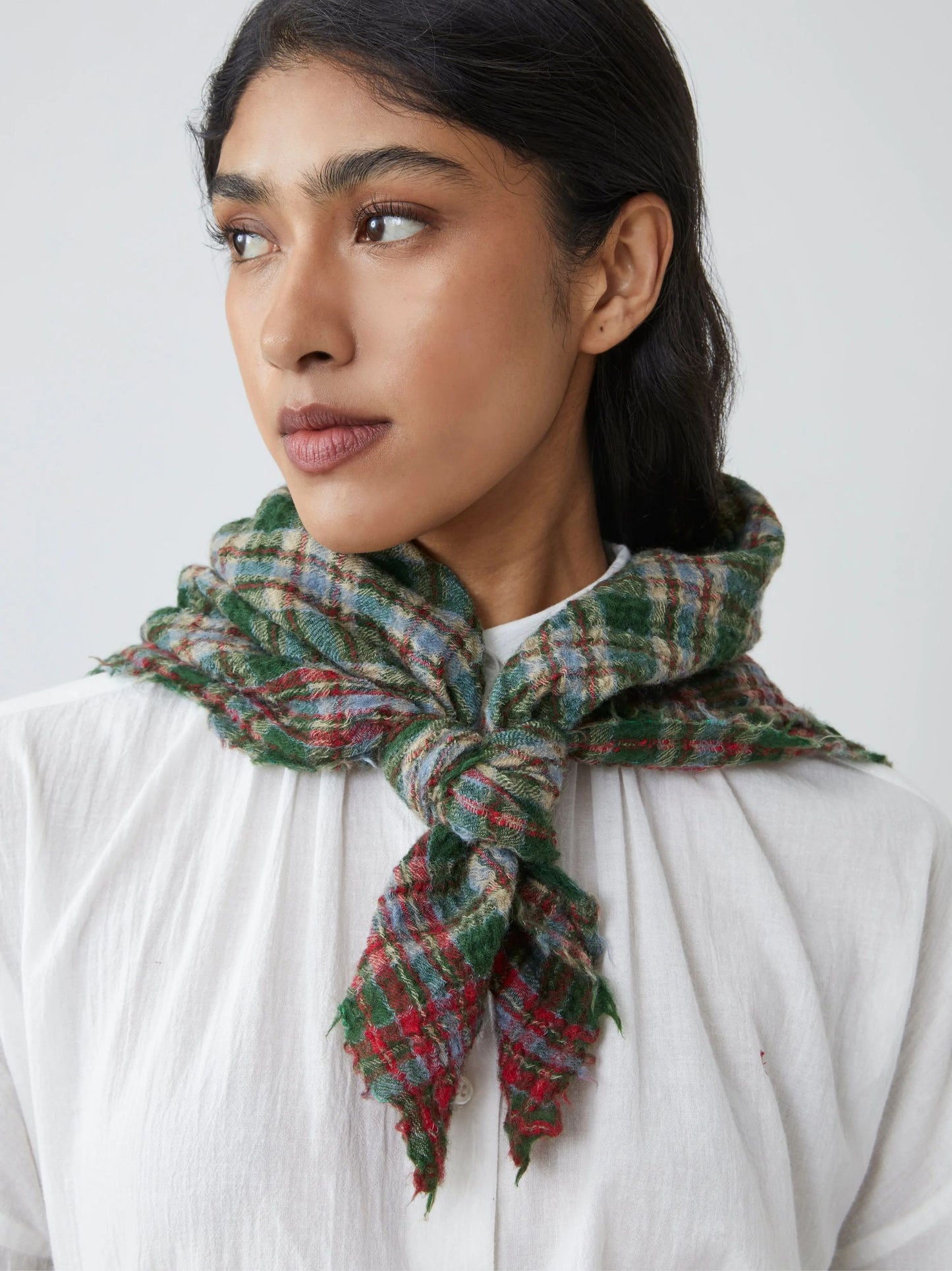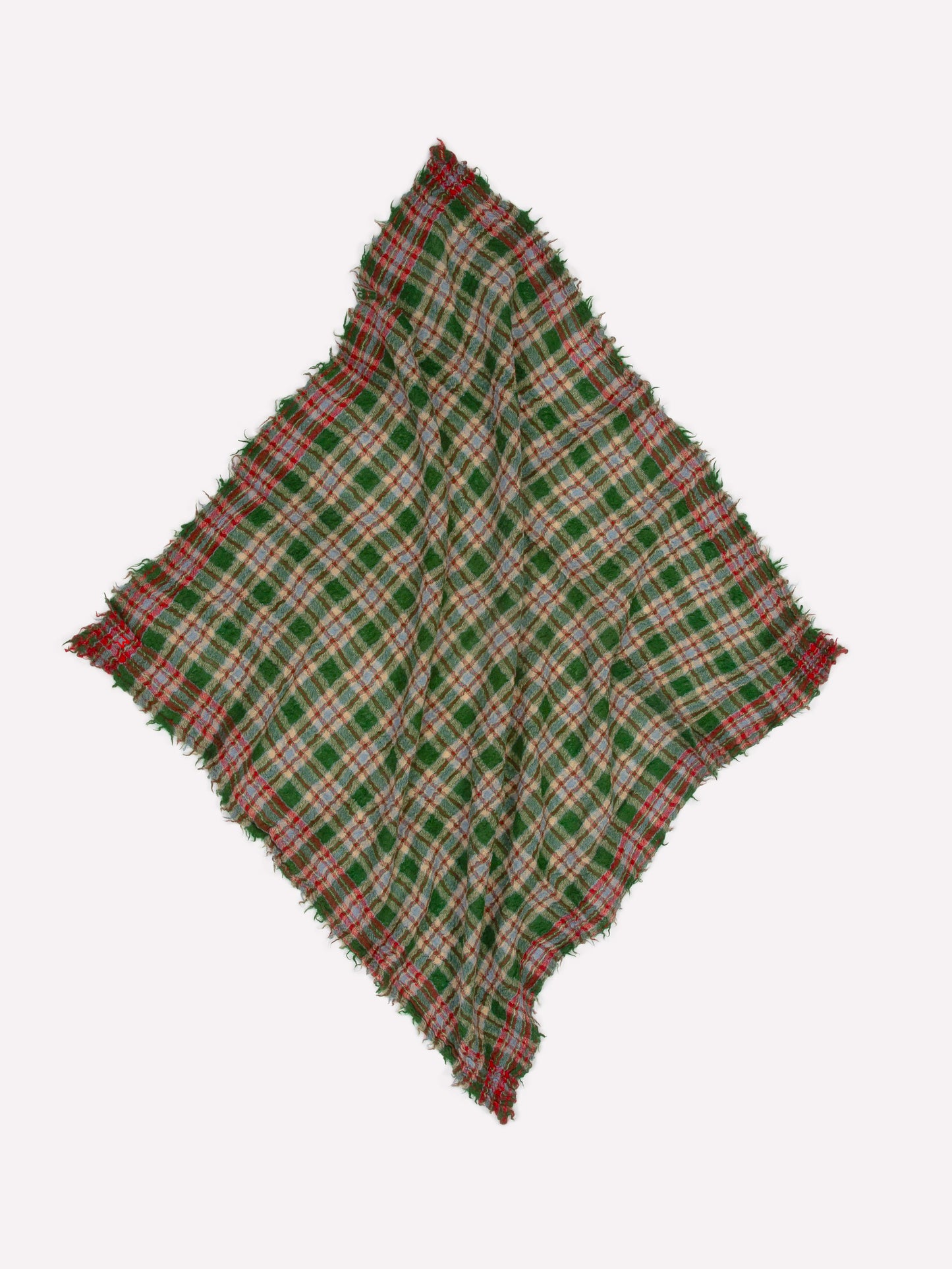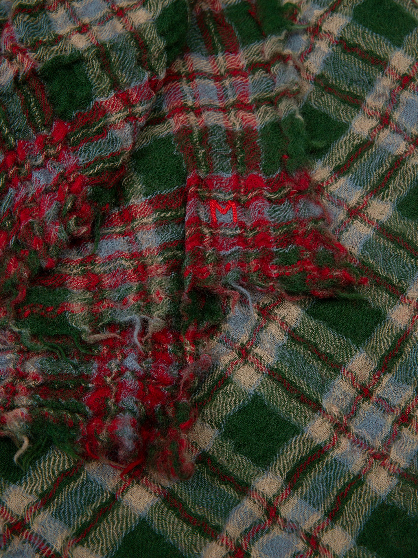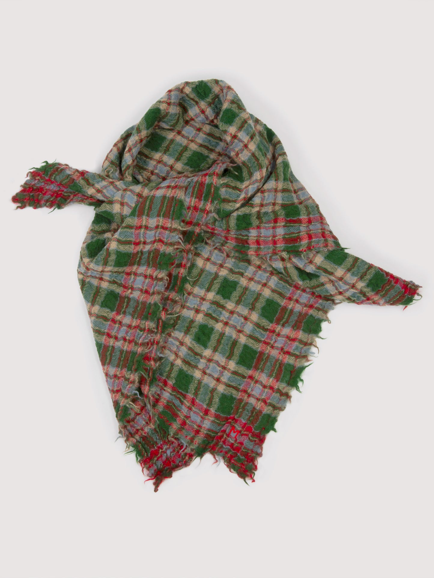 A new creation of the season, the Magda scarf N°793 reinterprets tartan with irregular, discreet checks in green, red, and light blue. Handwoven in India from fine, soft wool. The scarf is enriched by delicate fringed edges.