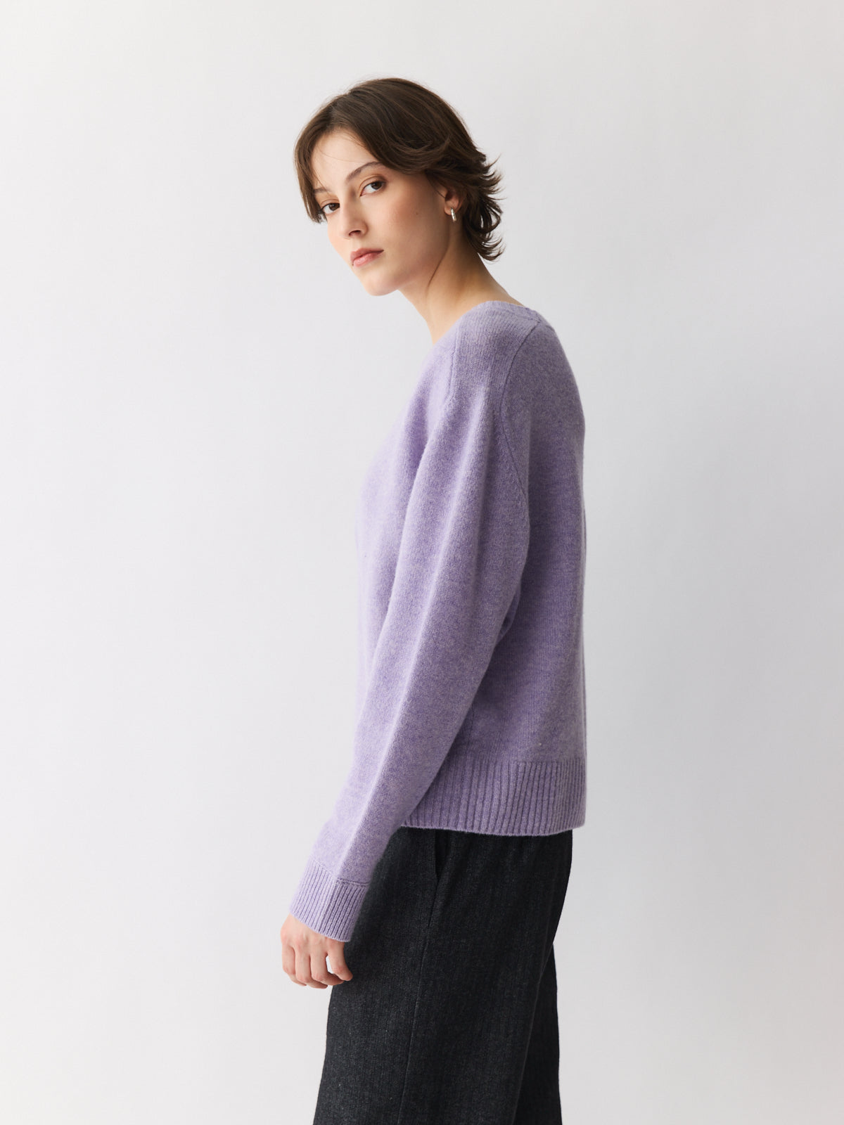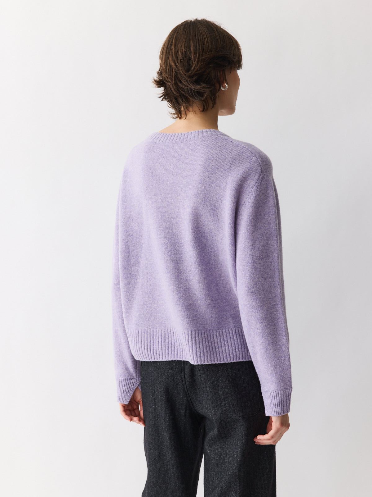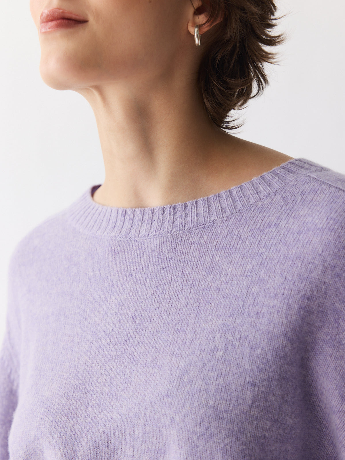 A good winter basic in bright light luminous purple, this loose-fit sweater is knitted from thick extrafine merino wool for warmth and softness. Featuring a generous round neckline, long sleeves, and dropped shoulders, it offers everyday ease in a fun hue. Pair with the matching Gal mittens.