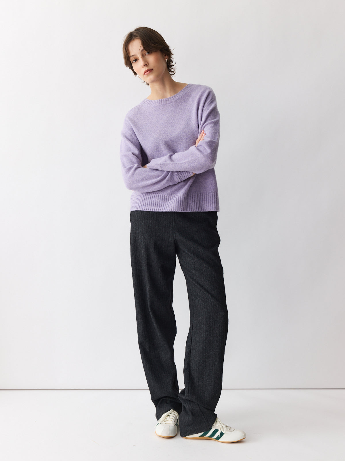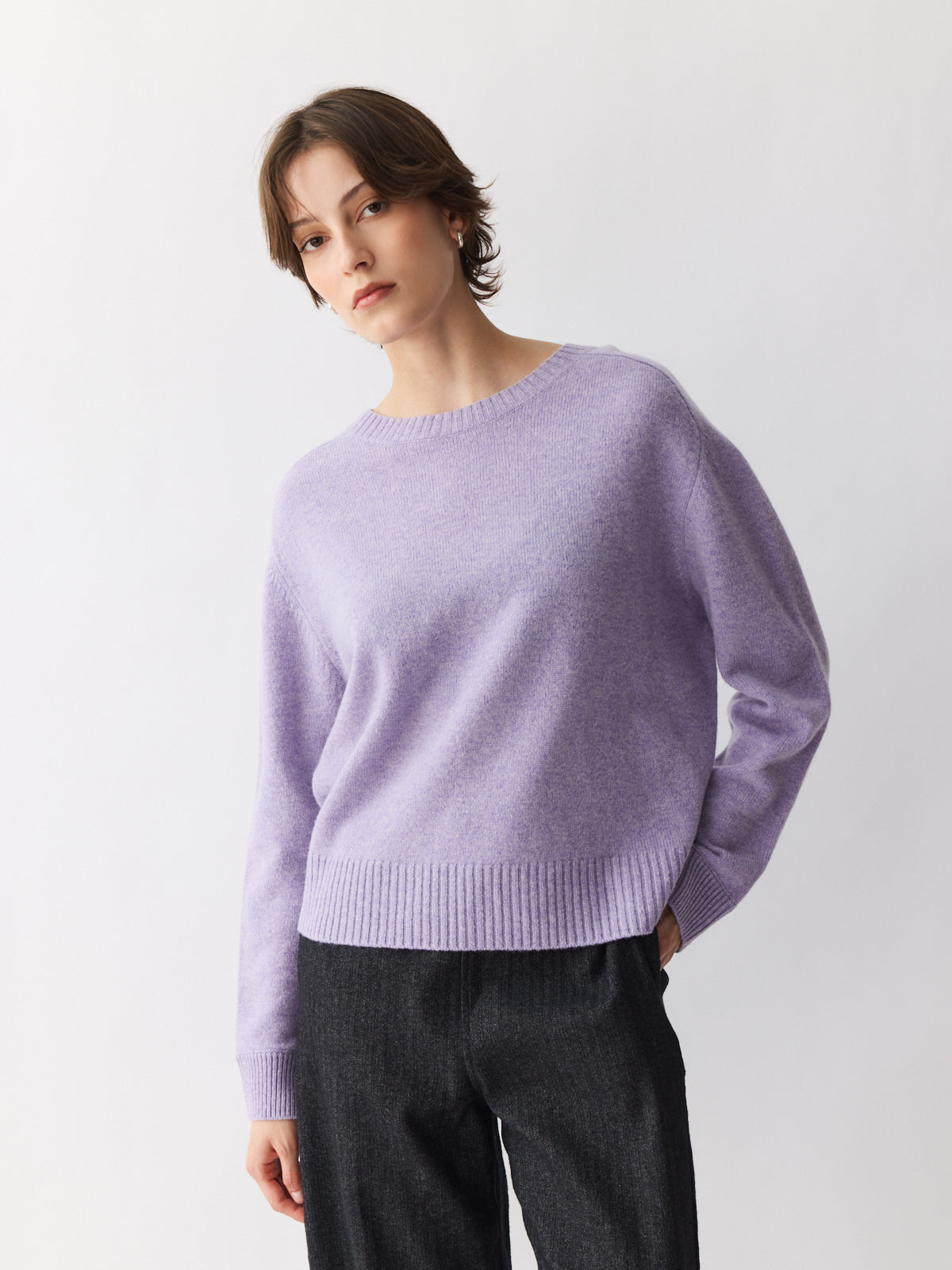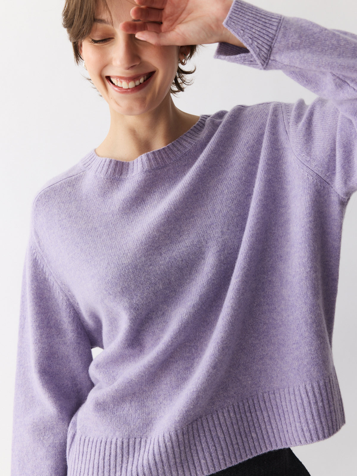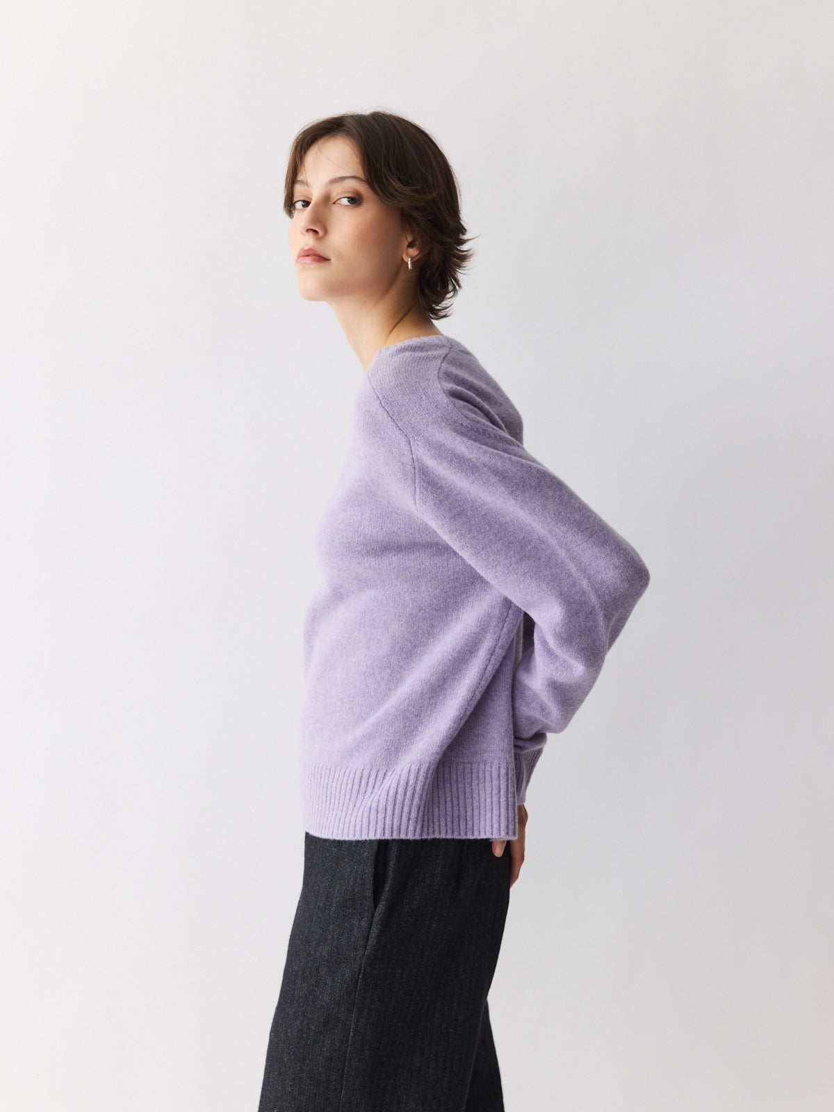 A good winter basic in bright light luminous purple, this loose-fit sweater is knitted from thick extrafine merino wool for warmth and softness. Featuring a generous round neckline, long sleeves, and dropped shoulders, it offers everyday ease in a fun hue. Pair with the matching Gal mittens.