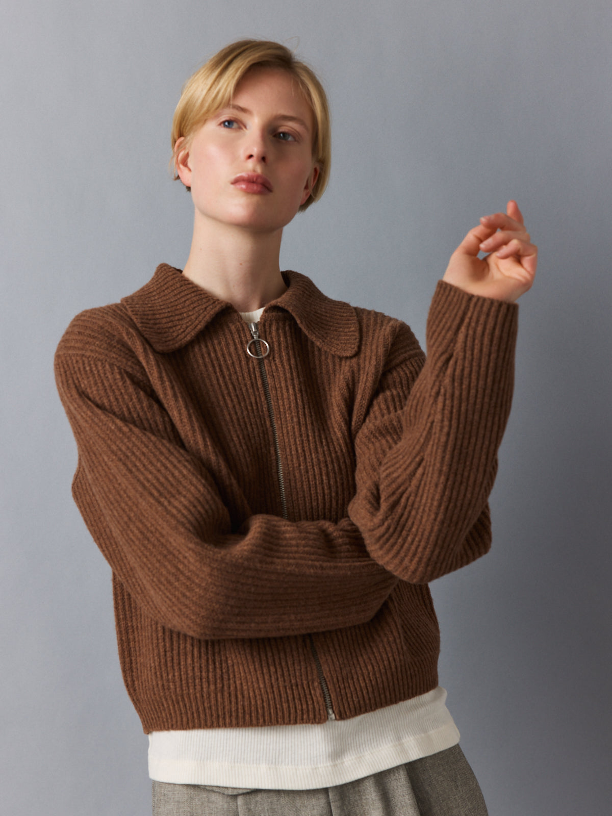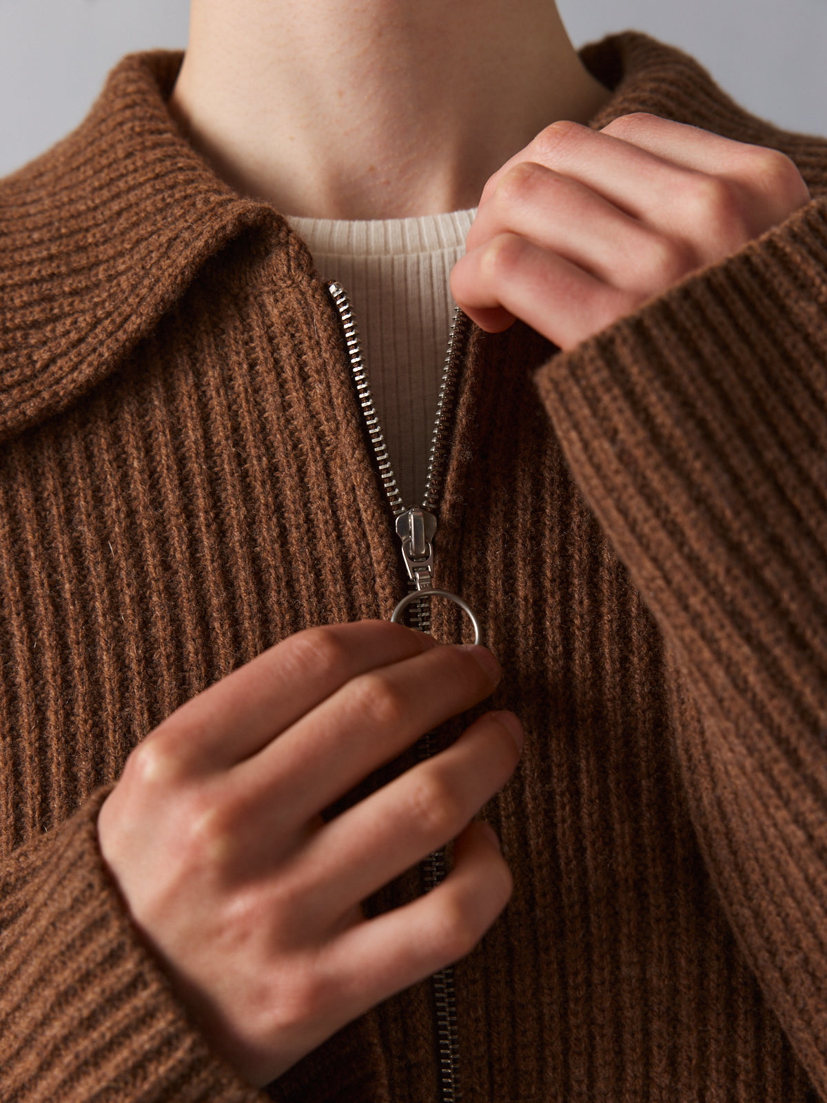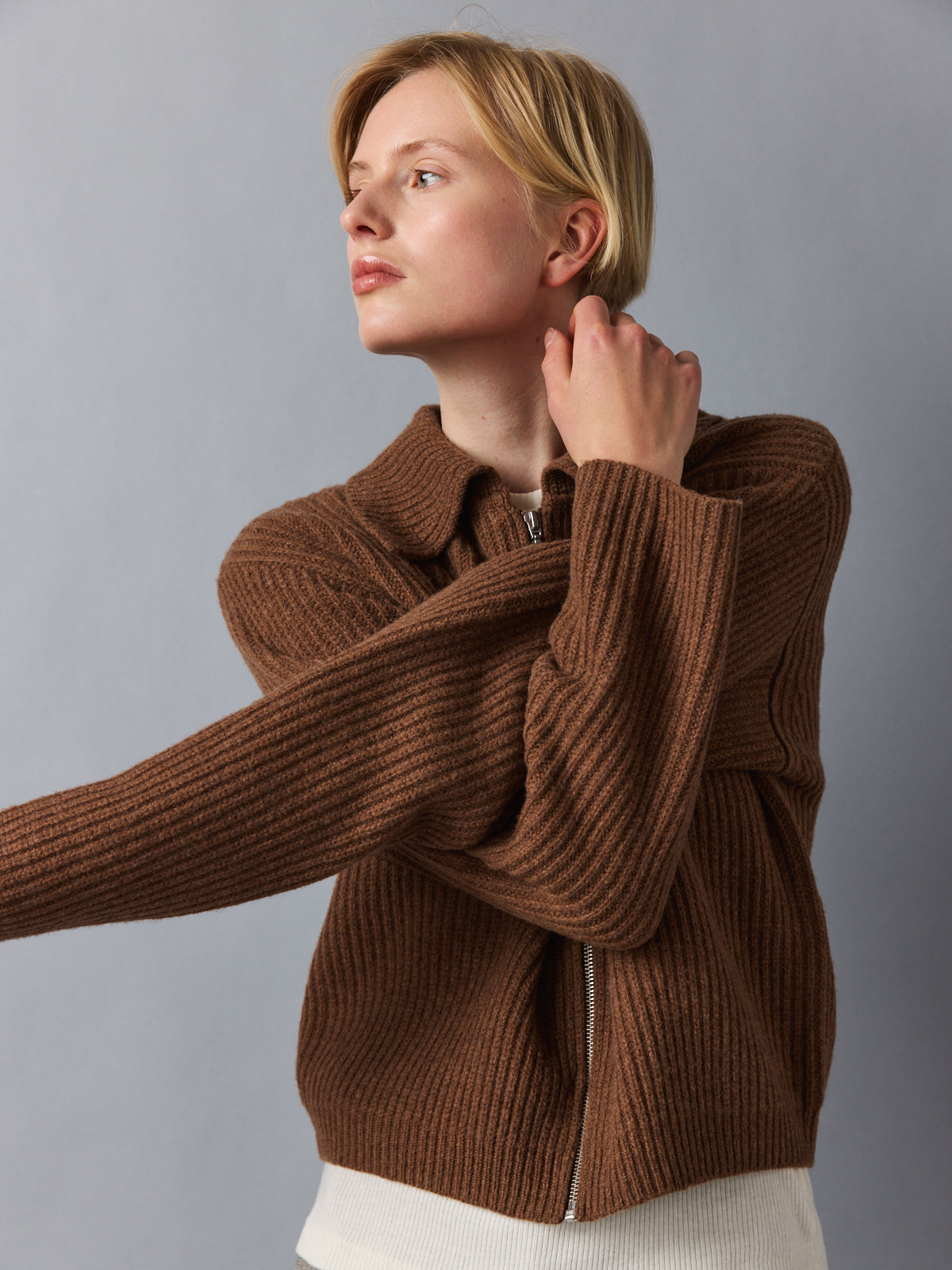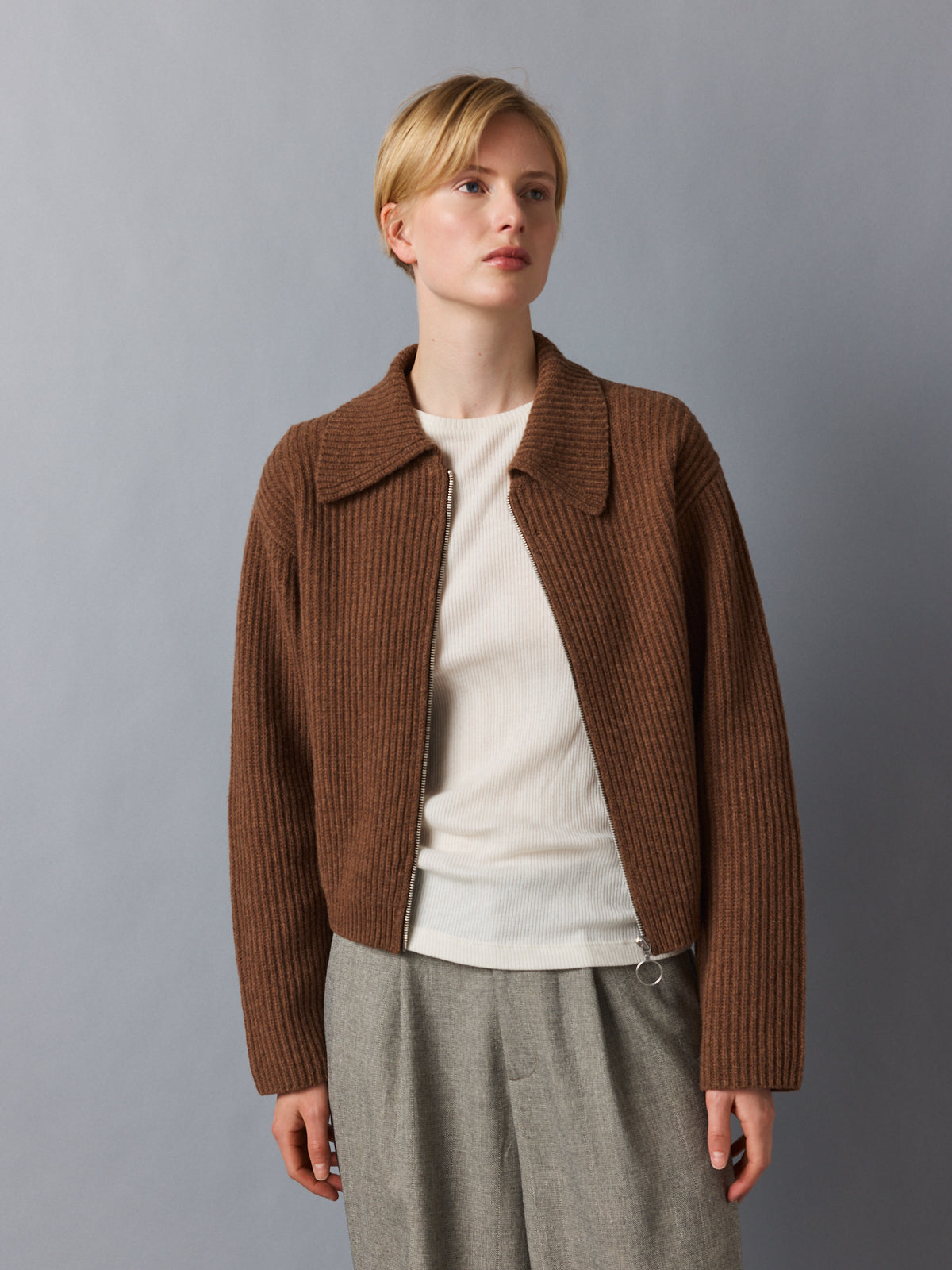 Warm noisette brown makes this hybrid jacket-cardigan an inviting winter choice. Knitted in chunky ribbed merino wool, it feels dense and cosy. Designed with a generous polo collar, zip fastening, and dropped shoulders. Pair with matching Gal mittens for a tonal, comforting finish.