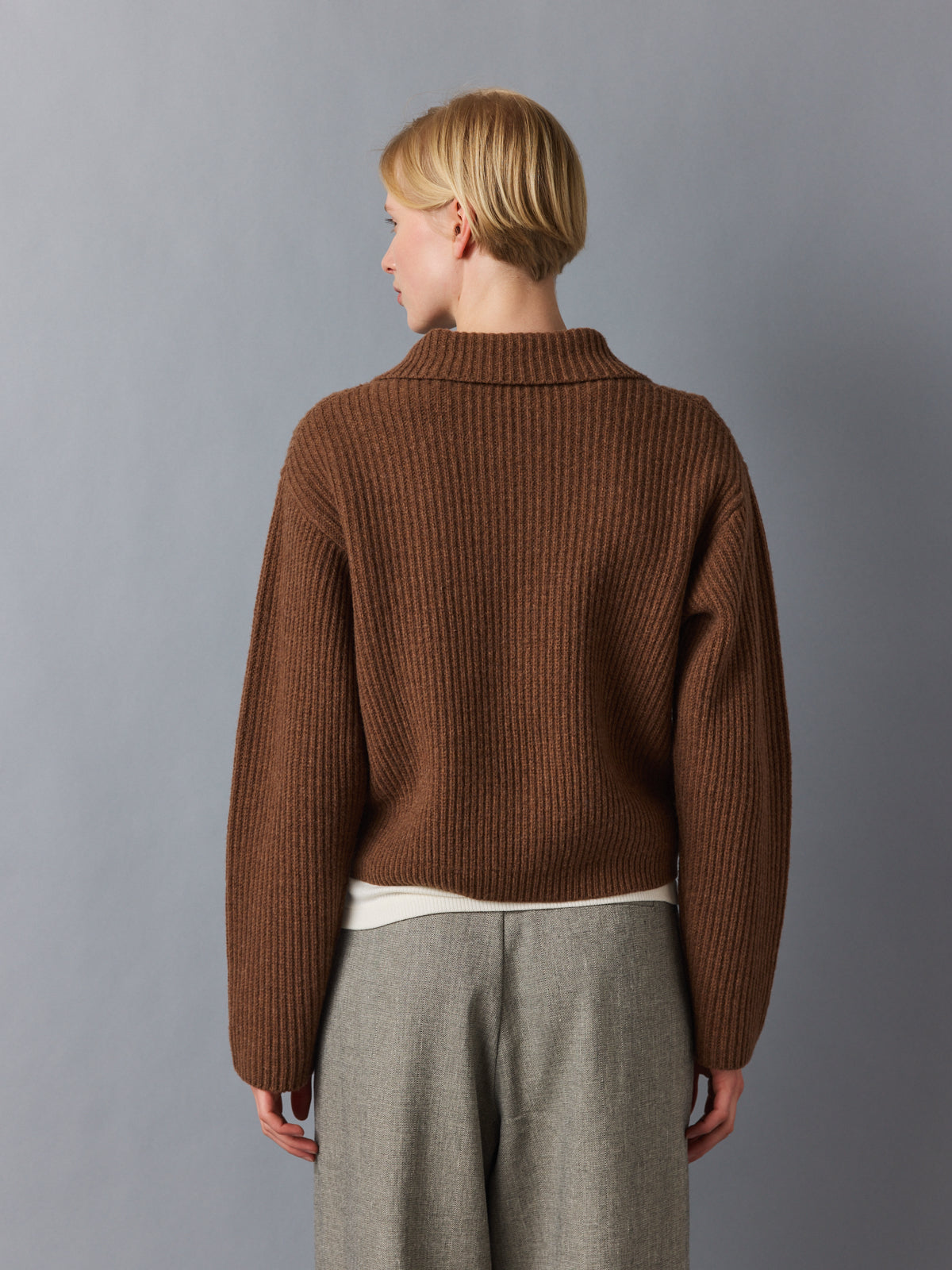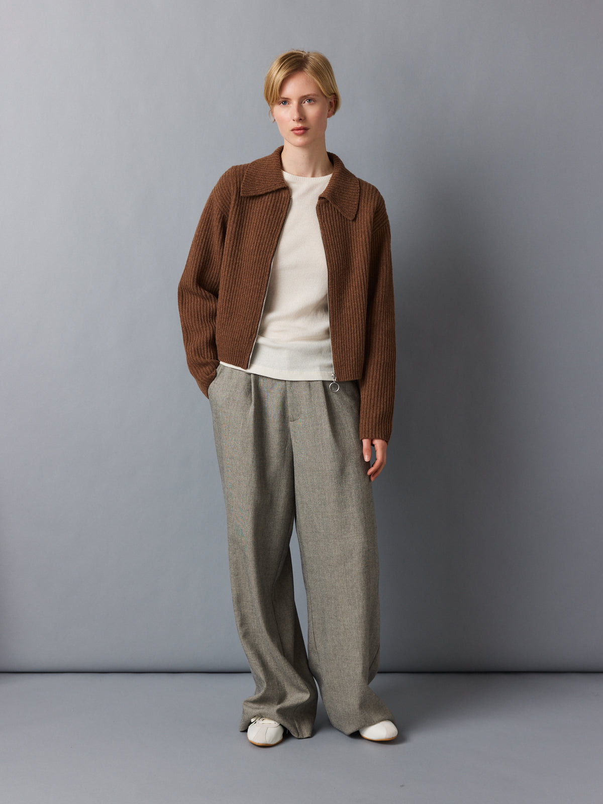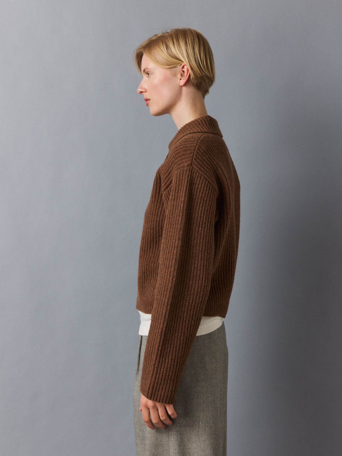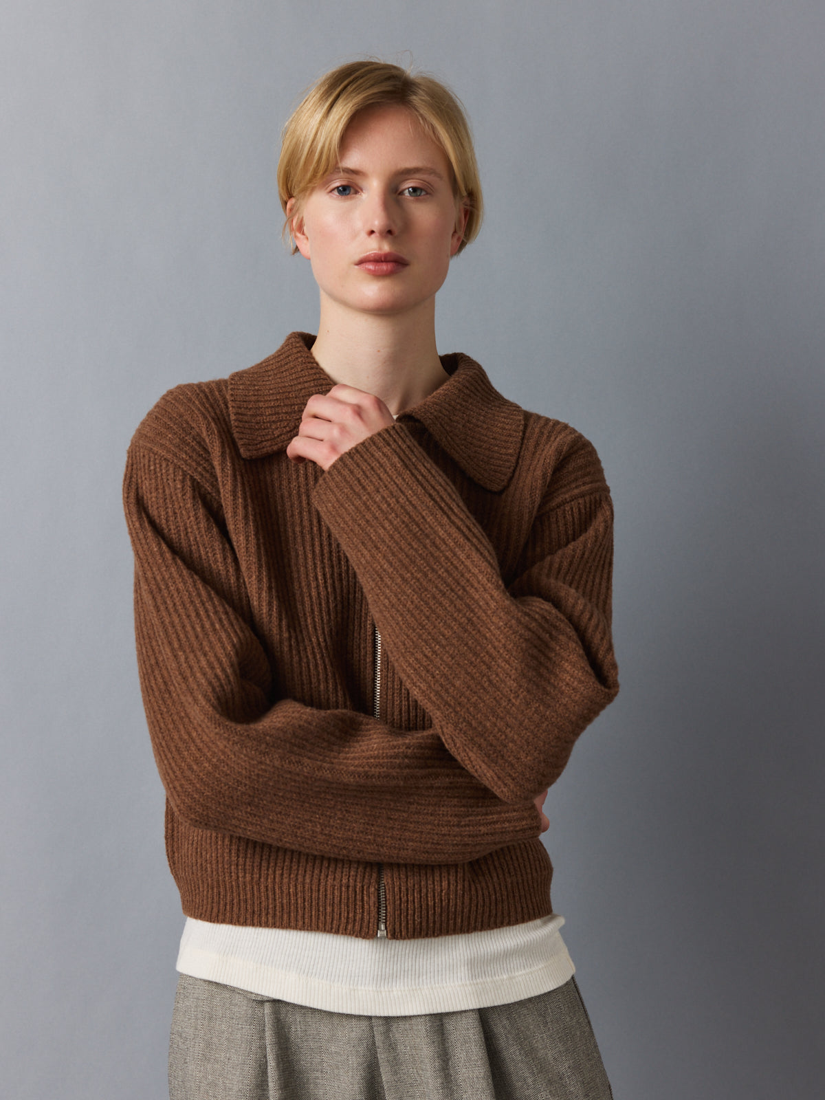 Warm noisette brown makes this hybrid jacket-cardigan an inviting winter choice. Knitted in chunky ribbed merino wool, it feels dense and cosy. Designed with a generous polo collar, zip fastening, and dropped shoulders. Pair with matching Gal mittens for a tonal, comforting finish.