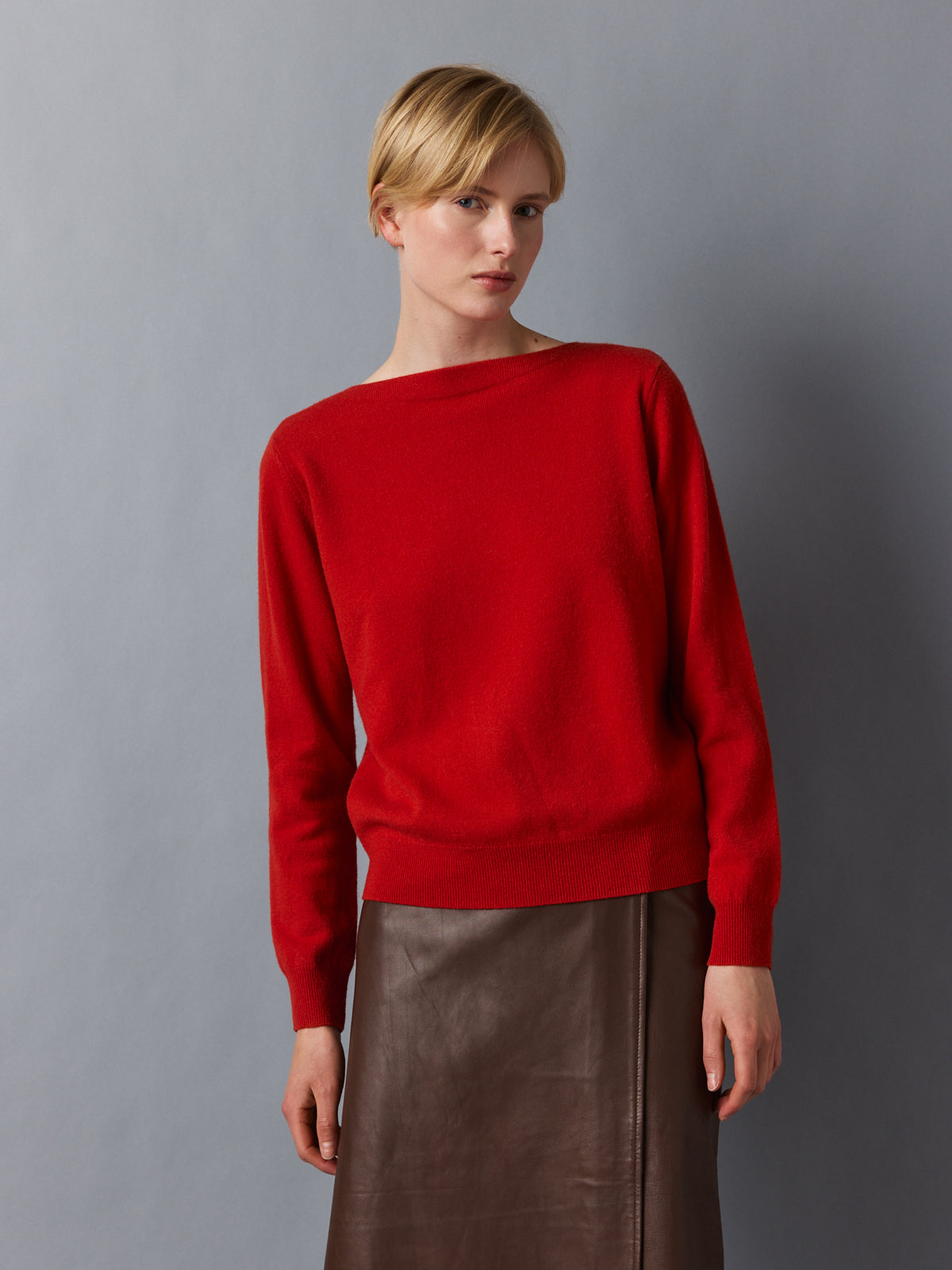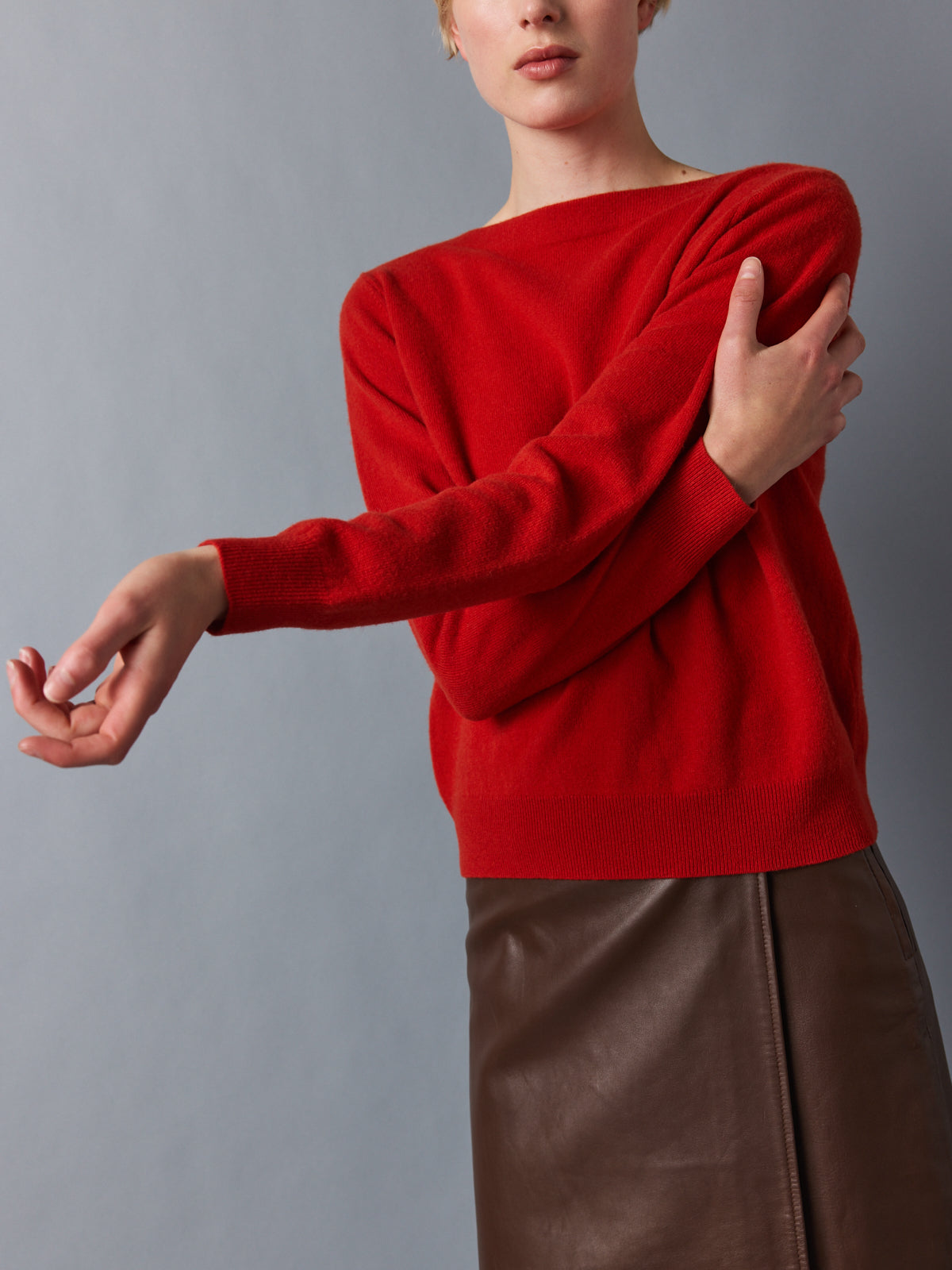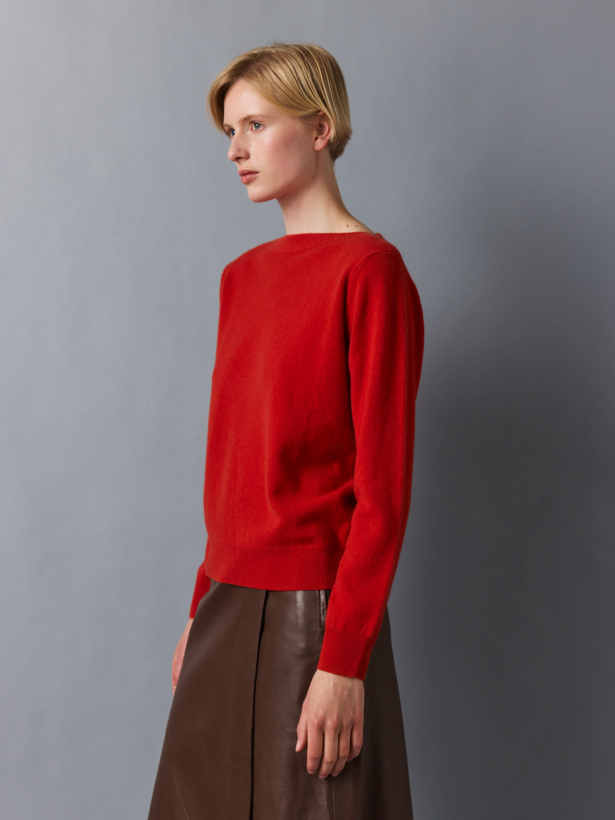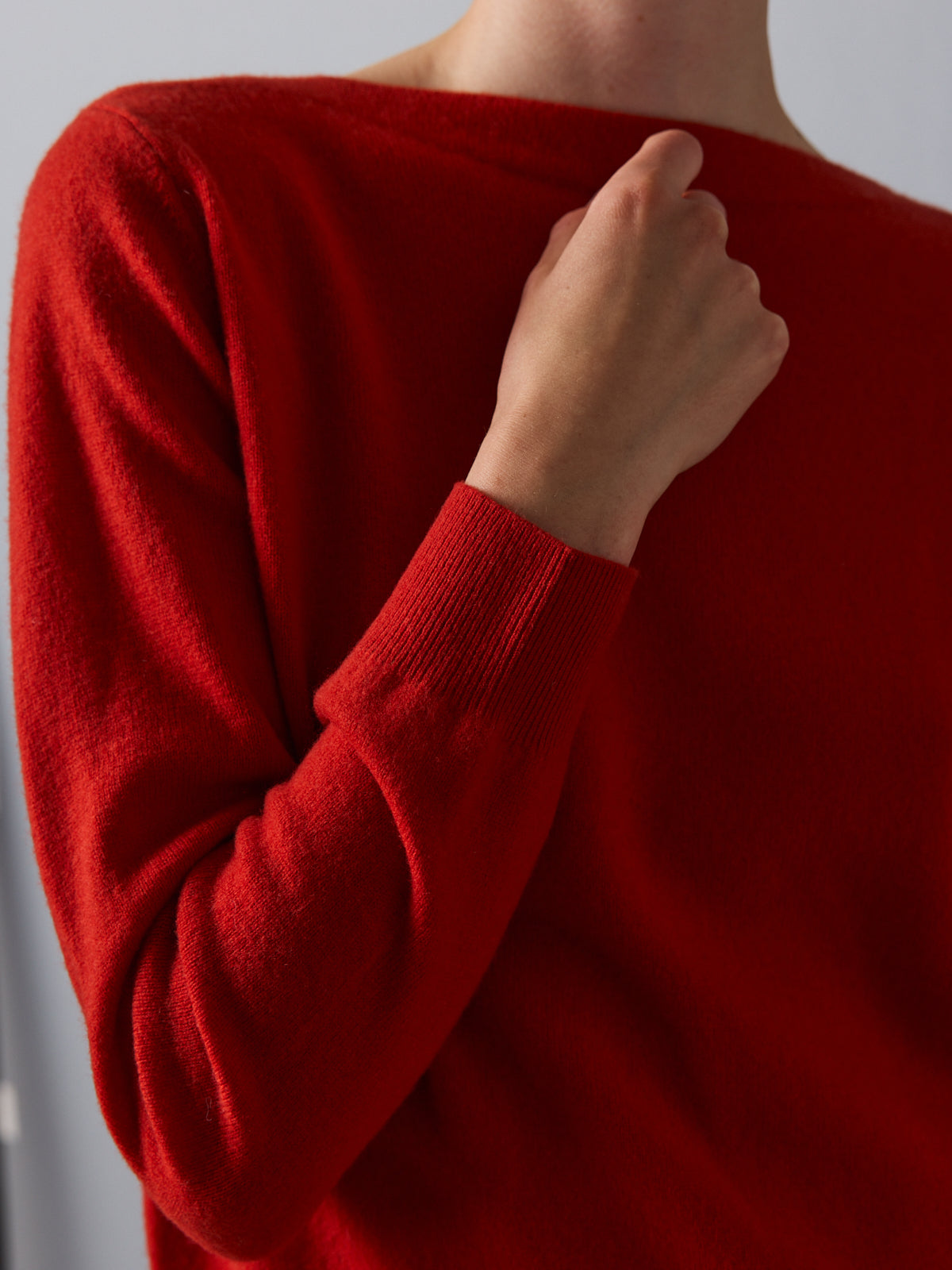 Adding a bold pop of colour to winter dressing, this deep vermillion sweater is knitted in soft extrafine merino wool. Featuring Rue Blanche’s signature boat neck, neatly fitted shoulders, and a slightly fitted waistband, it offers a refined silhouette with cosy comfort. A confident take on a wardrobe staple.