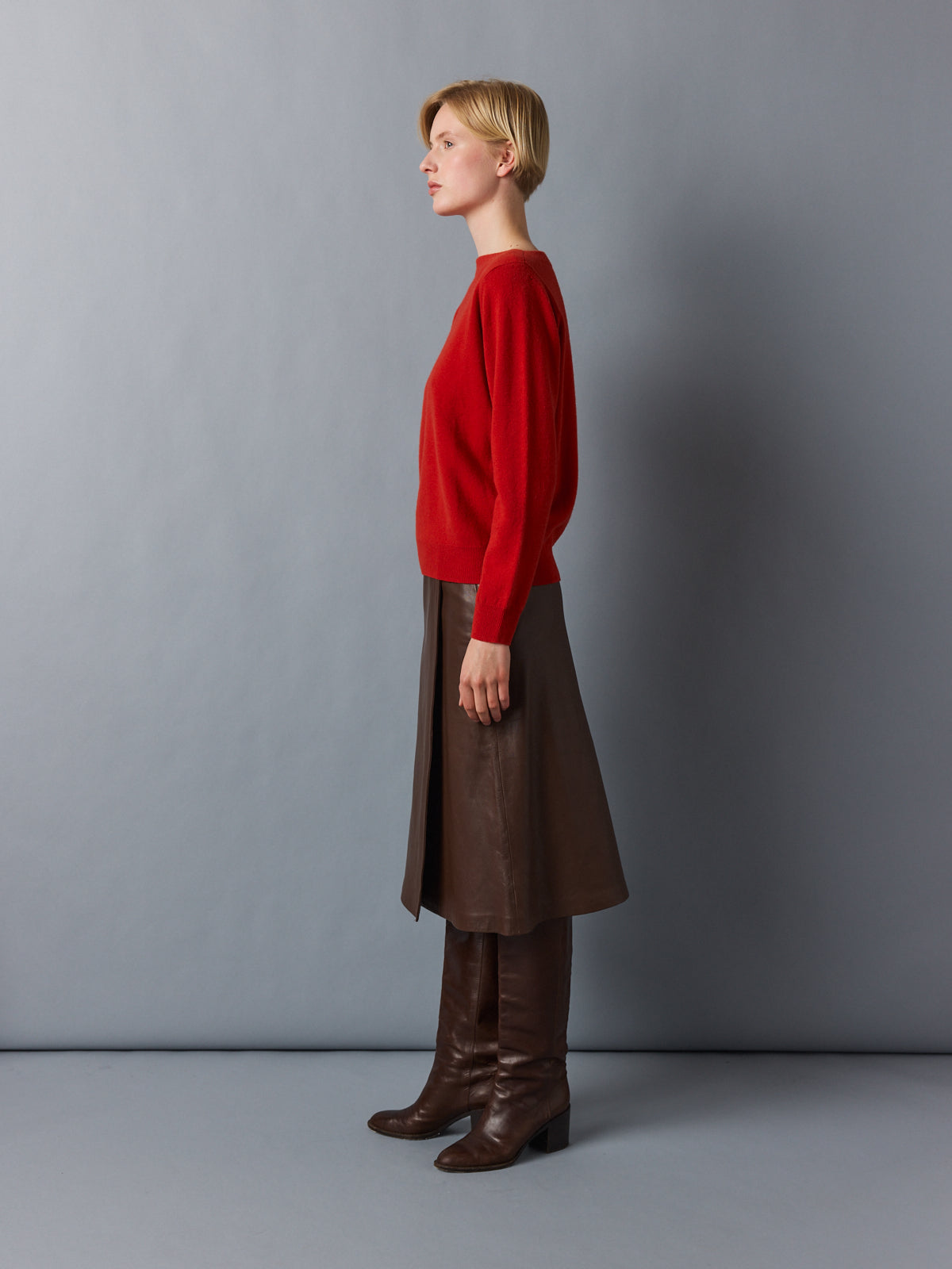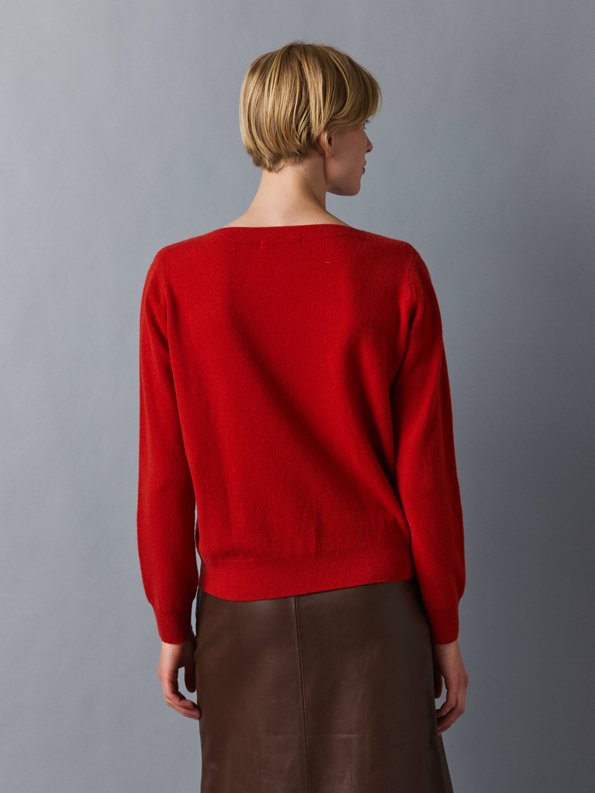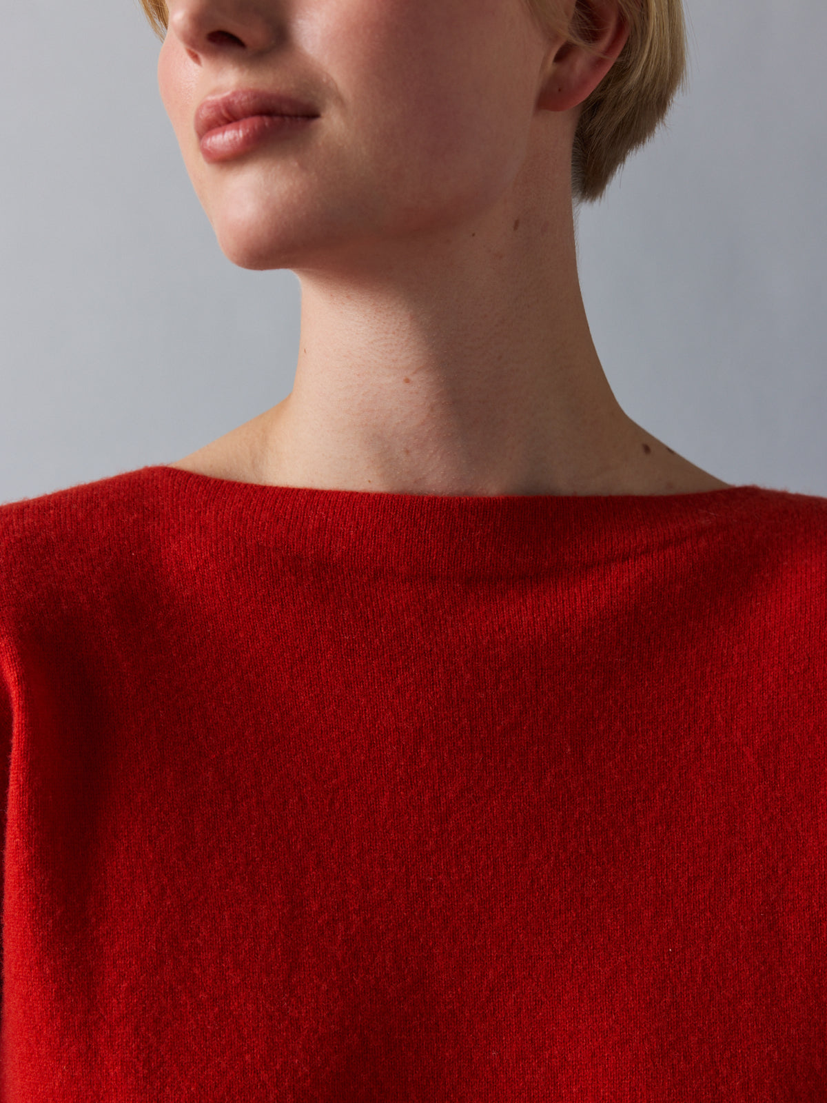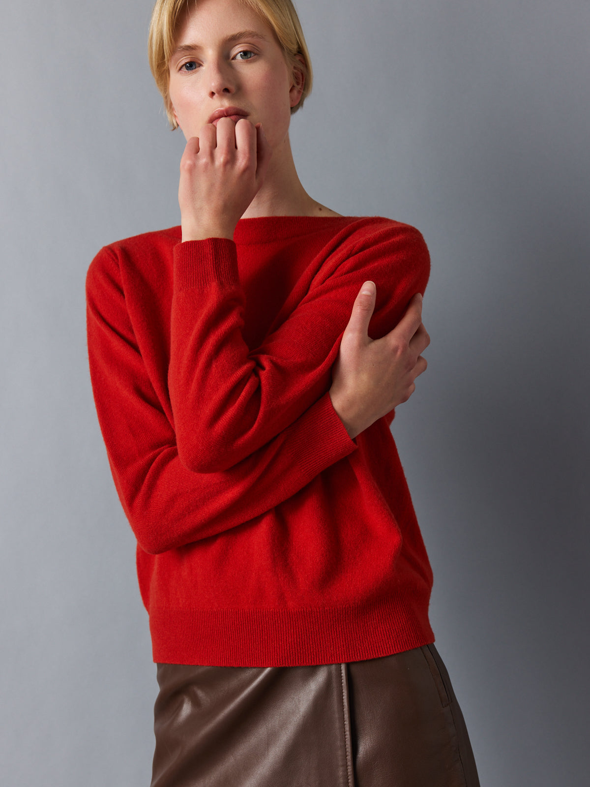 Adding a bold pop of colour to winter dressing, this deep vermillion sweater is knitted in soft extrafine merino wool. Featuring Rue Blanche’s signature boat neck, neatly fitted shoulders, and a slightly fitted waistband, it offers a refined silhouette with cosy comfort. A confident take on a wardrobe staple.