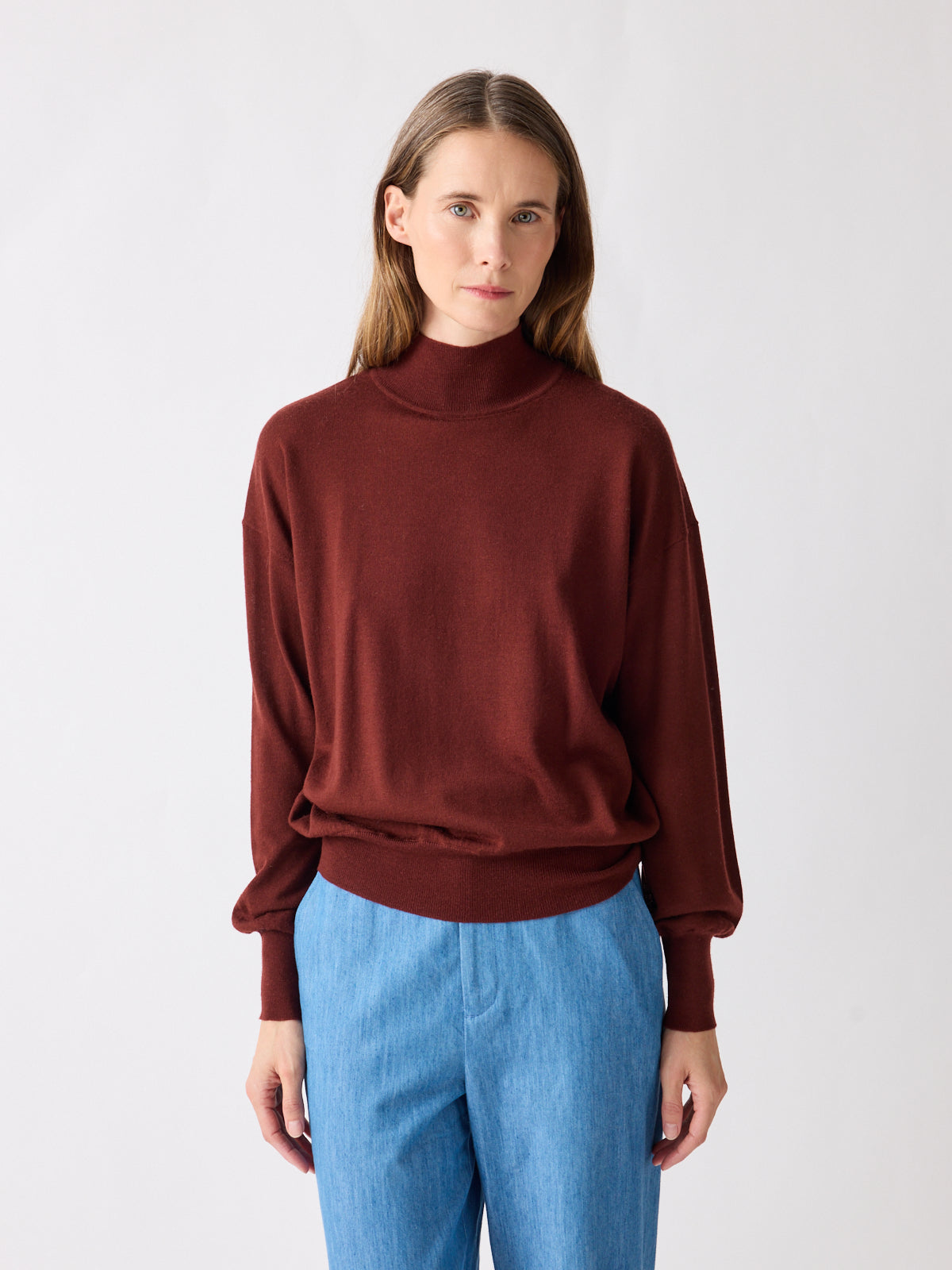 A softly voluminous sweater in brownish bordeaux, a deep shade that catches the light with warmth and depth. The fine merino wool flows gently into a mock neck, subtle balloon sleeves, and fitted waistband for a relaxed look.