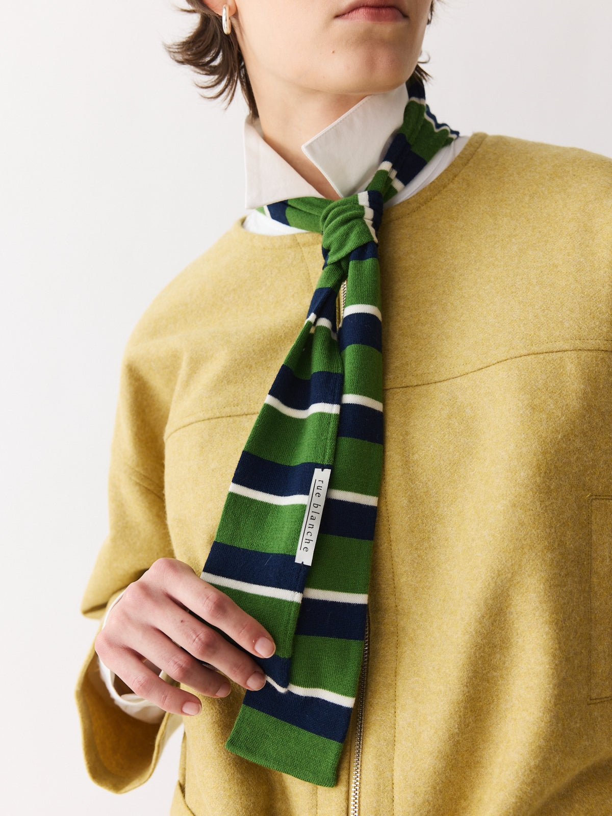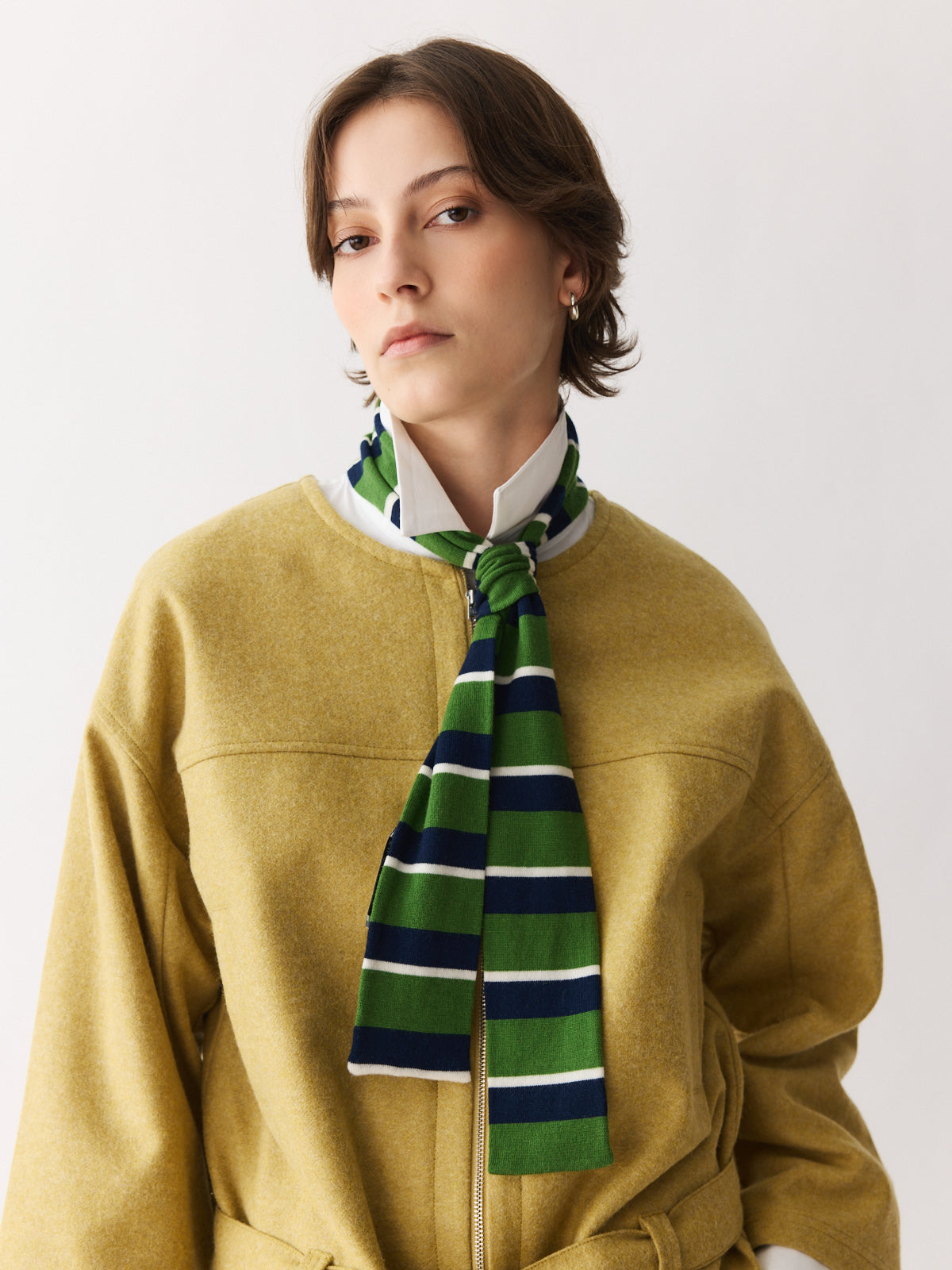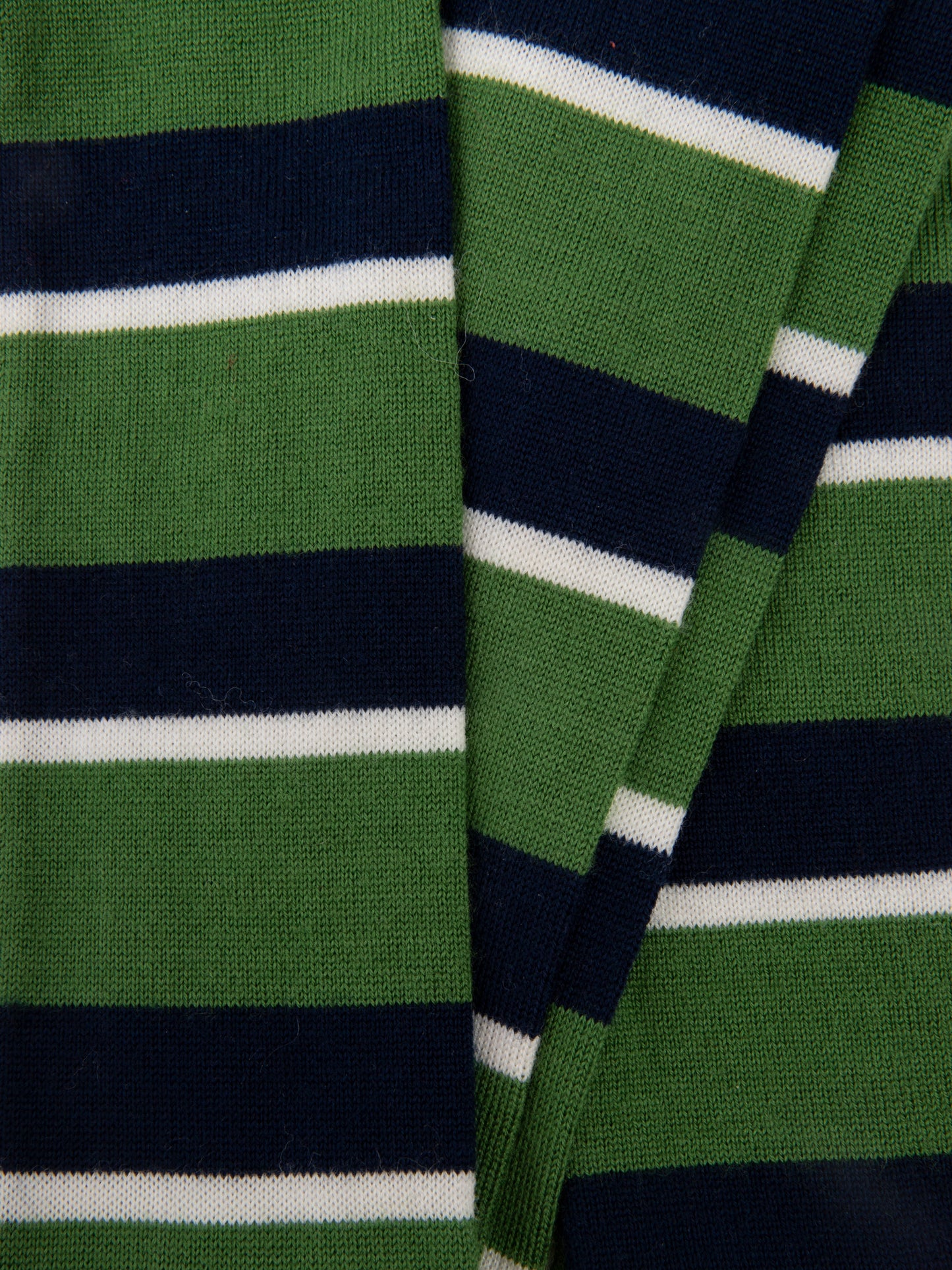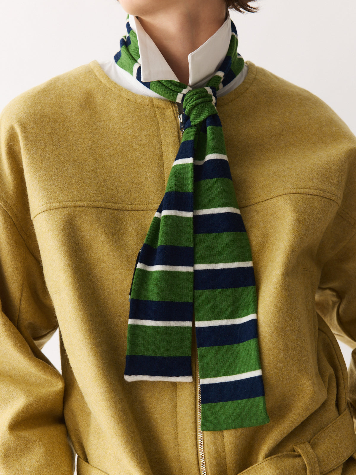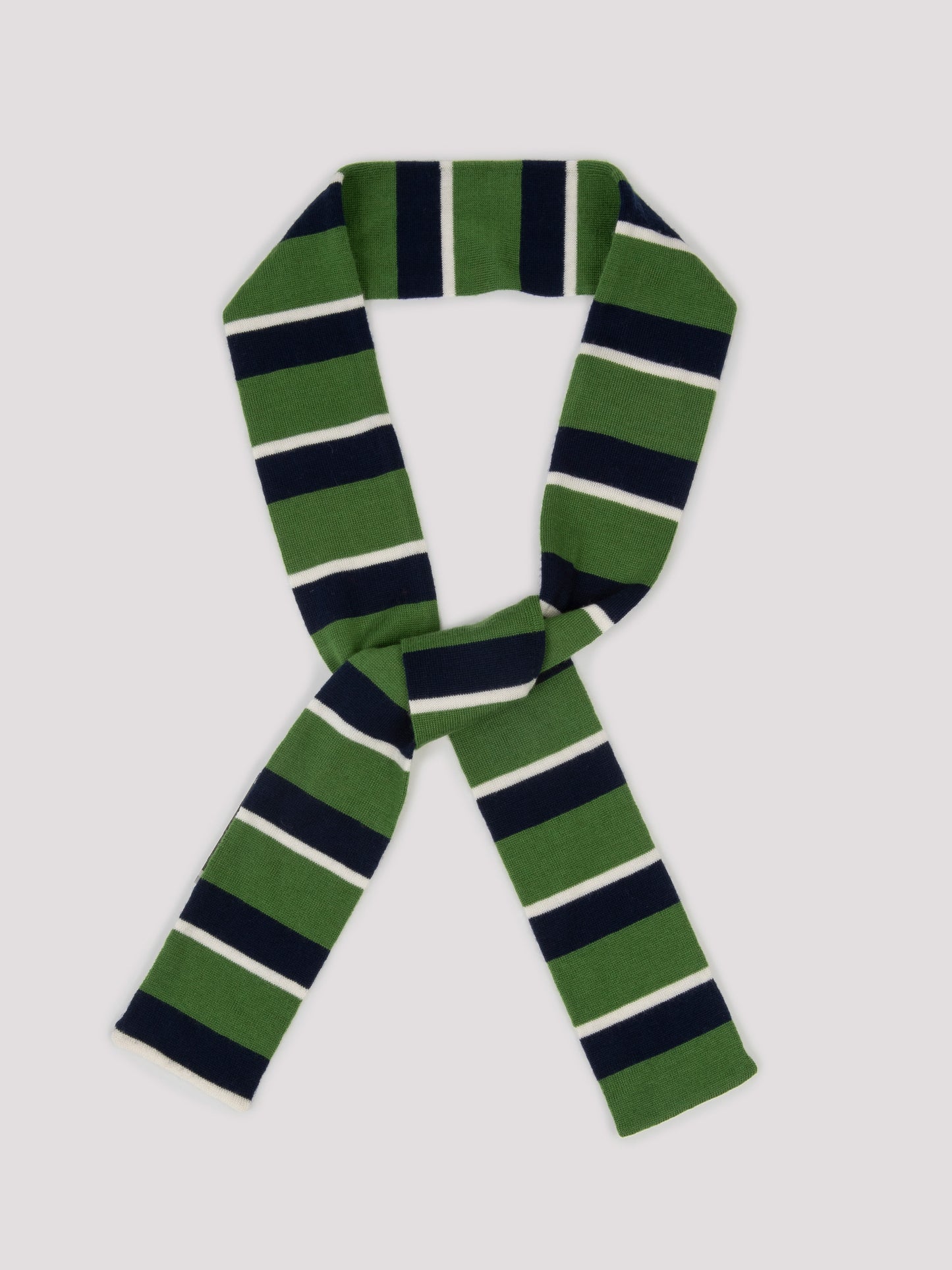 A soft, lightweight scarf that plays with colour, pattern and proportion. Knitted in fine merino wool with stripes of navy, cream, and grass green, it adds a playful accent to winter looks.