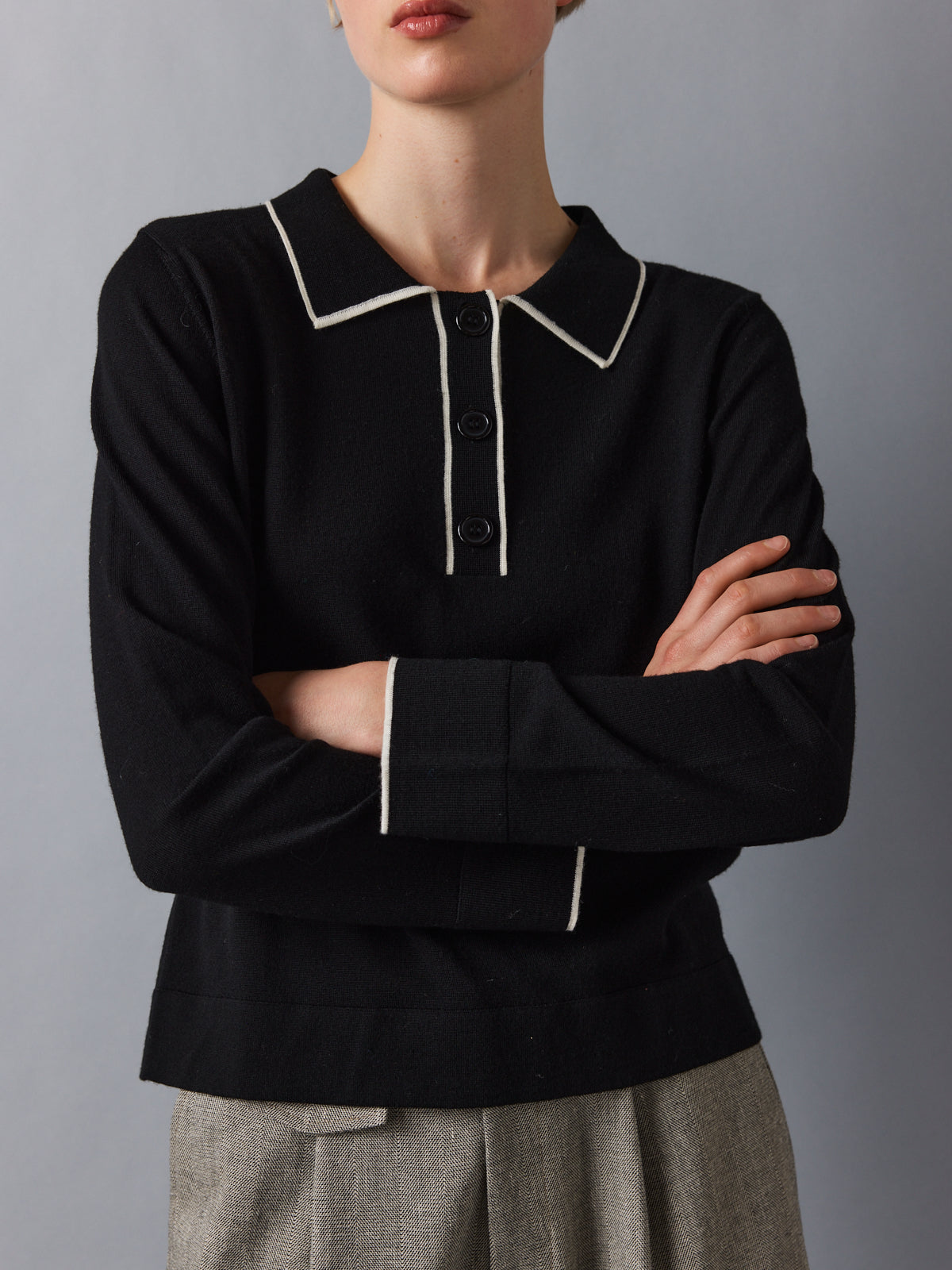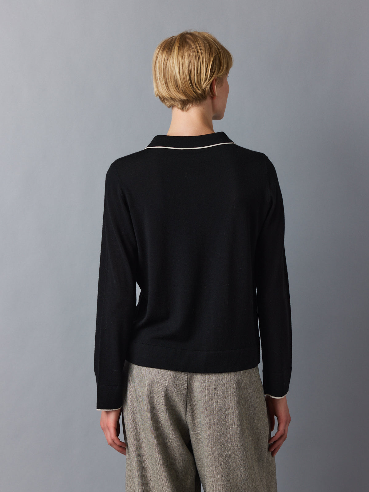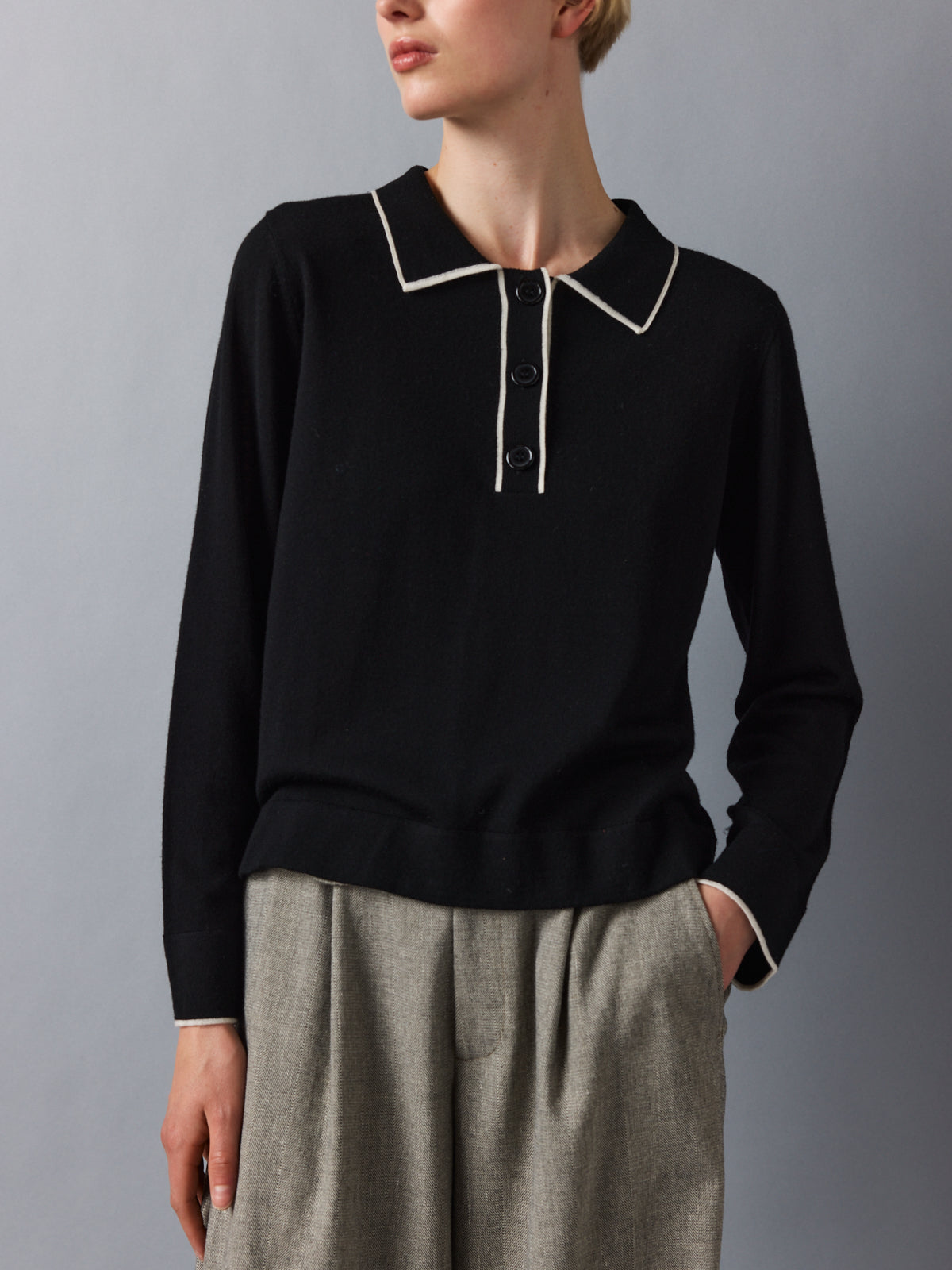 A modern essential with subtle contrast. This long-sleeved polo sweater comes in black with cream stripes accenting the collar, placket, and cuffs. Finely knit in extrafine merino wool, it feels soft, lightweight, and effortlessly polished.