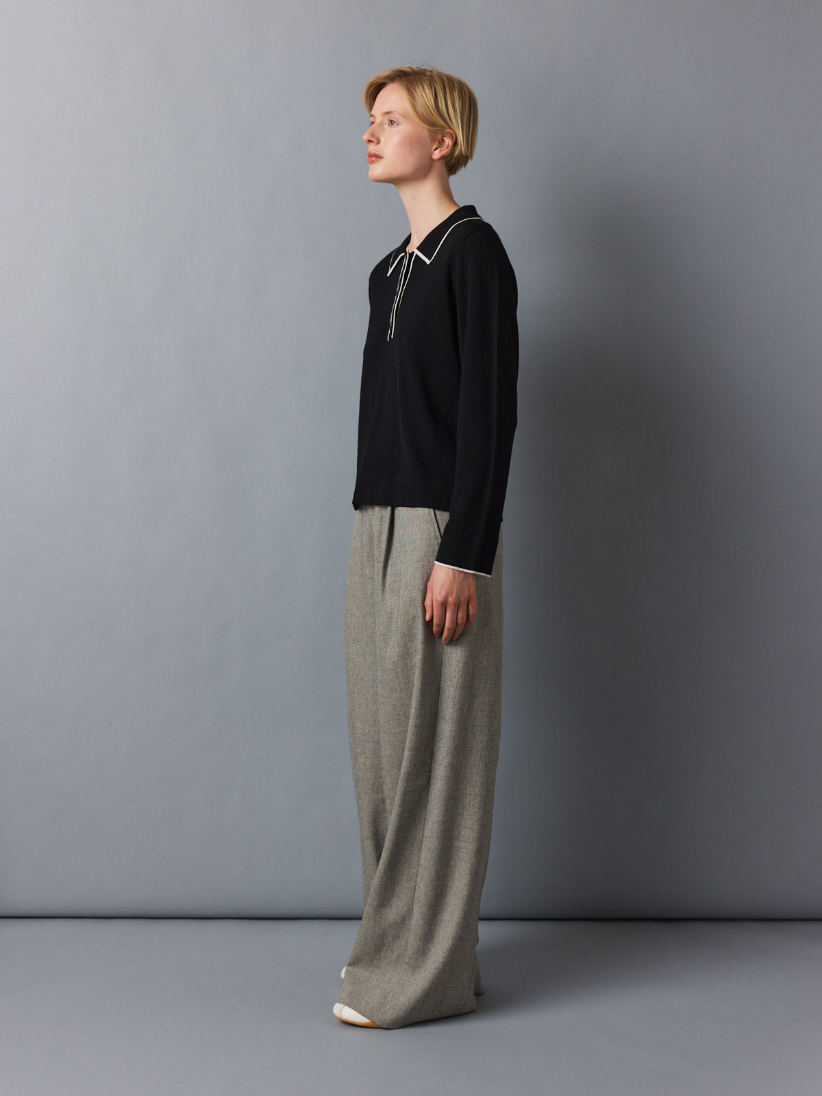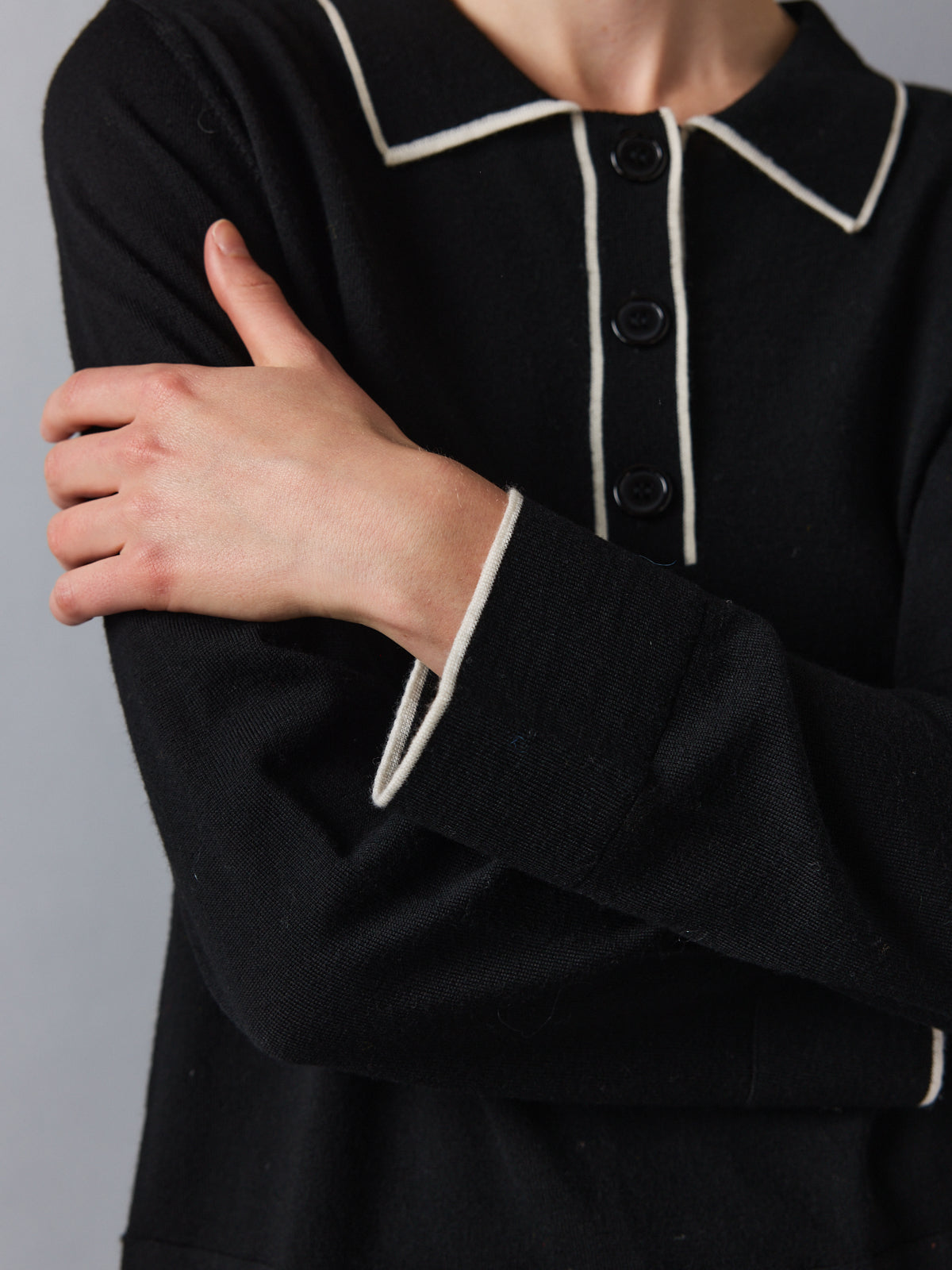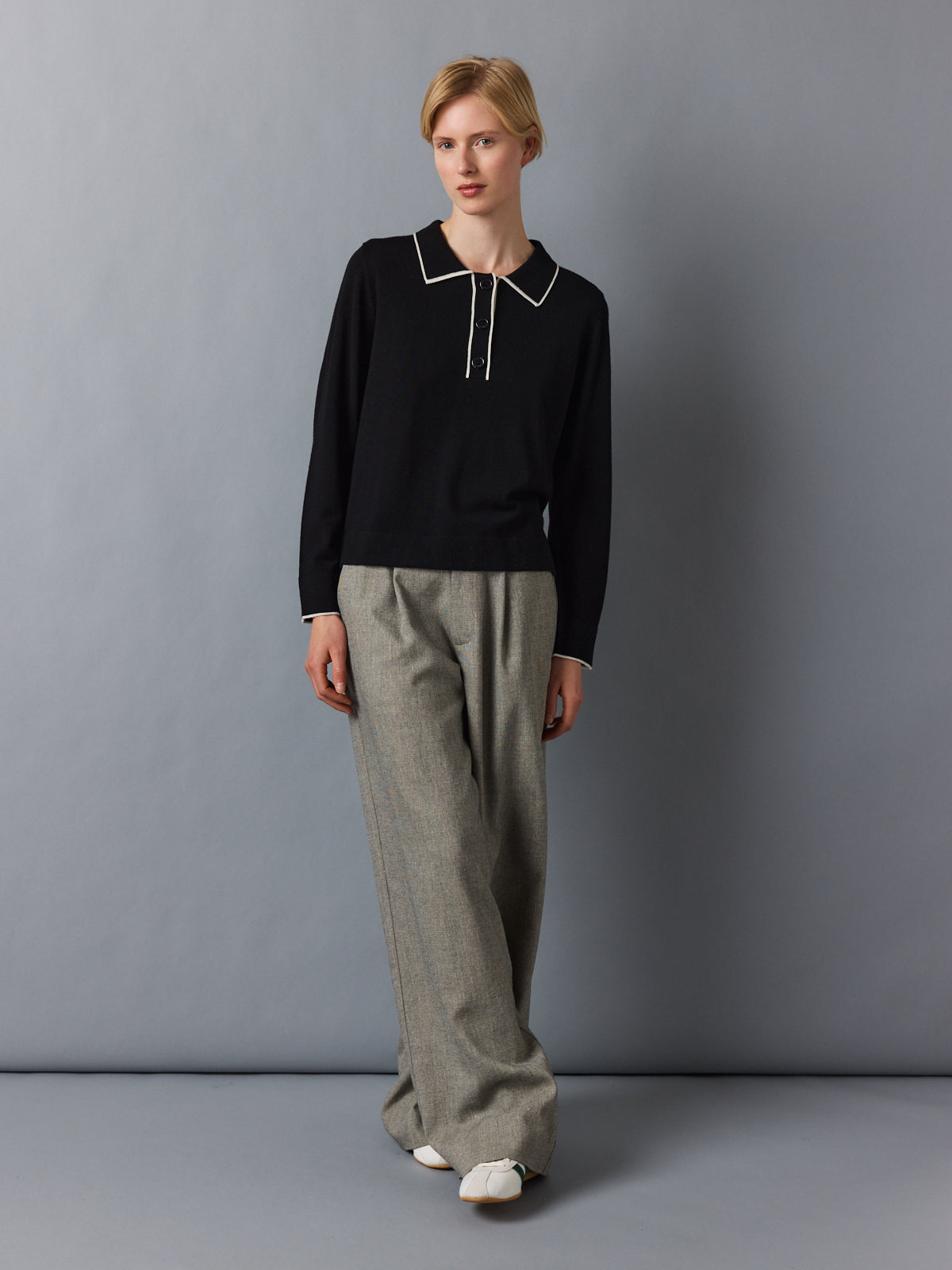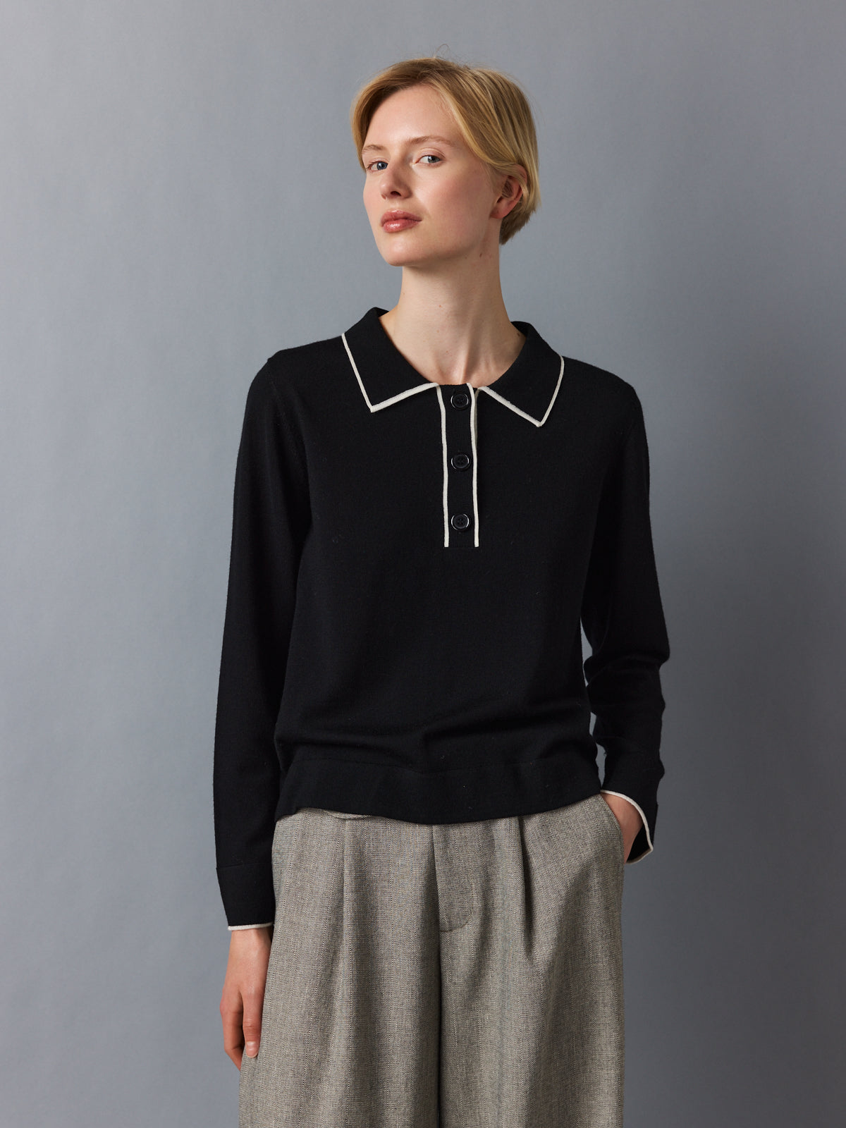 A modern essential with subtle contrast. This long-sleeved polo sweater comes in black with cream stripes accenting the collar, placket, and cuffs. Finely knit in extrafine merino wool, it feels soft, lightweight, and effortlessly polished.