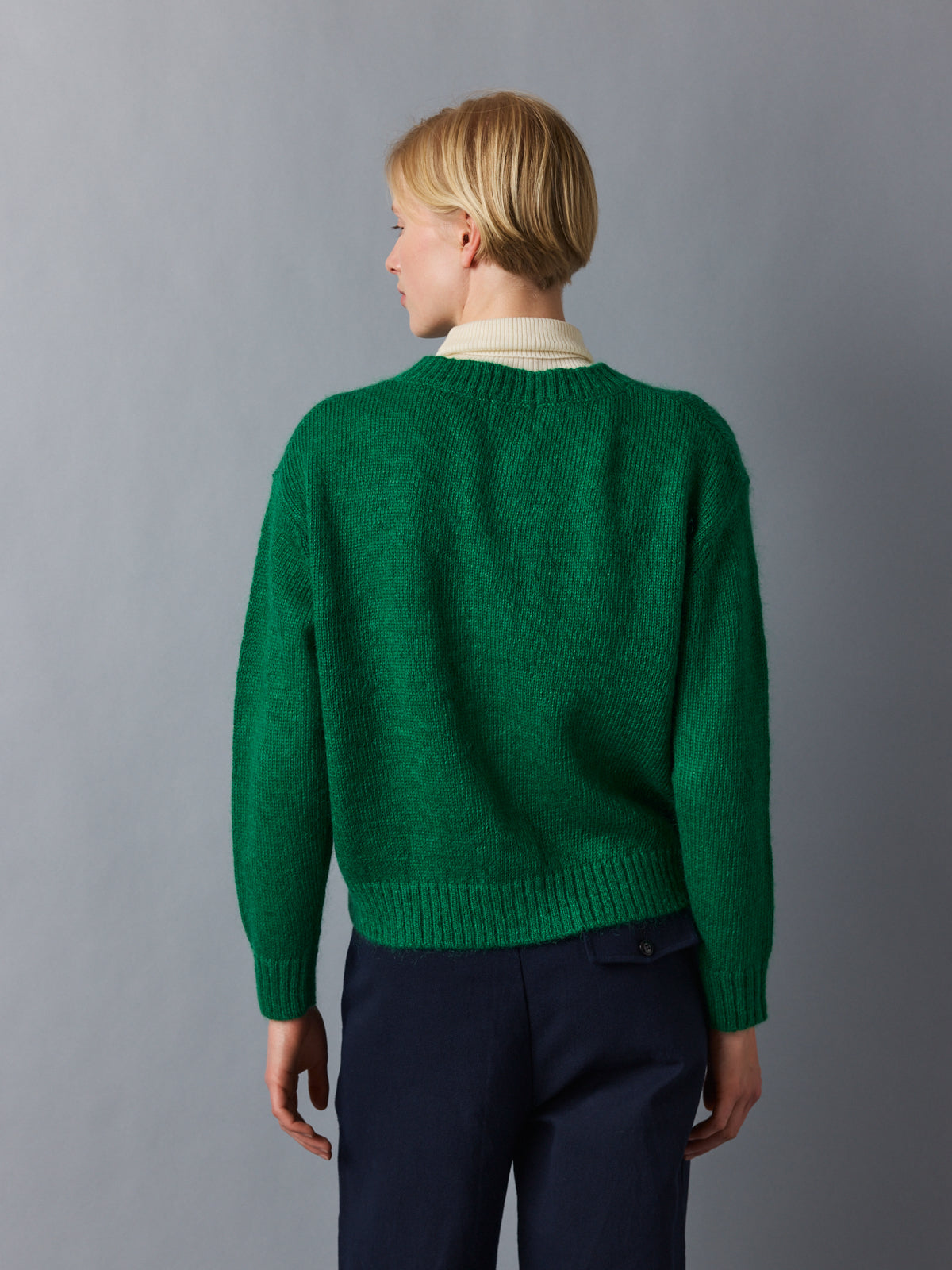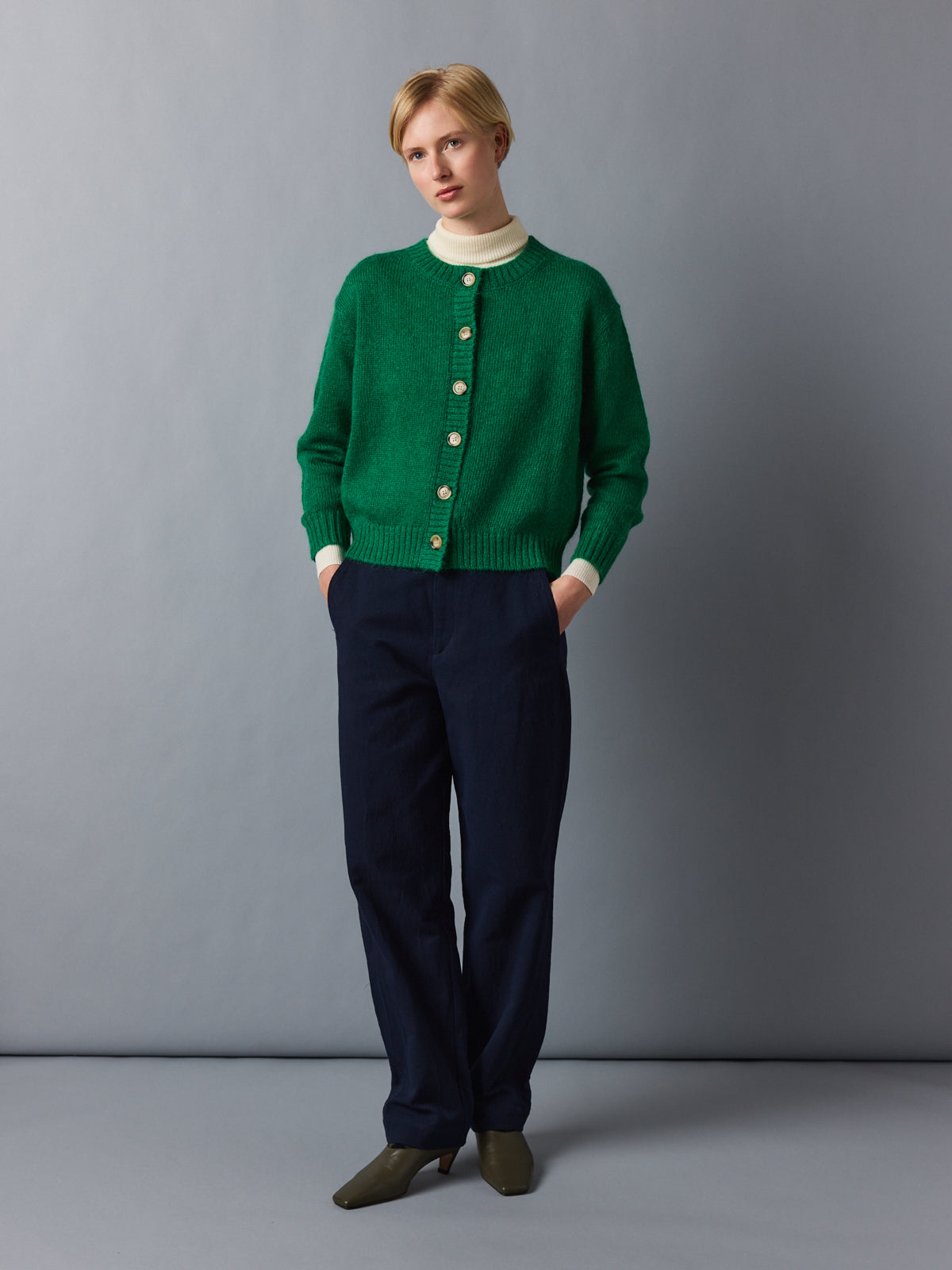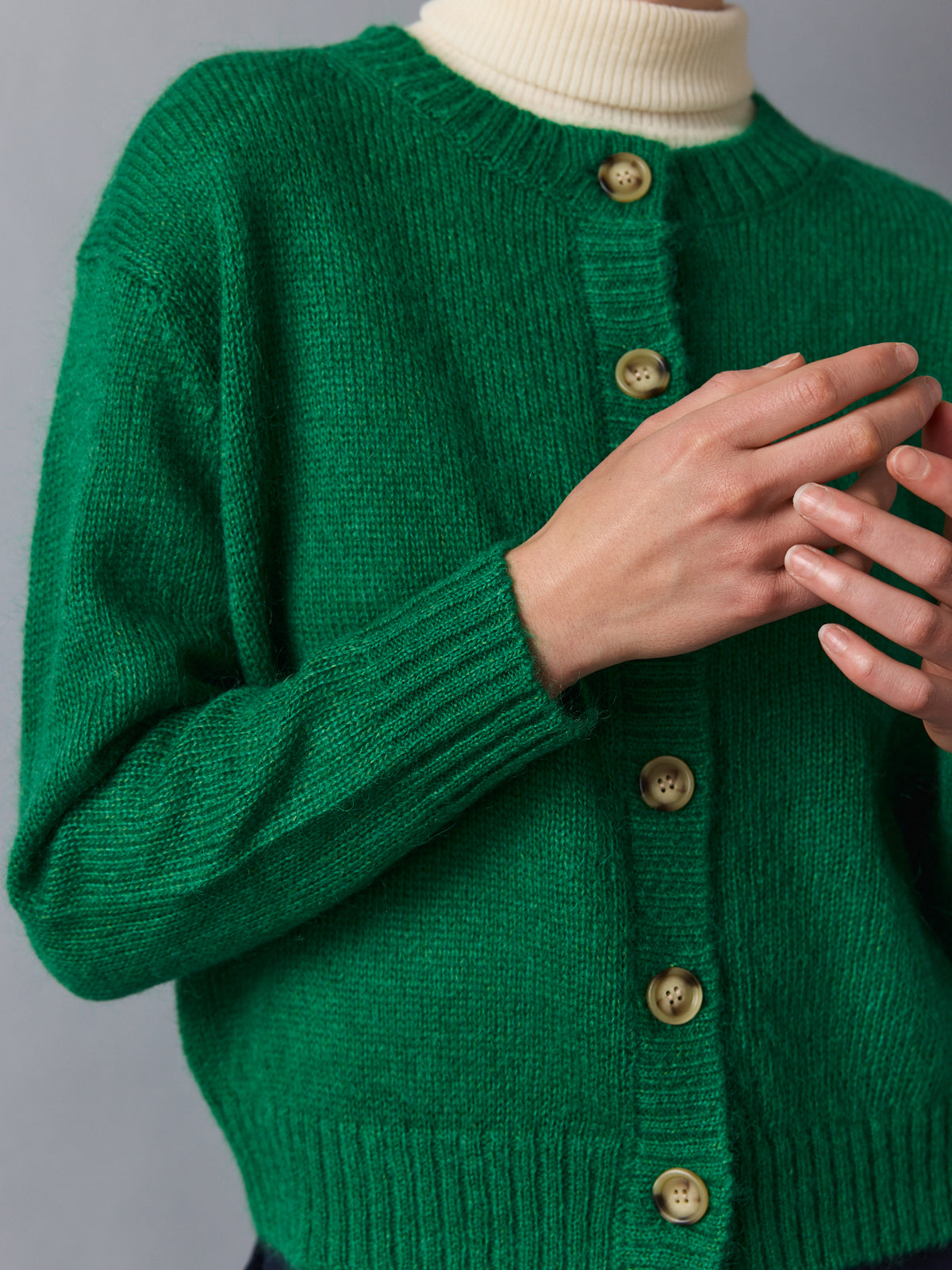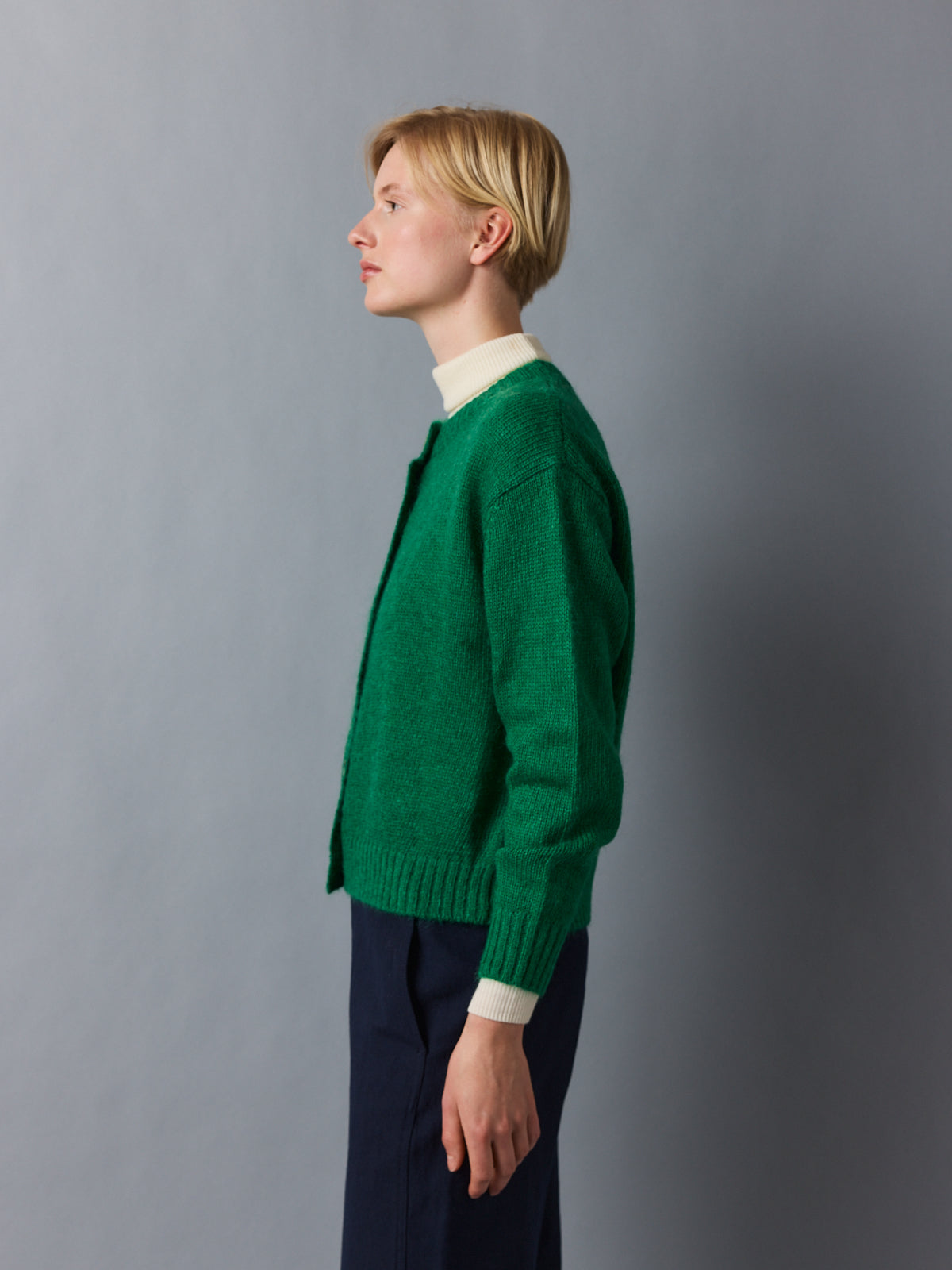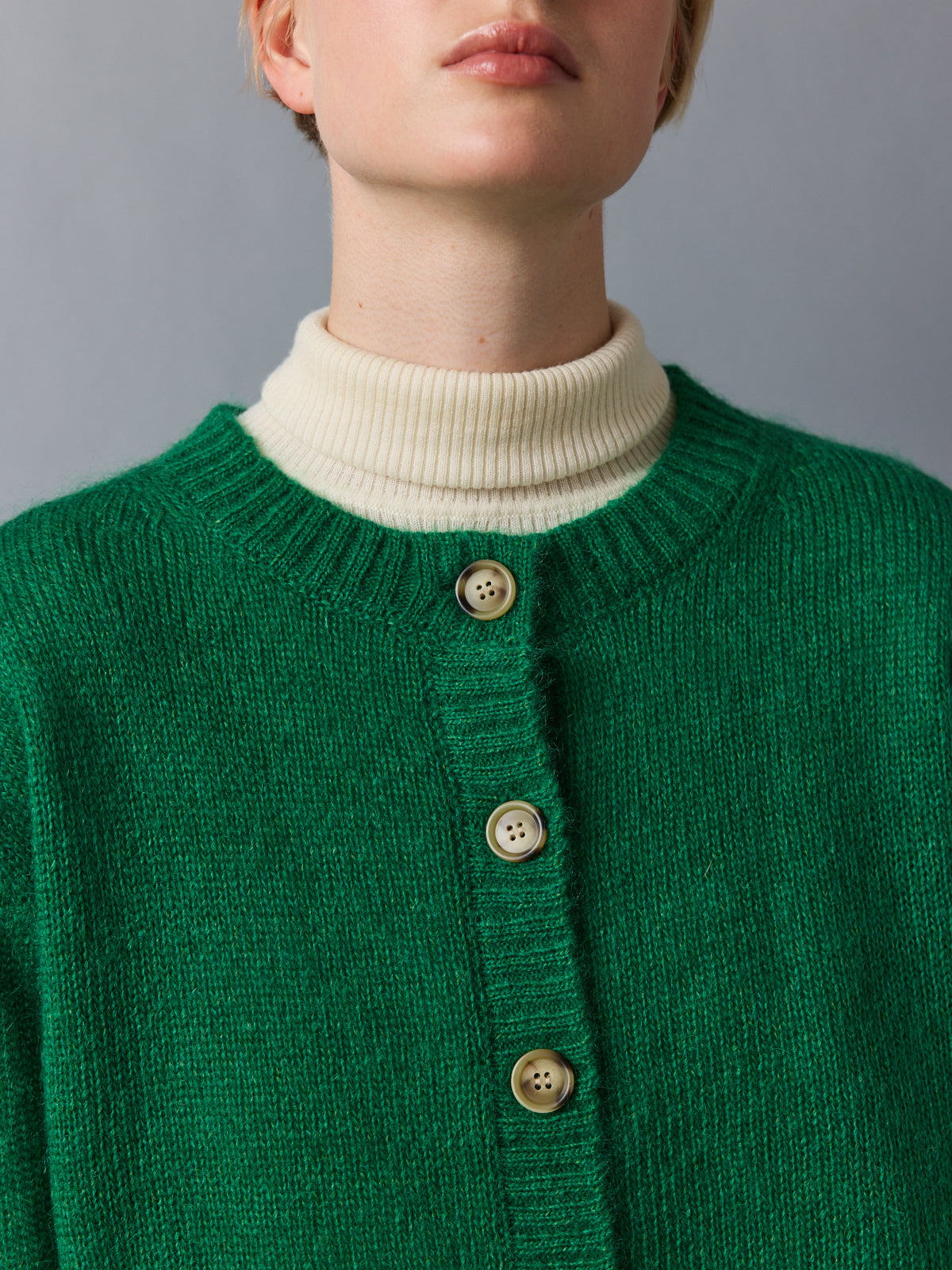 A statement cardigan in a rich, bright green with a soft winter texture. This relaxed design features a round neckline, dropped shoulders, and generously sized buttons. Chunky ribbed trims and a subtly fitted waistband add gentle structure to the airy mohair blend. A confident layer with impact.