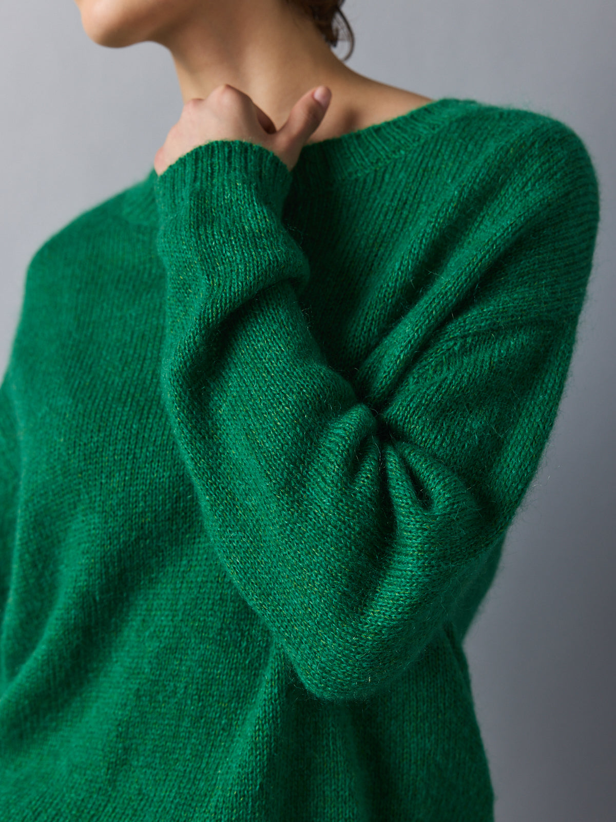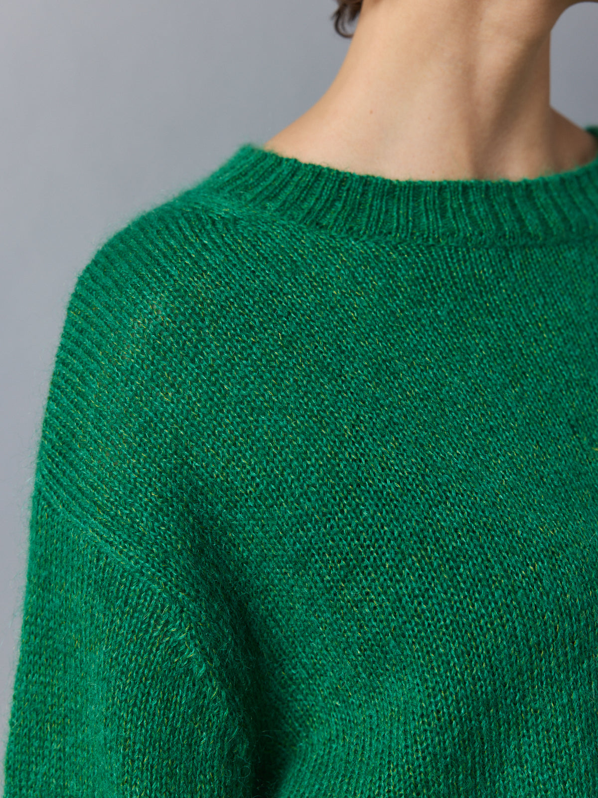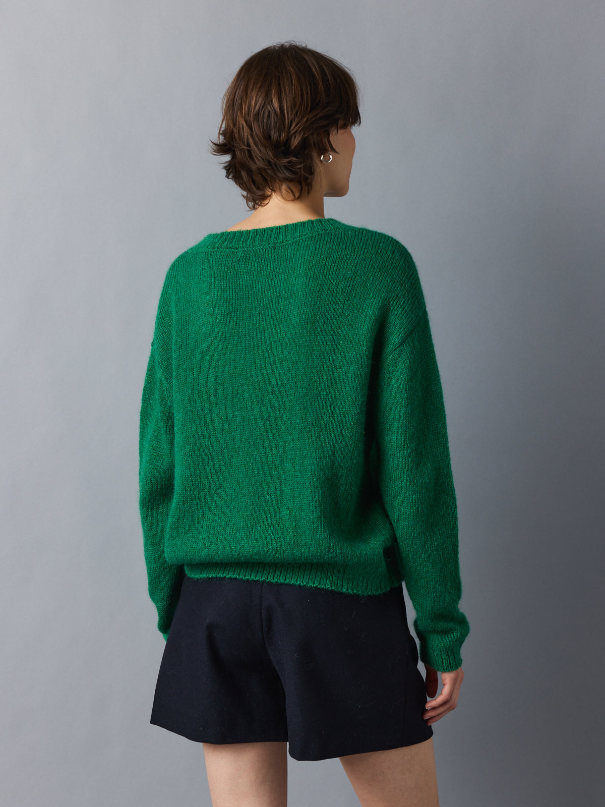 A standout in deep primary green. This relaxed sweater is knitted in a lightweight mohair blend with a slightly fluffy texture. The rich hue adds depth to winter styling, while ribbed trims and dropped shoulders keep the silhouette easy and wearable.