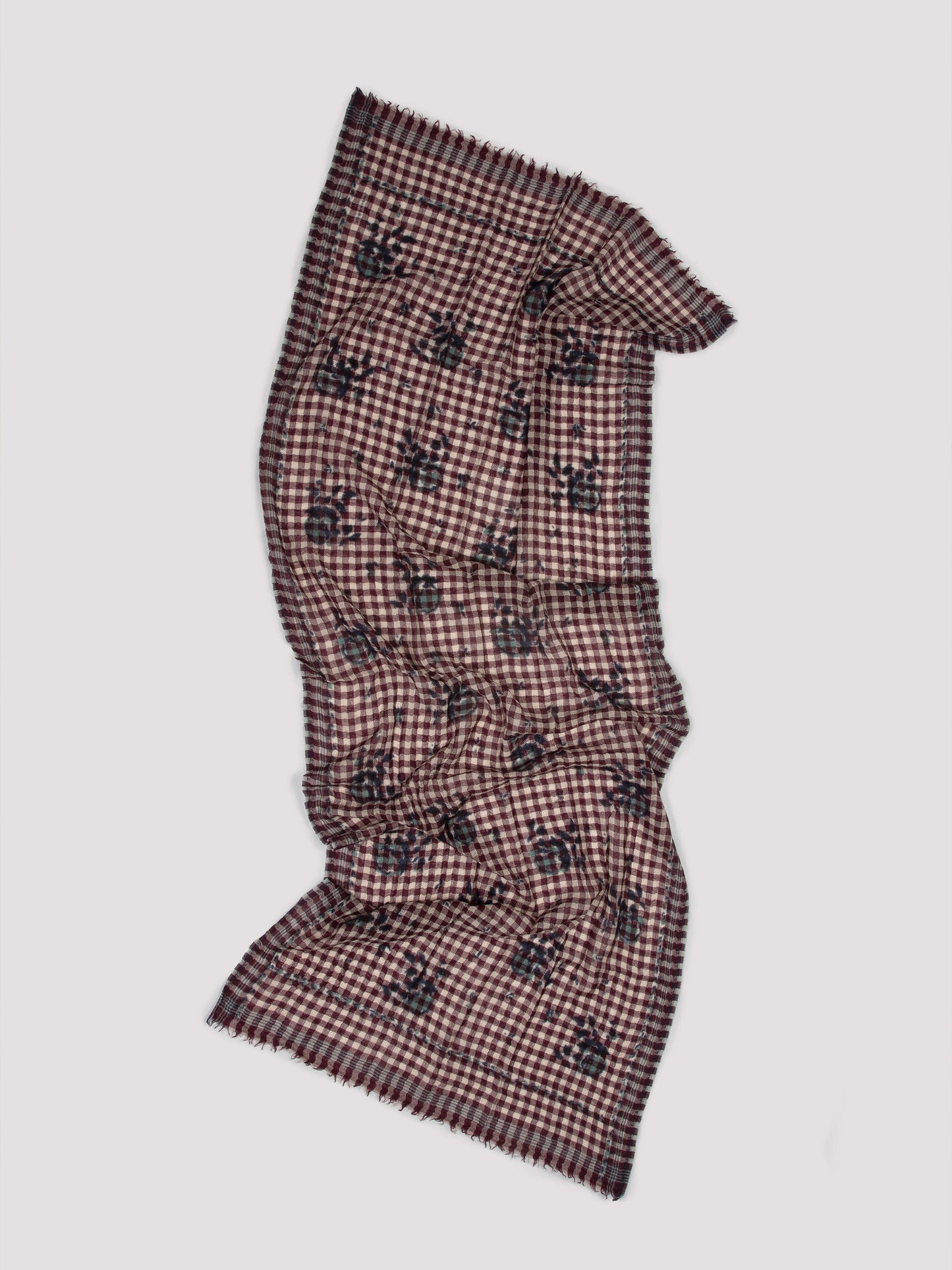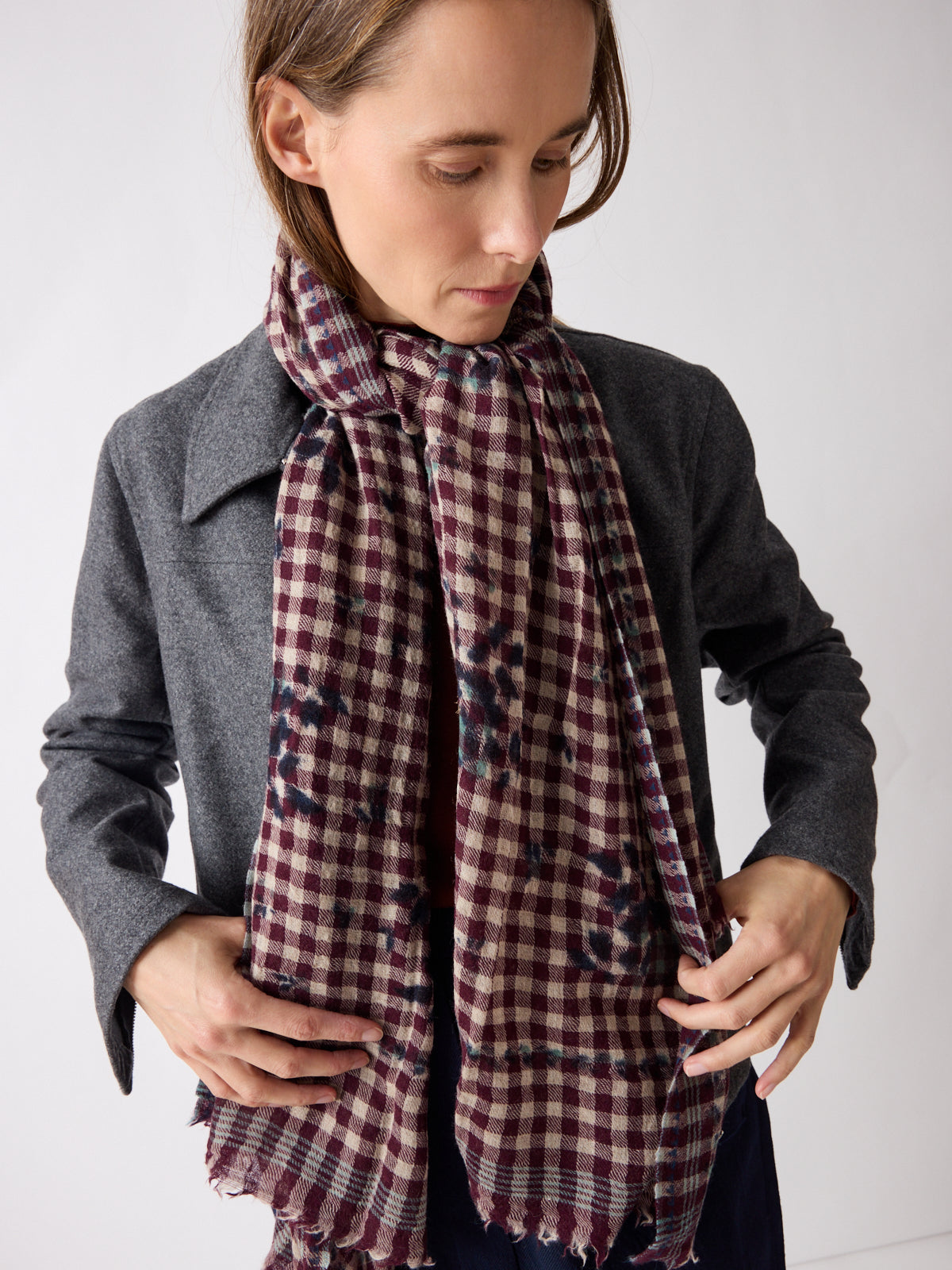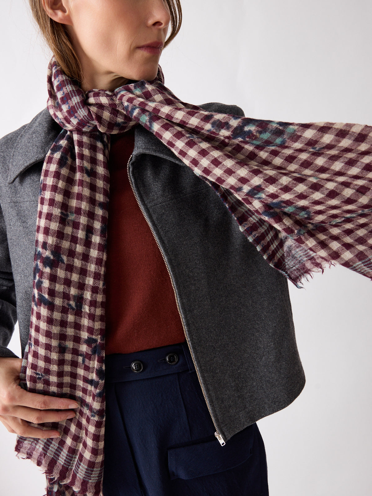 The Vichy scarf N°693 offers a subtle reinvention of a classic. Its small check pattern reimagines gingham in a refined palette of burgundy, natural cream, light blue, and lavender dark blue. Woven from fine wool, it has a fluid drape and light handle, making it ideal for mid-season wear.