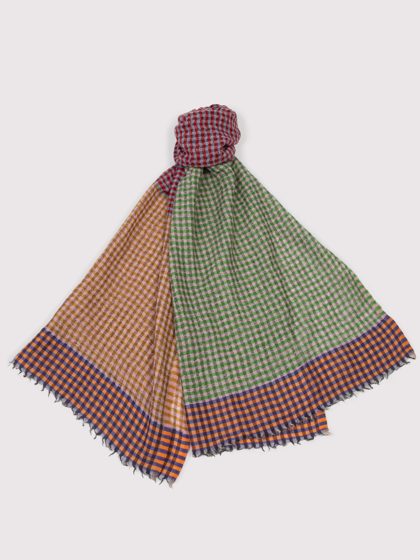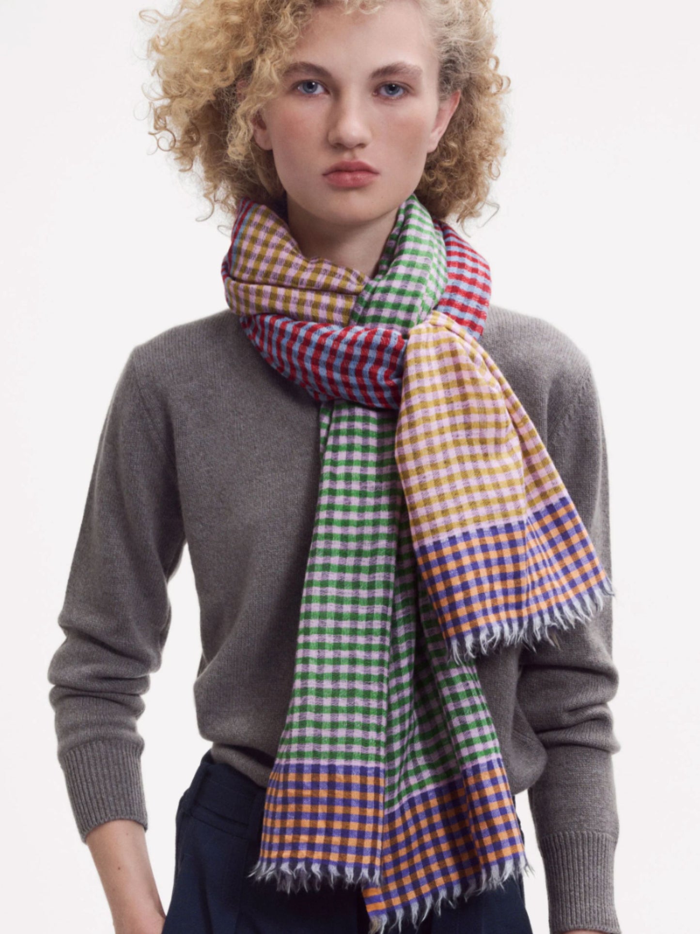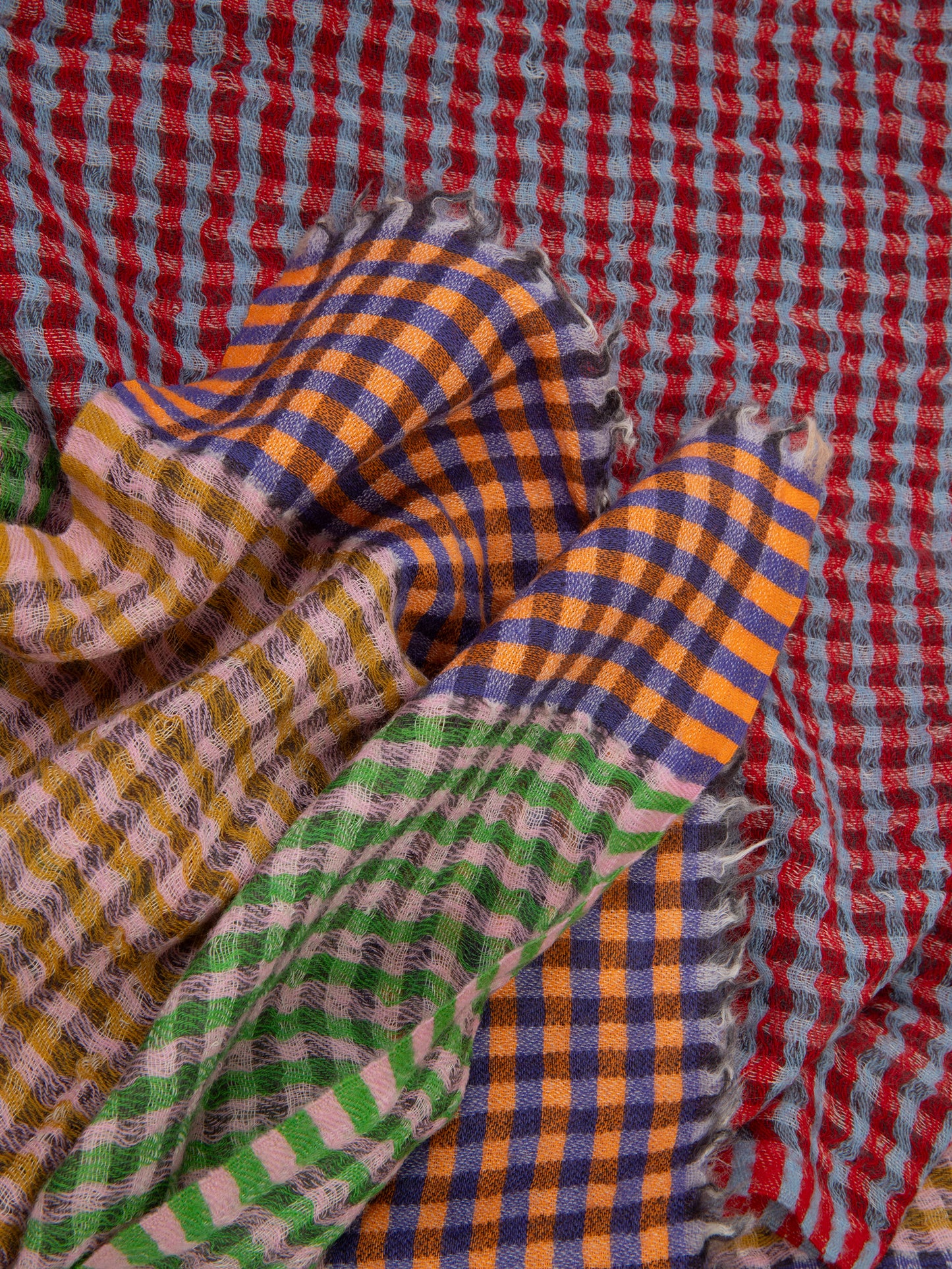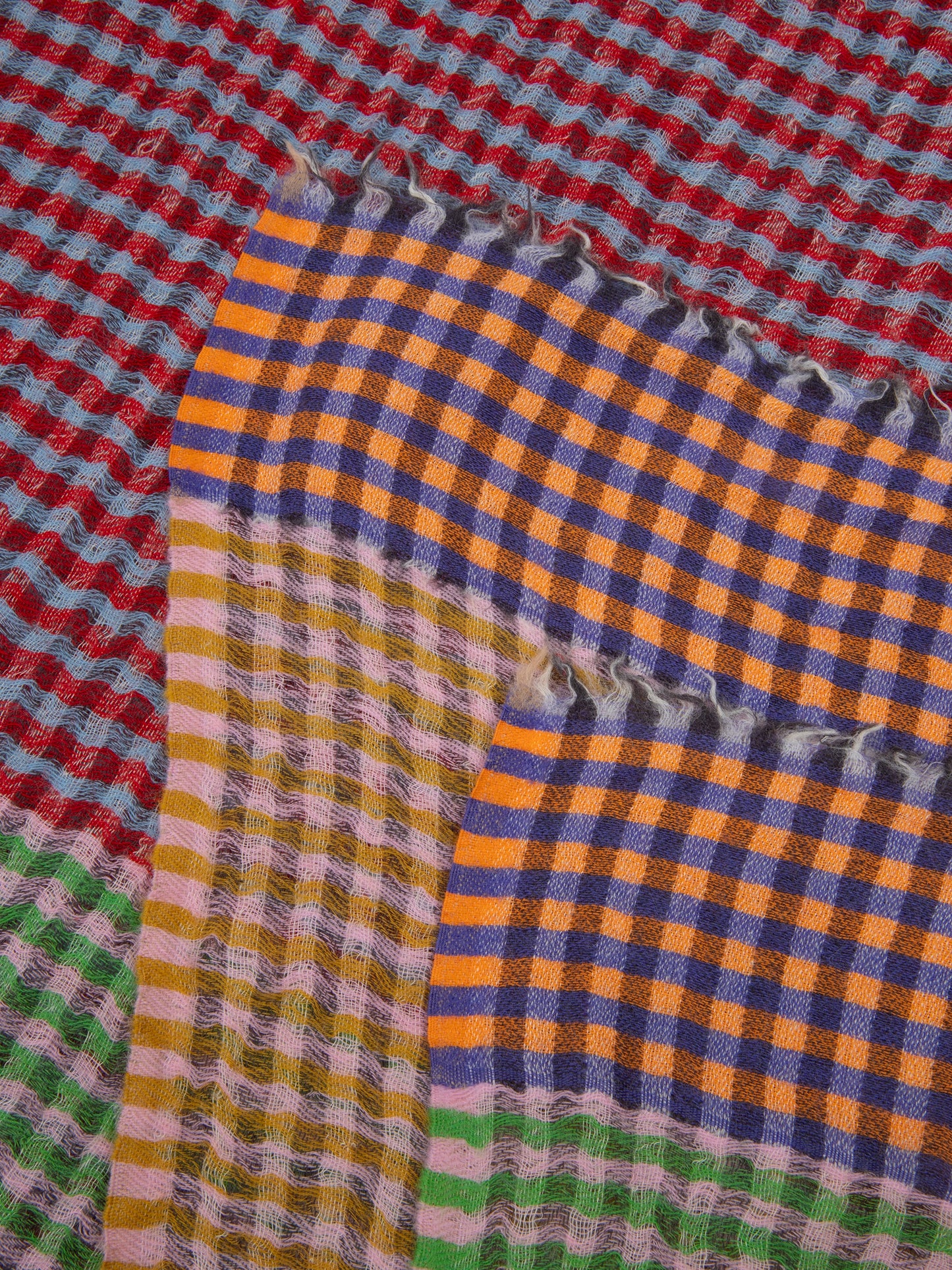 An expressive update on the check scarf, designed with layered checks in shifting scales and colours. Tones of mustard, salmon, green, taupe, orange, lavender blue, red, and light blue create a rich, multicoloured surface. Frayed edges give the stole a natural, unpolished finish.