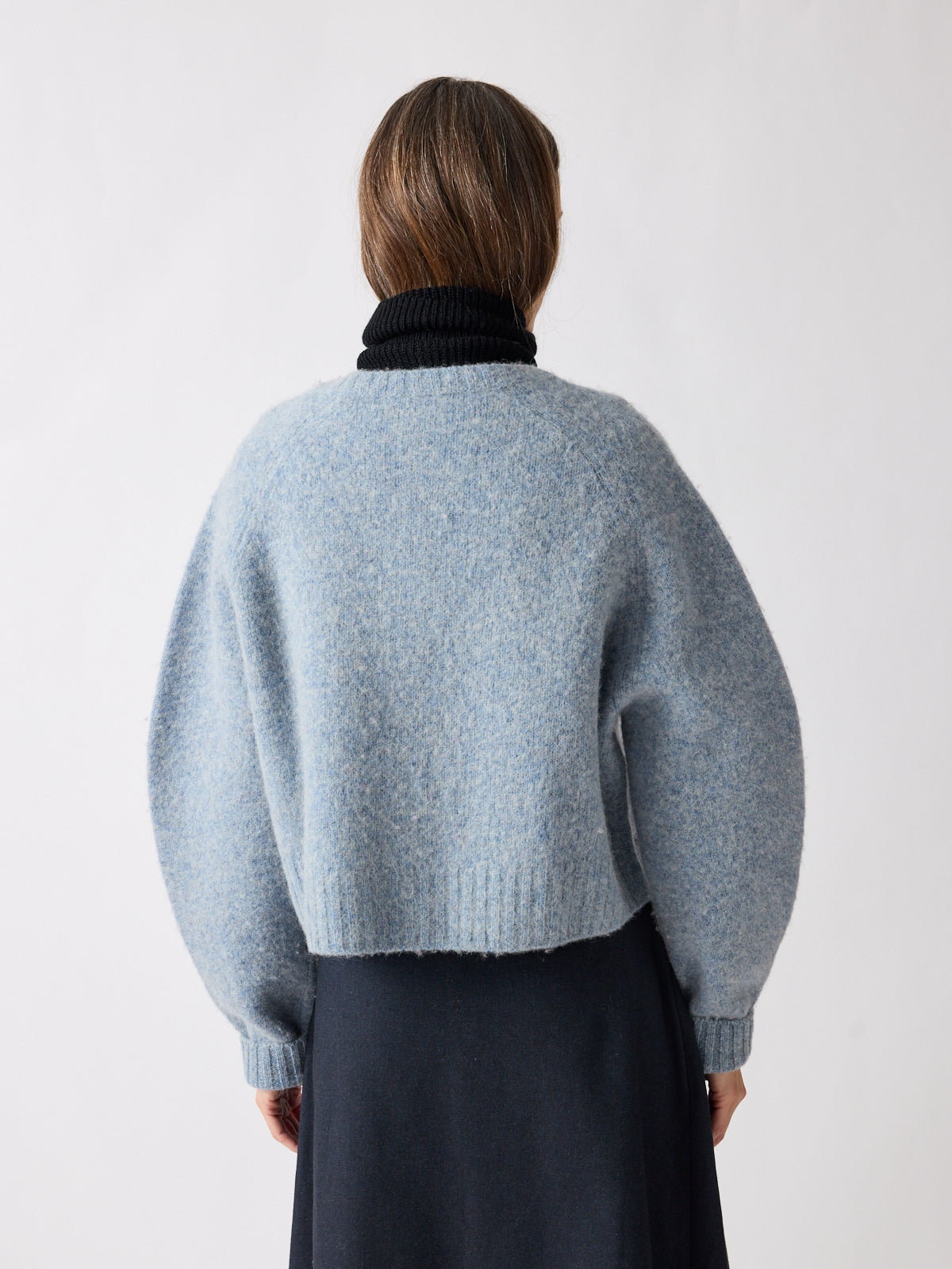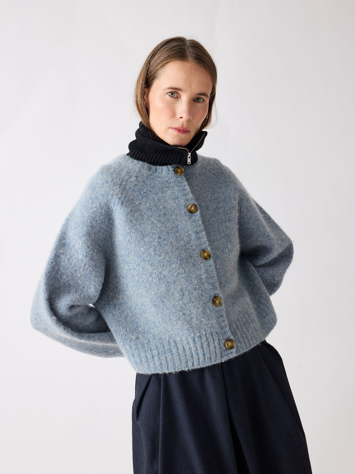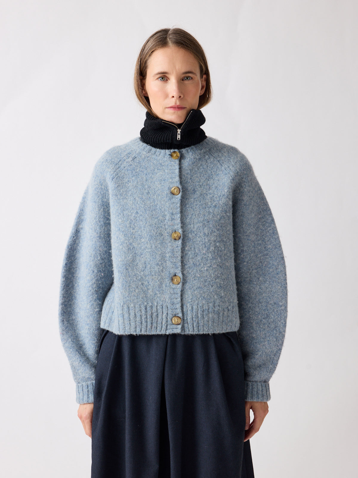 Soft in tone, strong in silhouette. This cropped cardigan in muted sky blue features balloon sleeves, raglan shoulders, and a boxy fit for a playful shape. Crafted from gently boiled pure wool, its felted texture and generously sized contrasting buttons lend a tactile depth. Pair with the matching Vien beret or gilet.