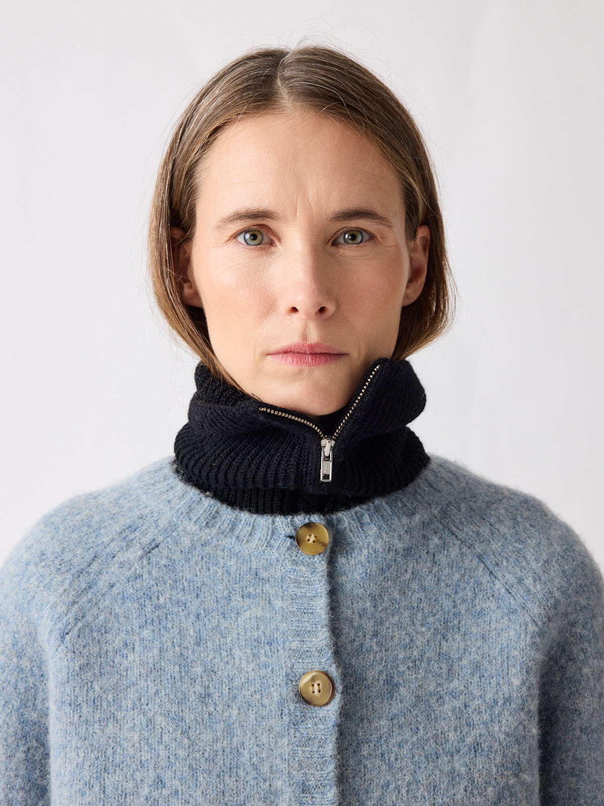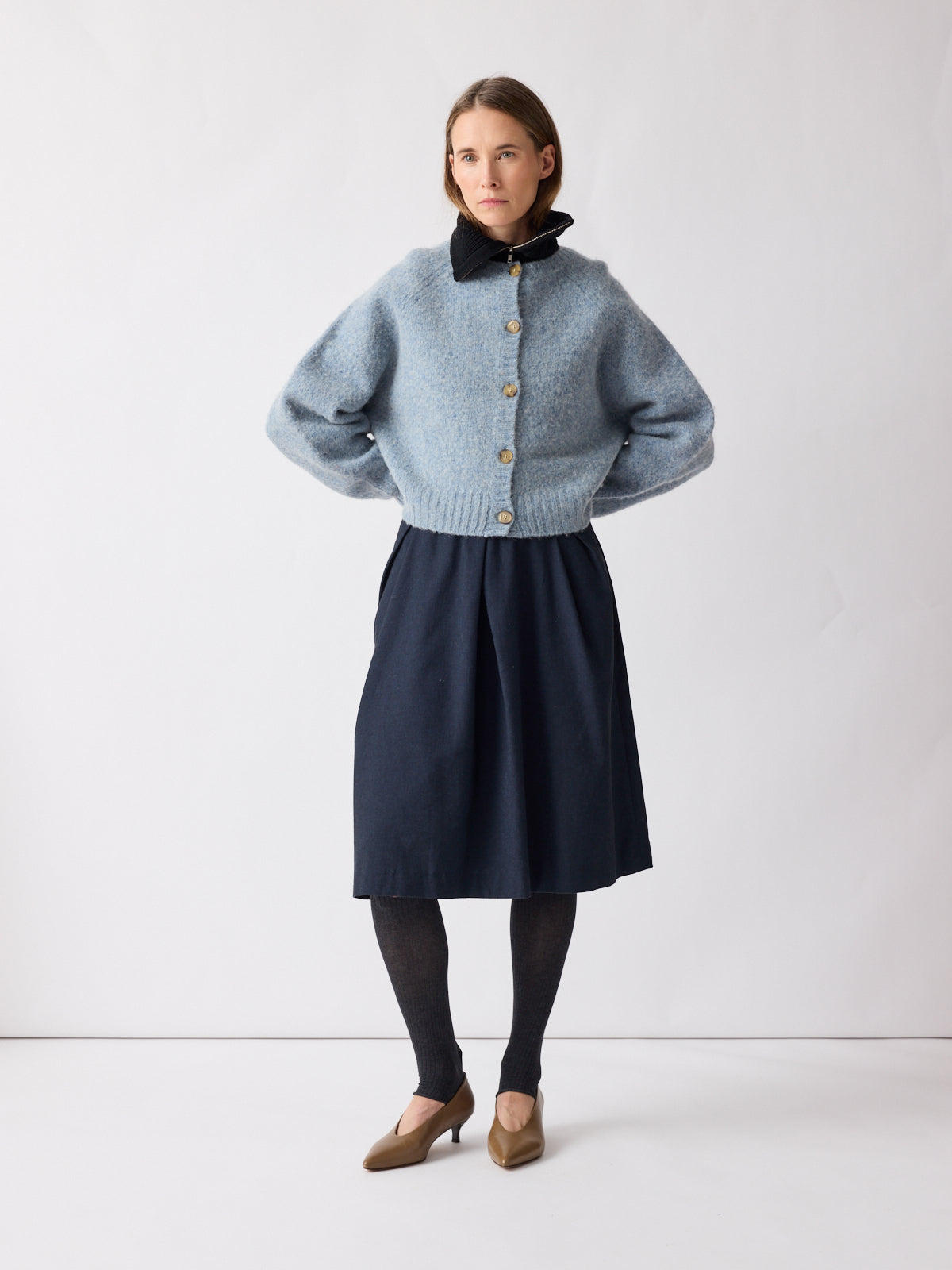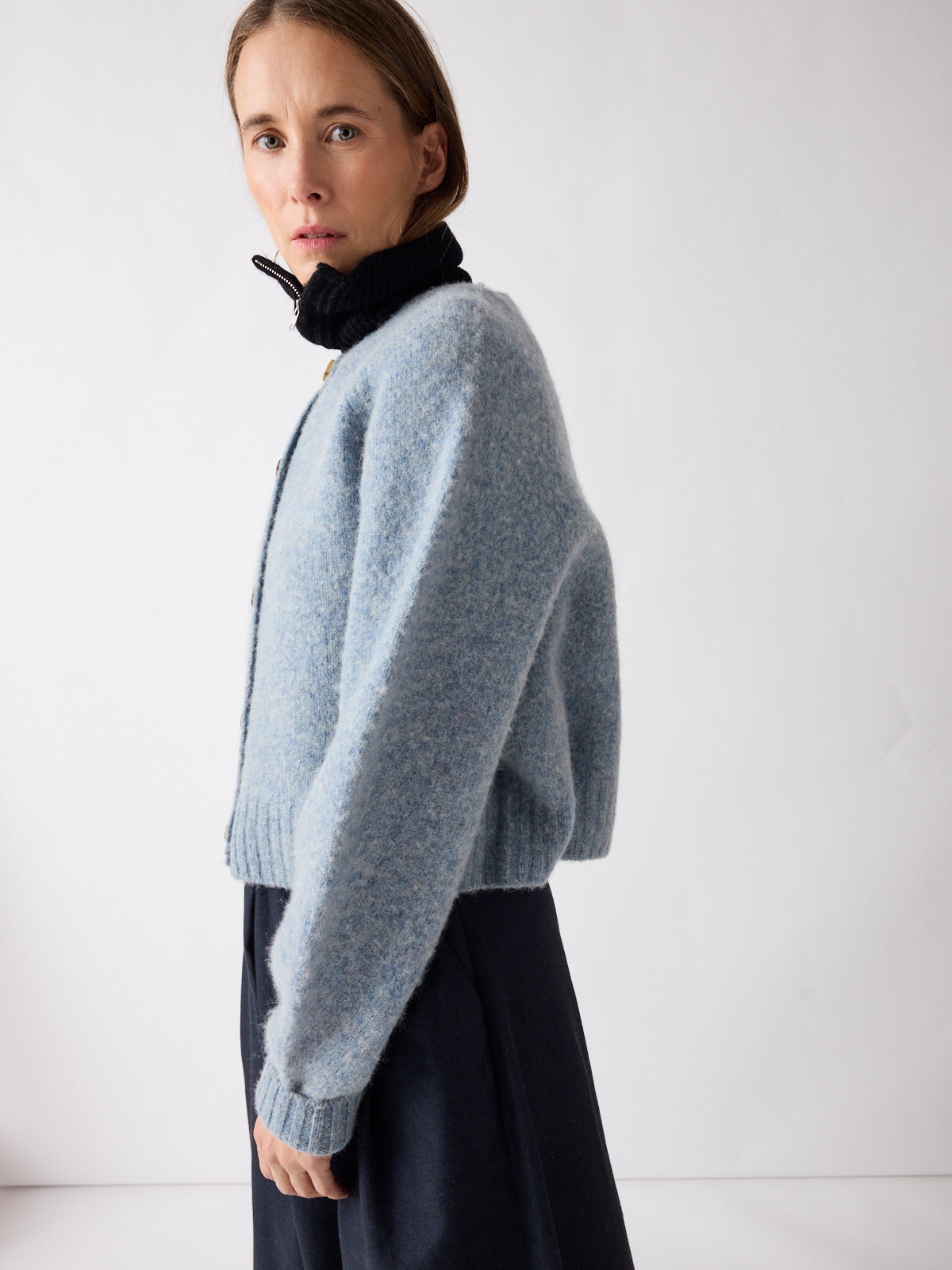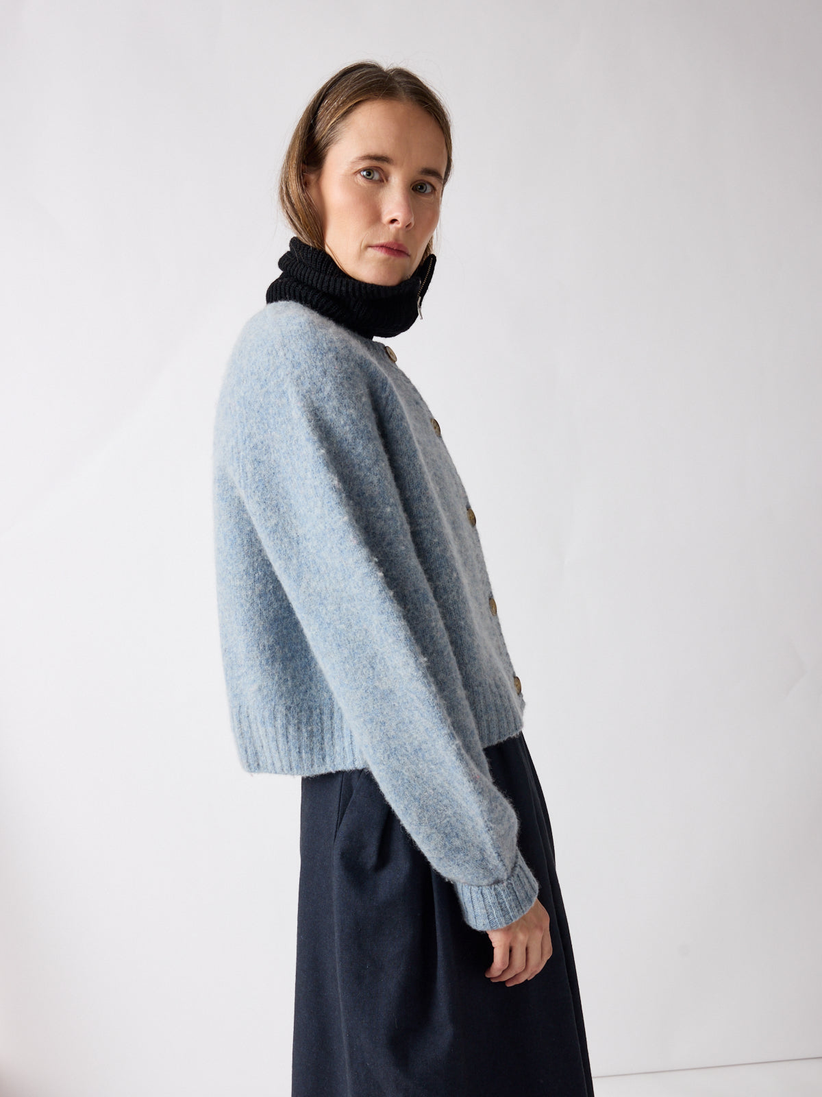 Soft in tone, strong in silhouette. This cropped cardigan in muted sky blue features balloon sleeves, raglan shoulders, and a boxy fit for a playful shape. Crafted from gently boiled pure wool, its felted texture and generously sized contrasting buttons lend a tactile depth. Pair with the matching Vien beret or gilet.