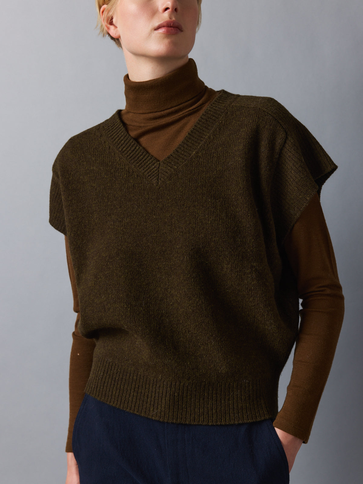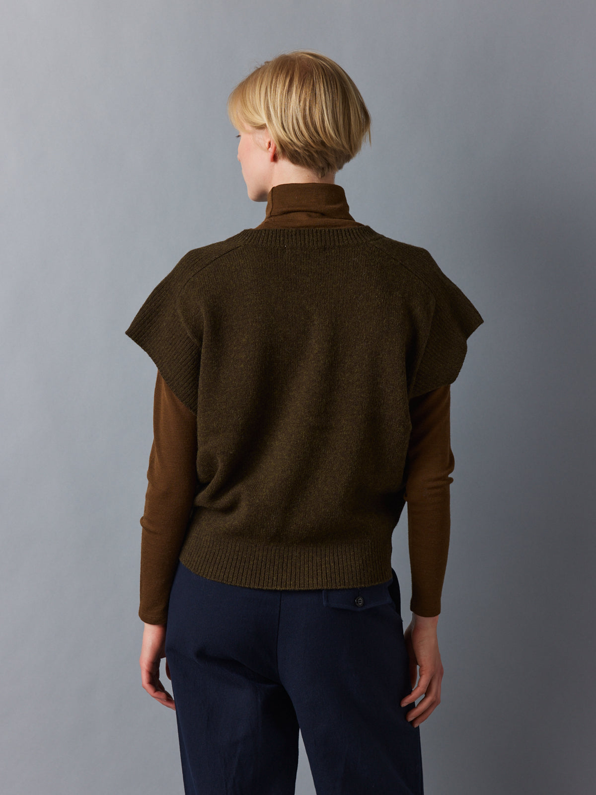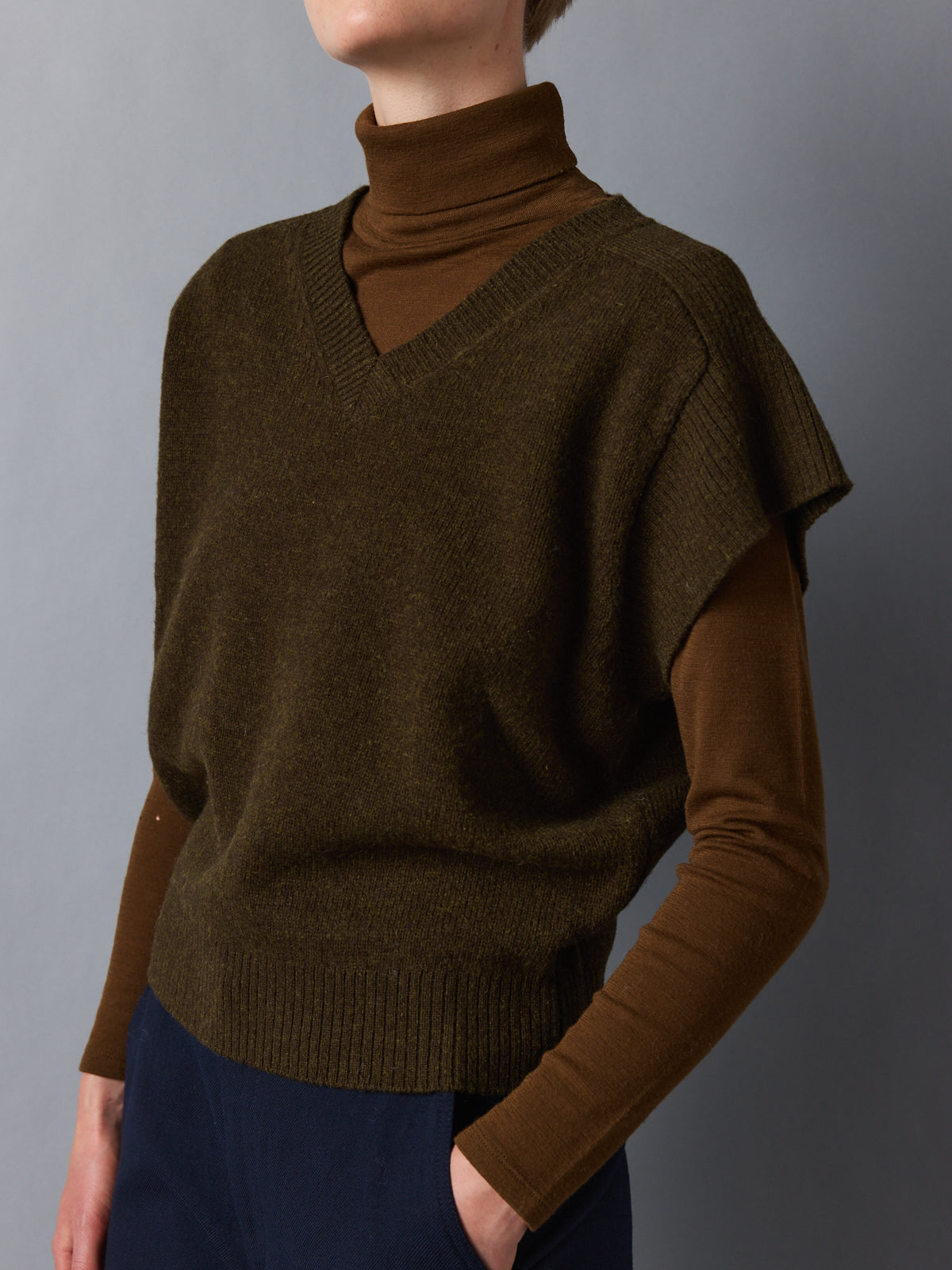 A layering piece with impact. This oversized sweater vest in deep khaki combines a sculptural silhouette with an earthy, refined hue. The cap sleeve effect boldens the shoulder line, while the fitted waistband offers subtle shape. Crafted from thick 100% wool, it provides weight, warmth, and winter-ready elegance.