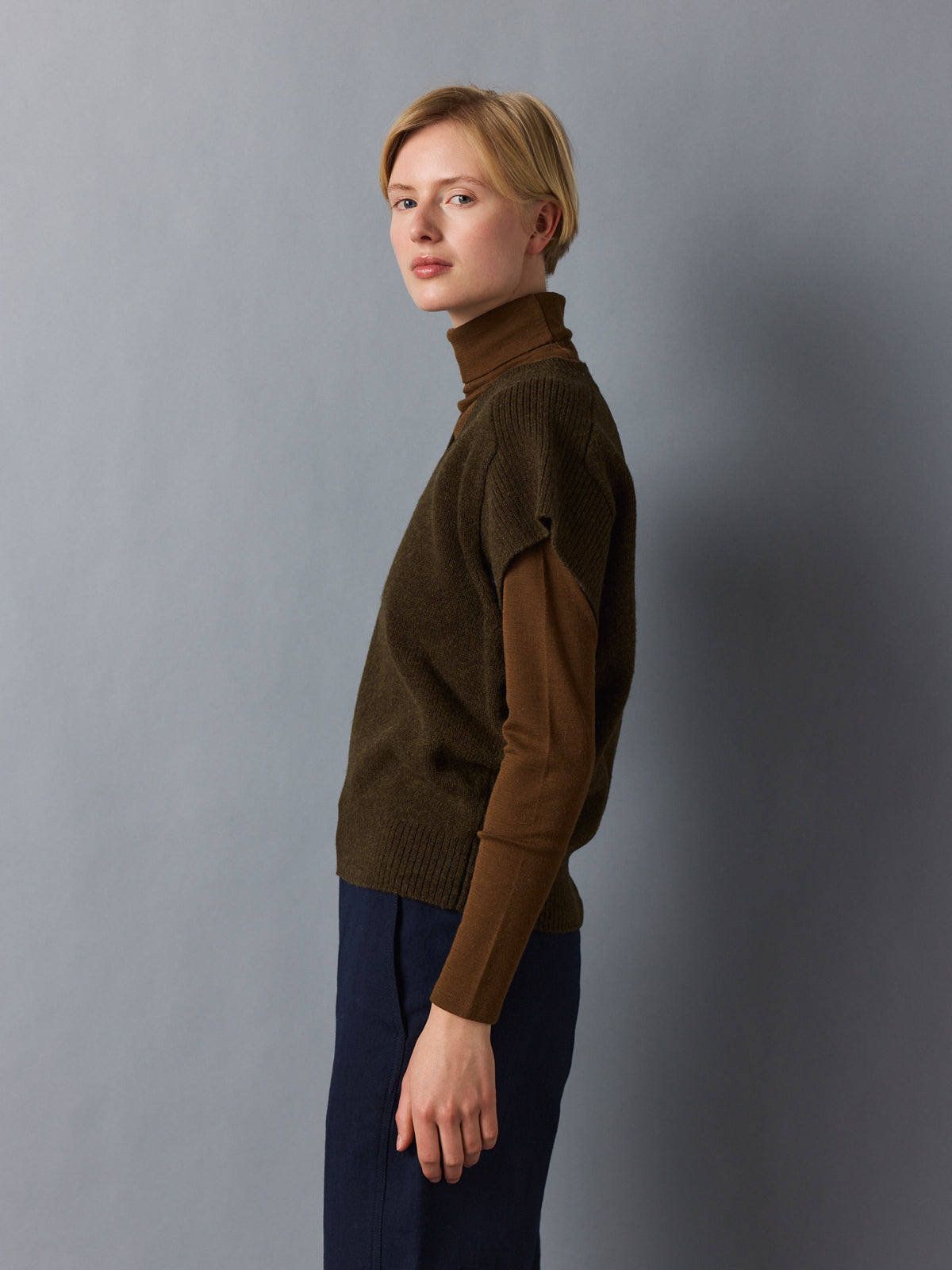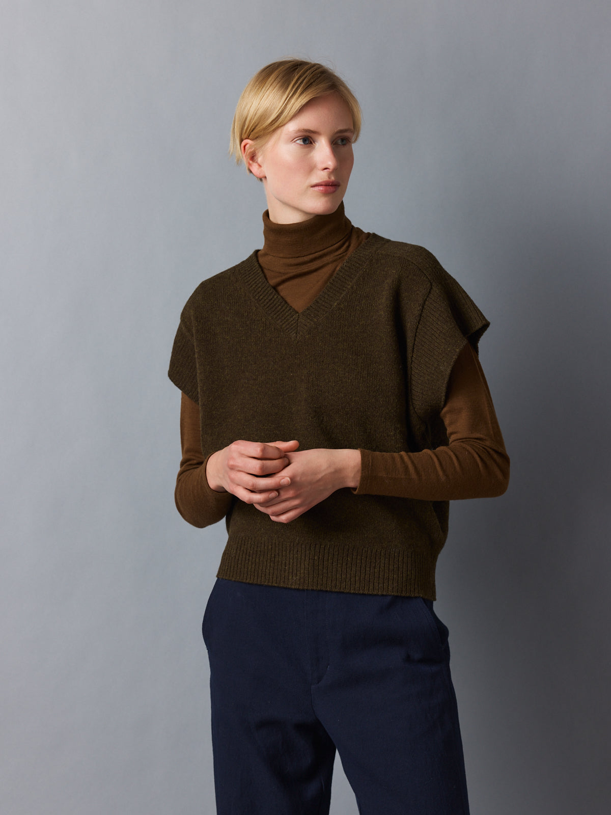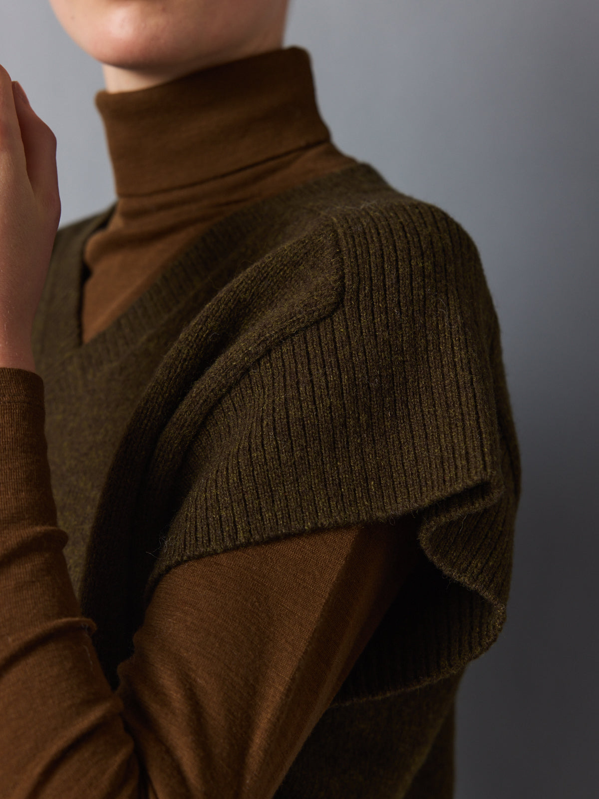A layering piece with impact. This oversized sweater vest in deep khaki combines a sculptural silhouette with an earthy, refined hue. The cap sleeve effect boldens the shoulder line, while the fitted waistband offers subtle shape. Crafted from thick 100% wool, it provides weight, warmth, and winter-ready elegance.
