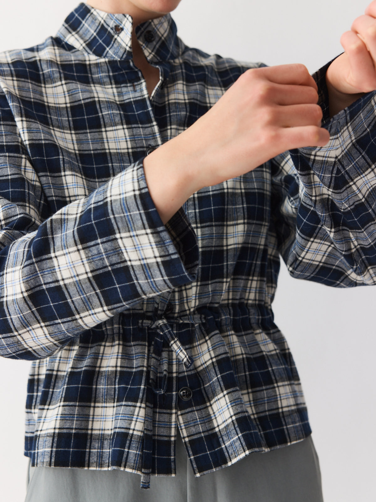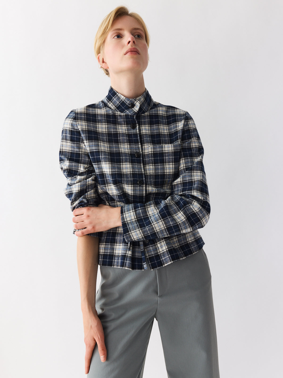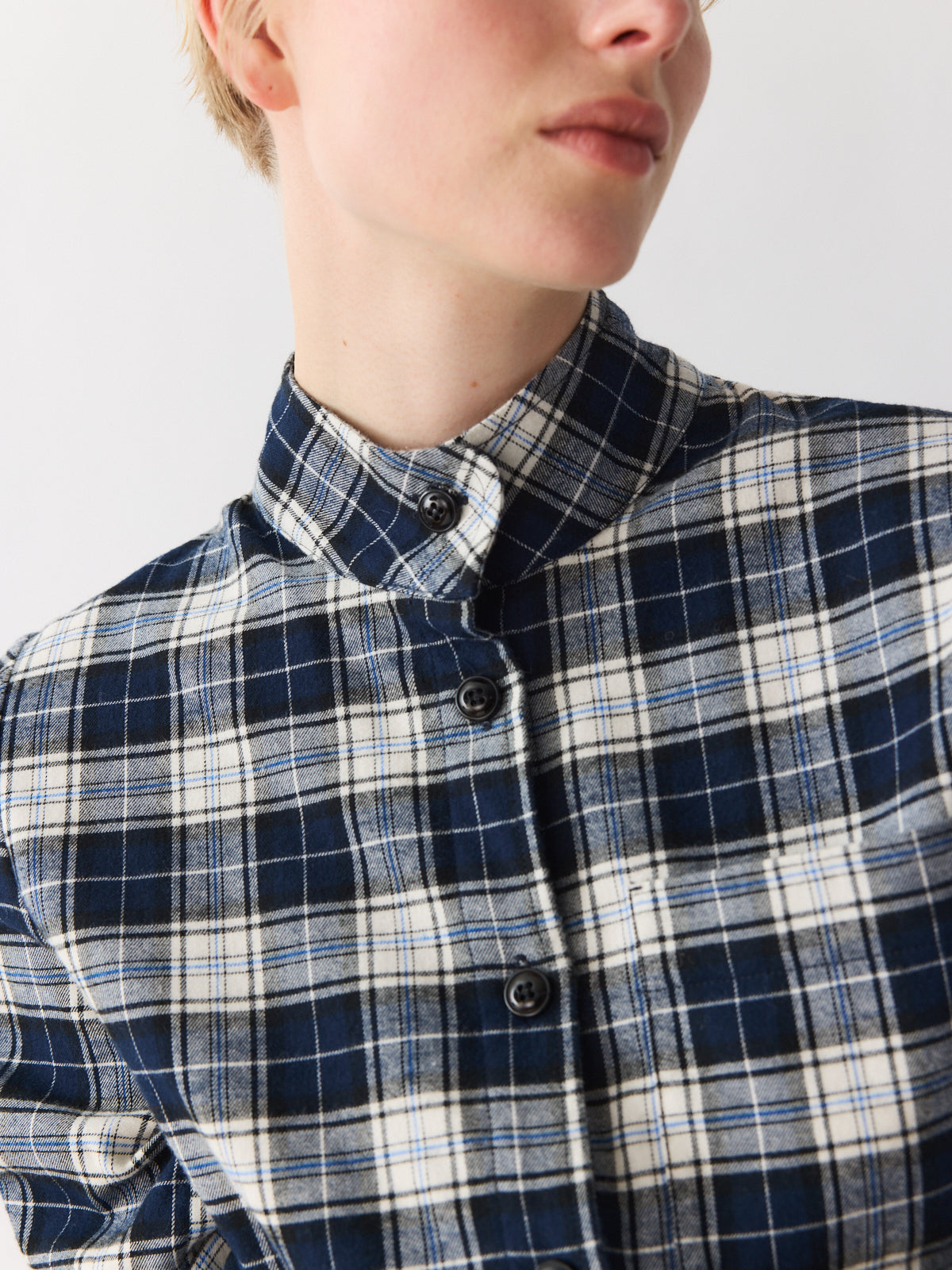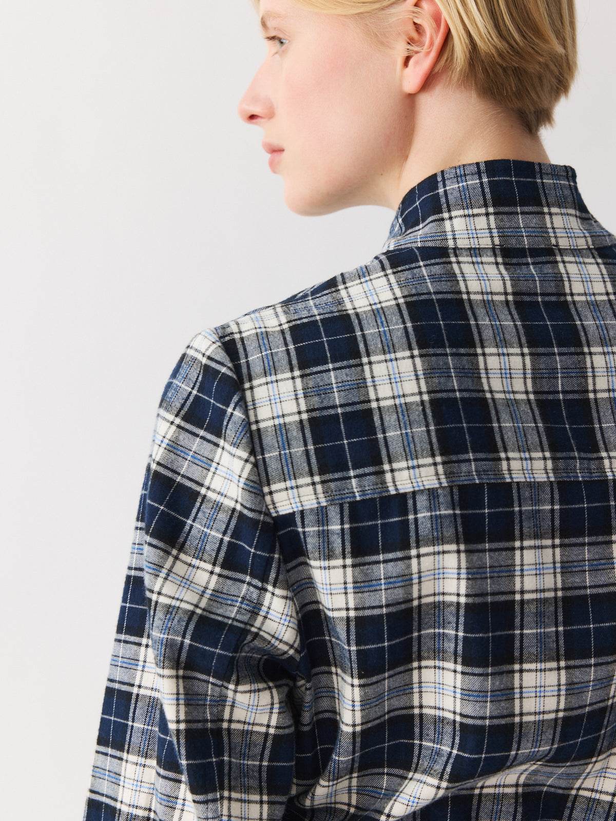 A contemporary take on a familiar classic. This straight-fit blouse is cut from soft 100% cotton flannel with a navy, ecru, and bright blue check. Refined, urban, and versatile.