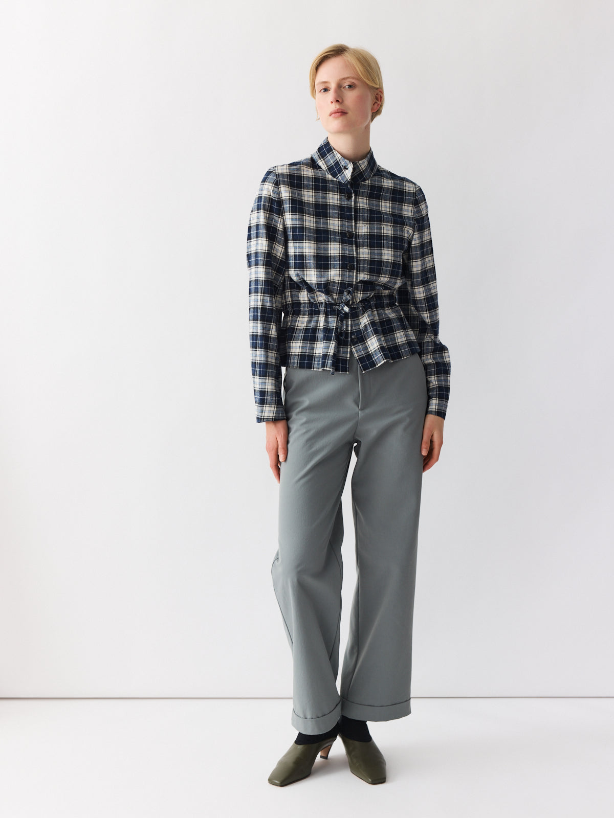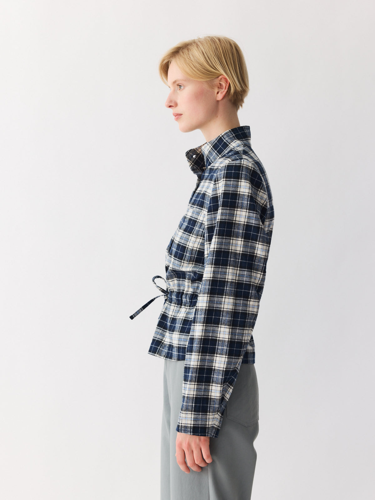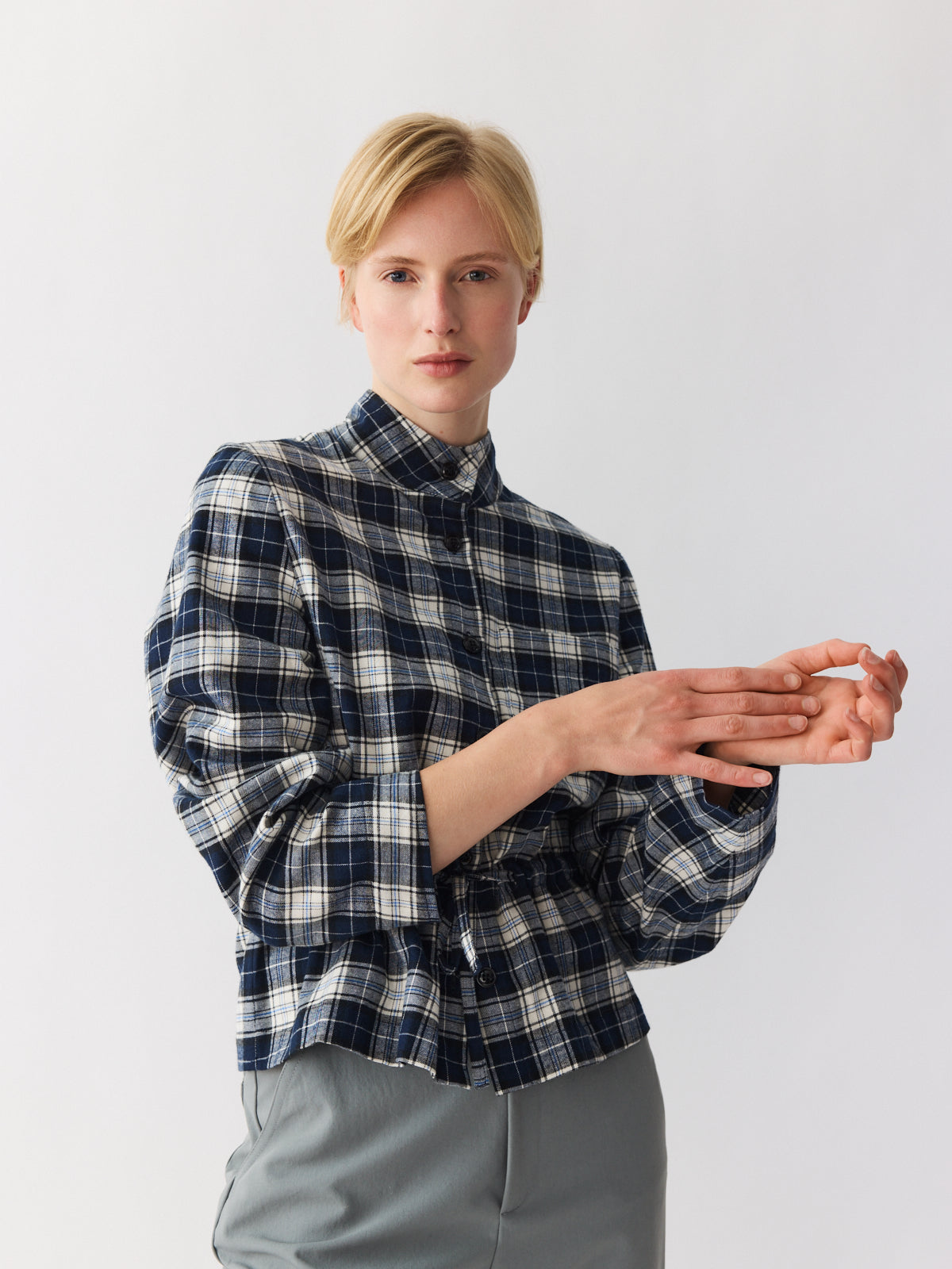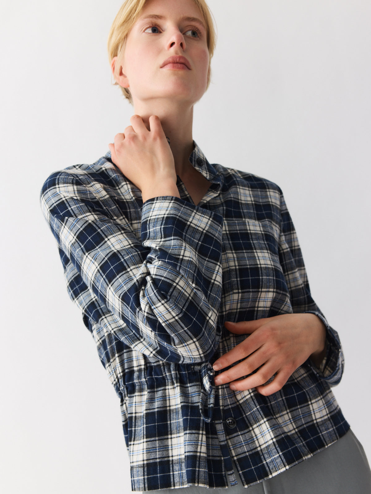 A contemporary take on a familiar classic. This straight-fit blouse is cut from soft 100% cotton flannel with a navy, ecru, and bright blue check. Refined, urban, and versatile.