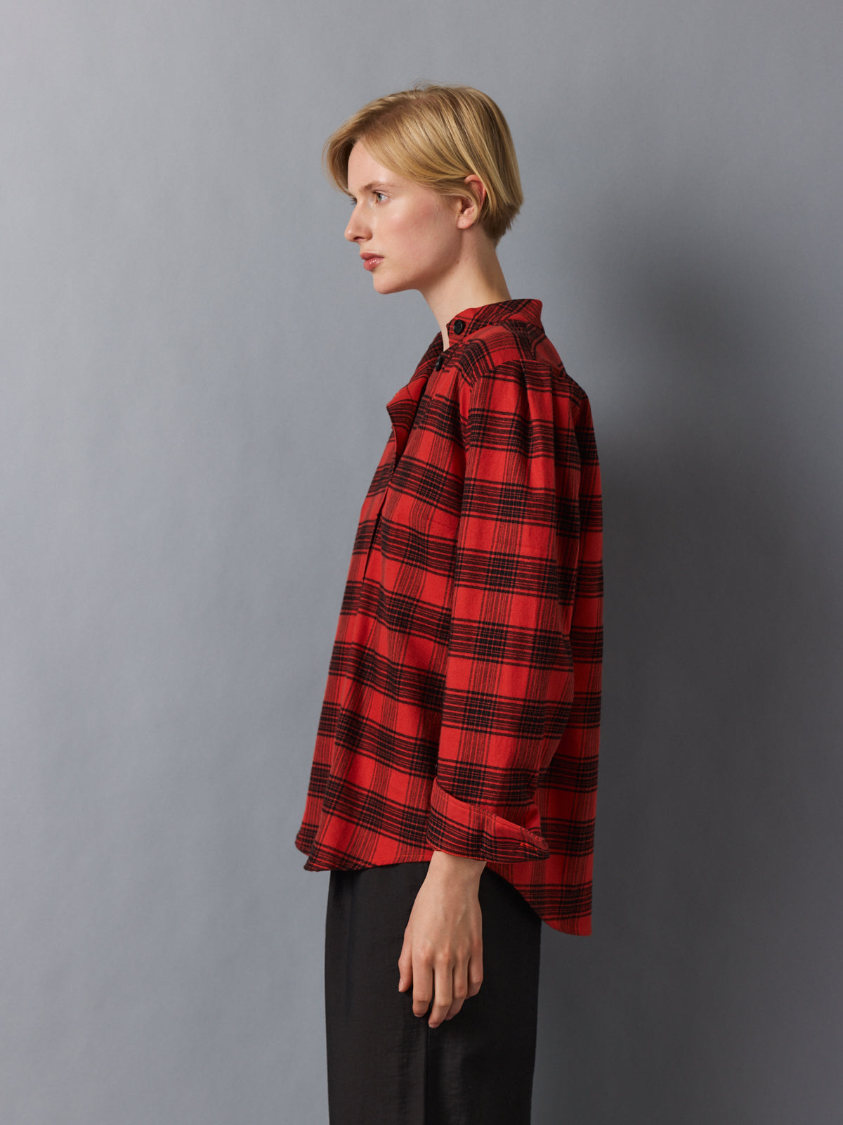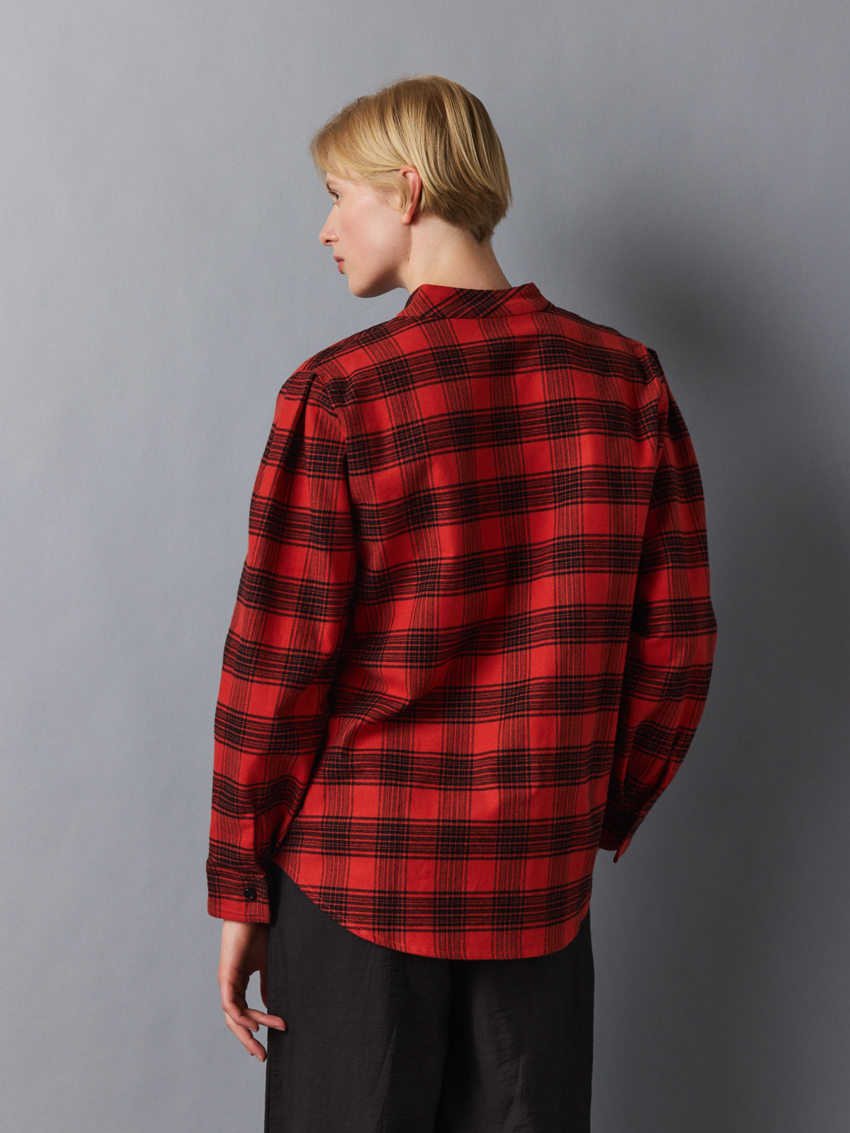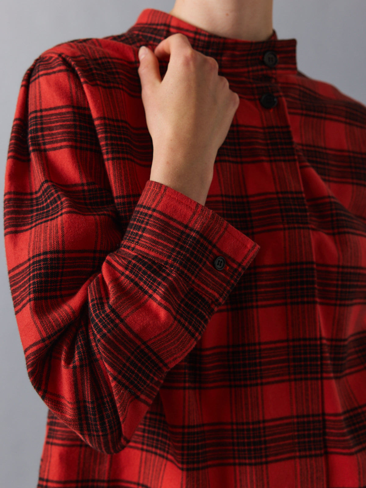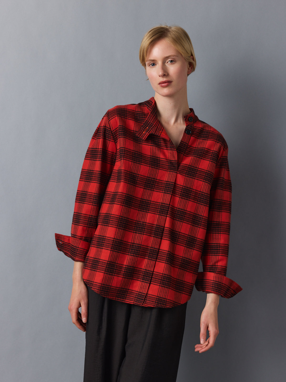 Crafted from a soft flannel-like cotton, this checked shirt reimagines a classic lumberjack pattern in warm red and black. The mock stand collar opens into an asymmetric V-neckline, while subtle folds at the shoulders add volume to its relaxed silhouette. A tactile, easy layer with presence.
