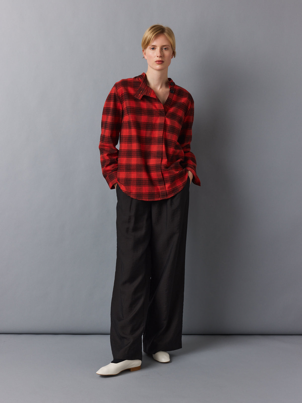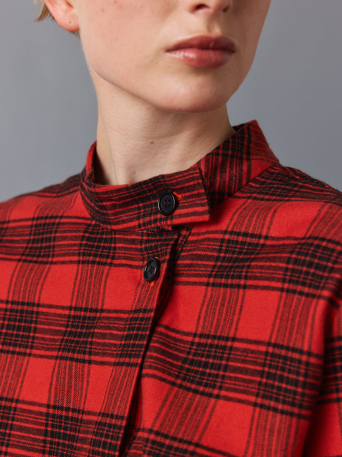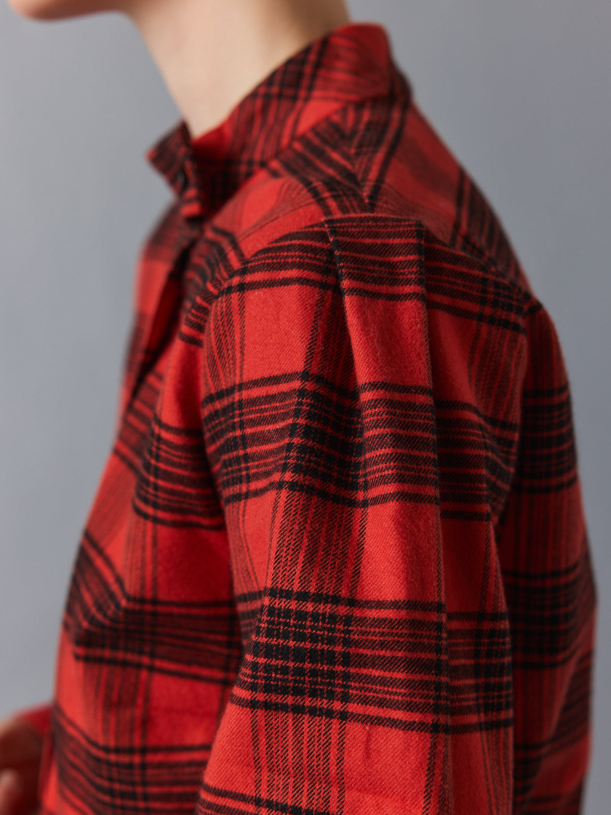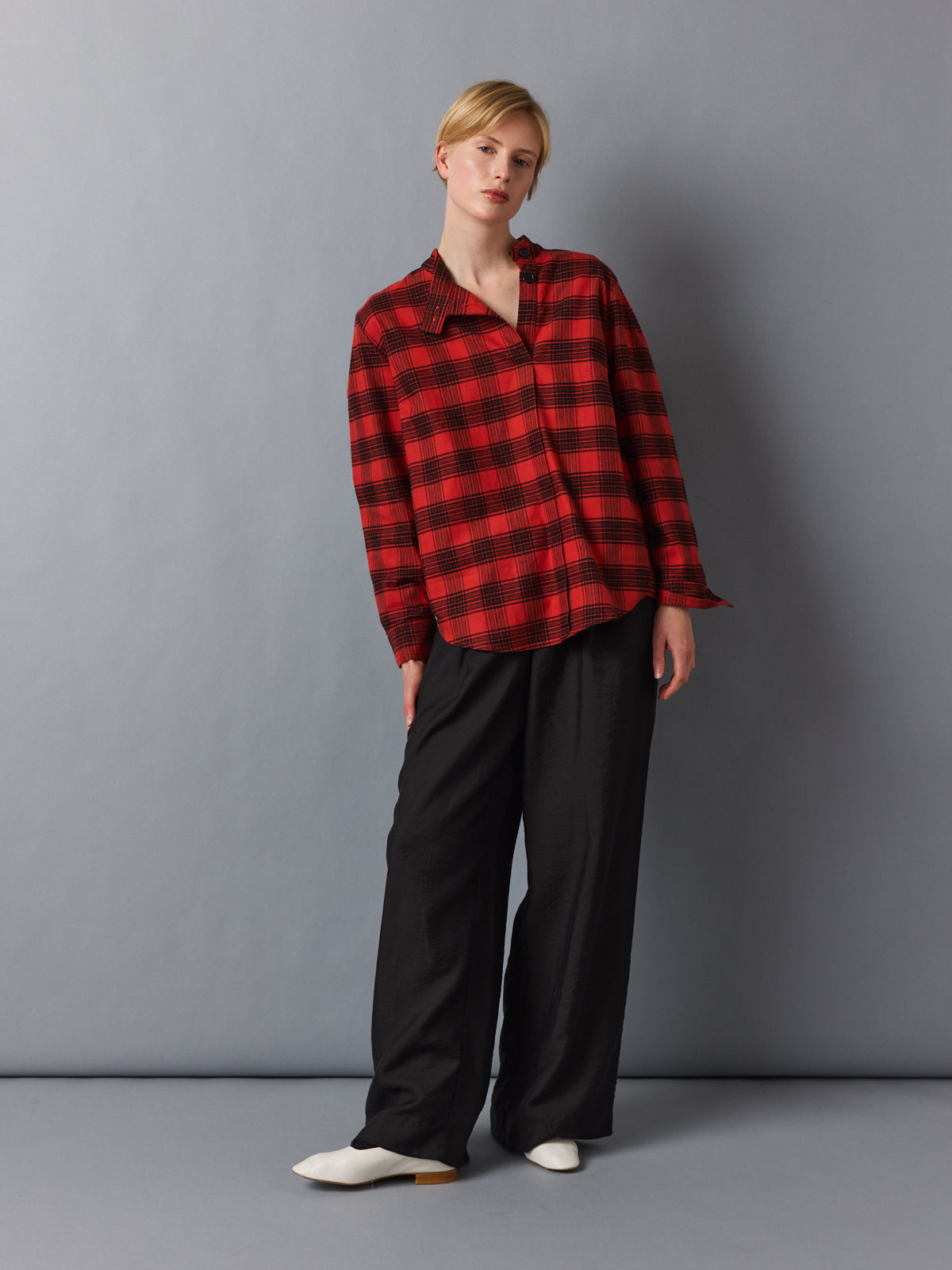 Crafted from a soft flannel-like cotton, this checked shirt reimagines a classic lumberjack pattern in warm red and black. The mock stand collar opens into an asymmetric V-neckline, while subtle folds at the shoulders add volume to its relaxed silhouette. A tactile, easy layer with presence.
