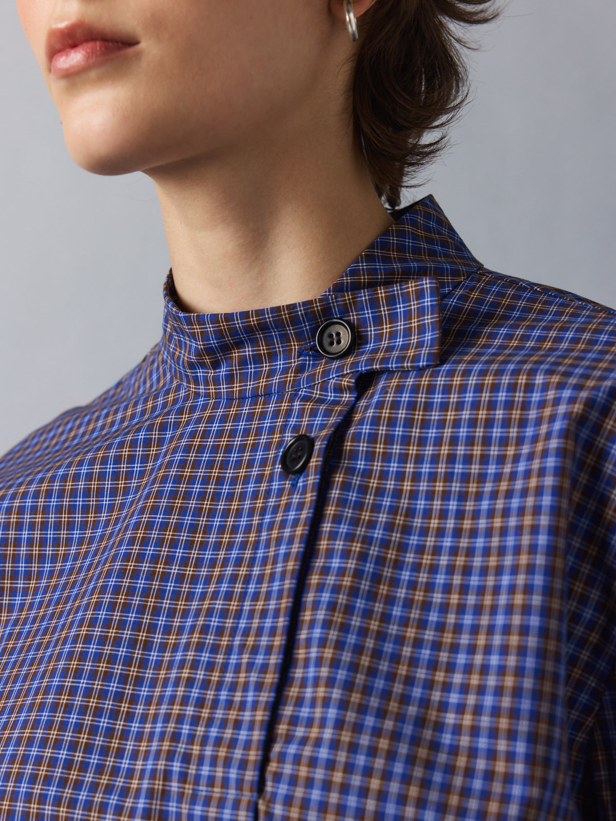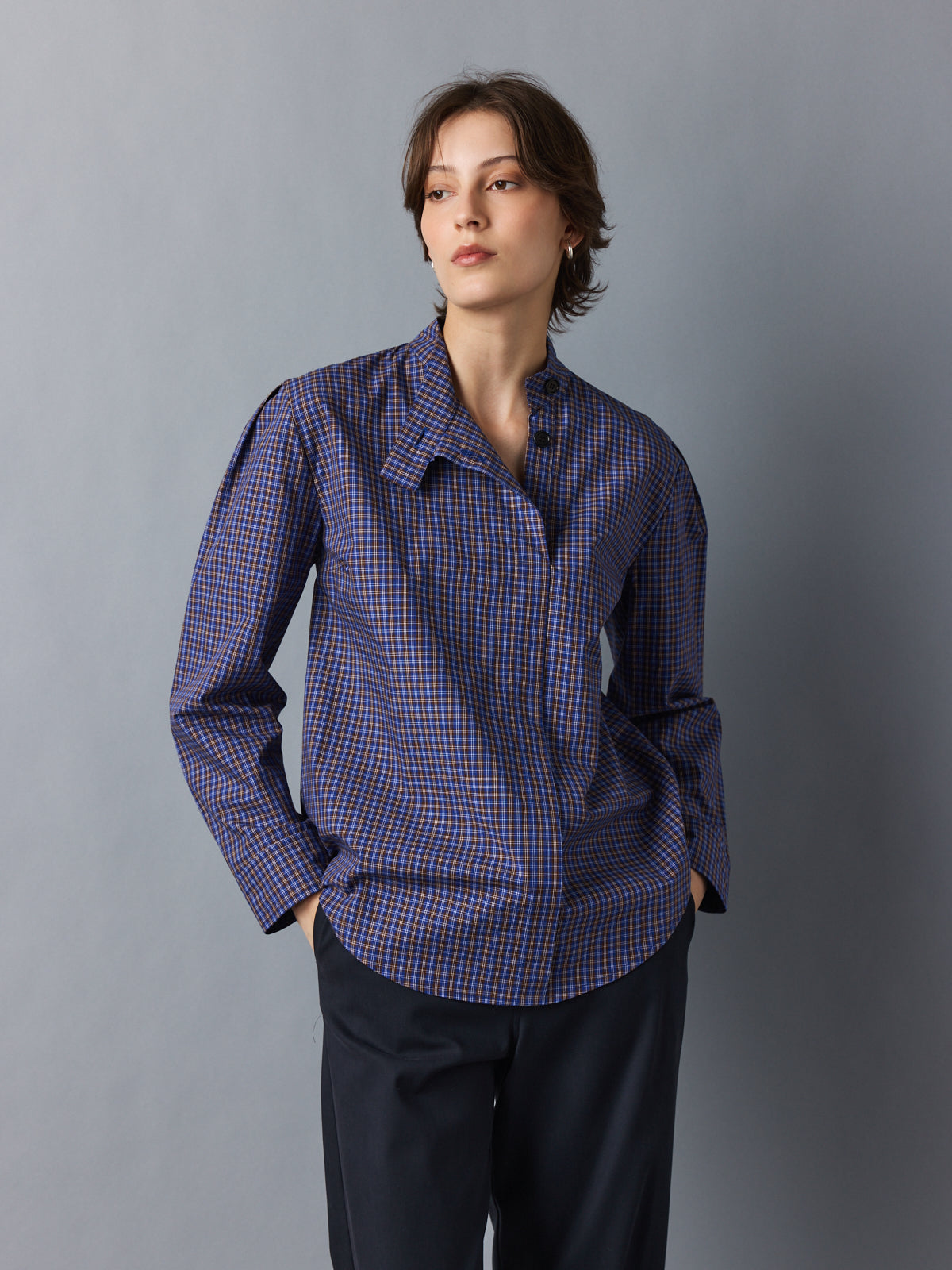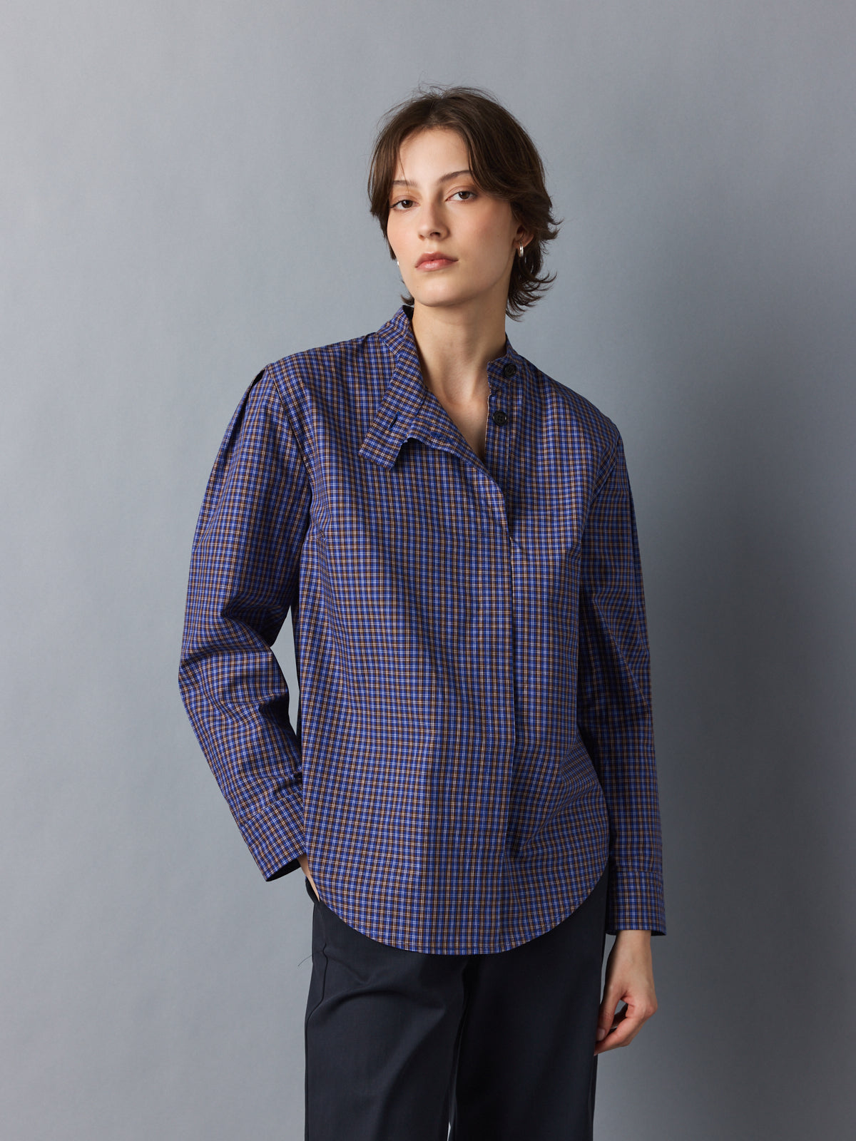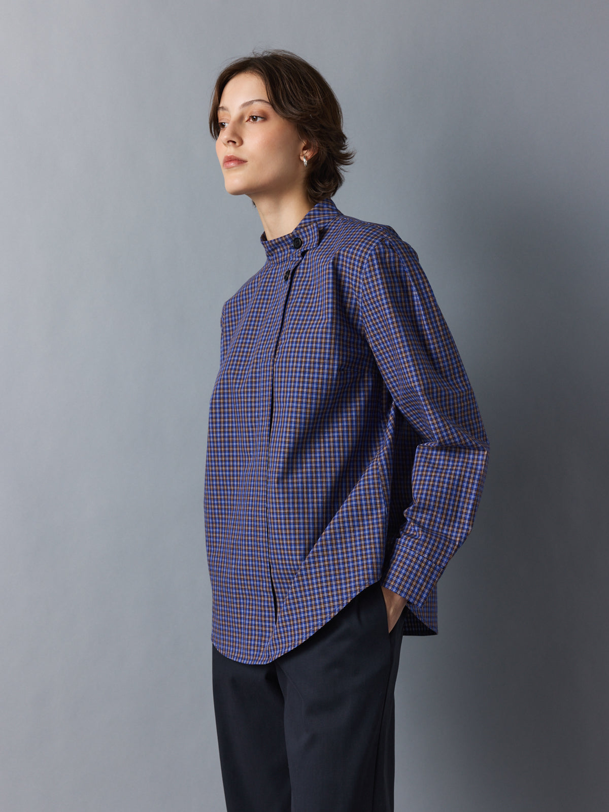 A fabric that catches the eye. This shirt is cut from pure cotton in a small-scale check of royal blue, warm brown, and ecru, a striking but wearable combination. The relaxed silhouette, asymmetric neckline, and subtle shoulder folds bring modern ease to the bold pattern.