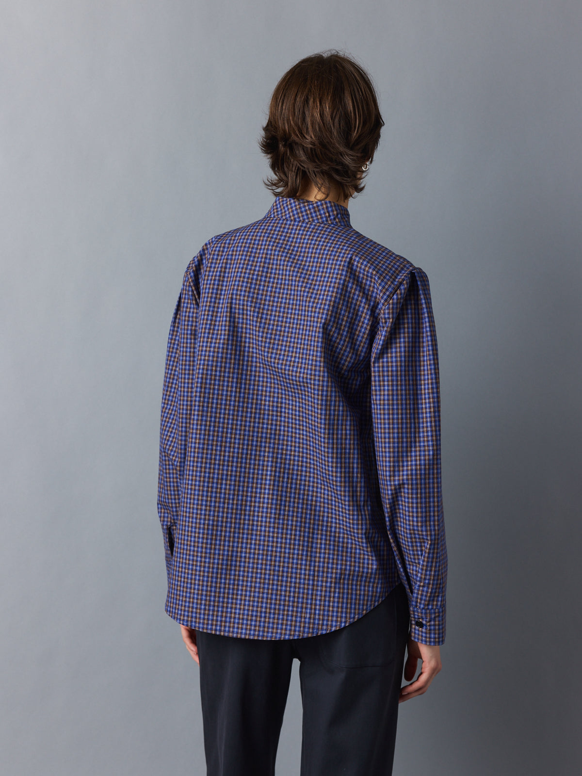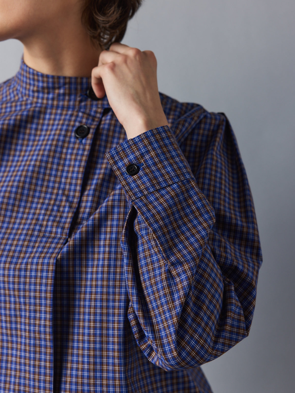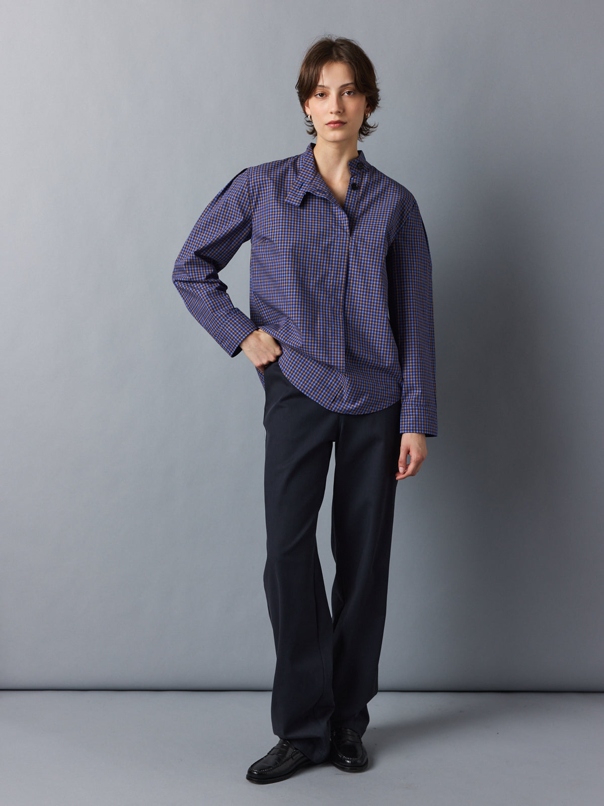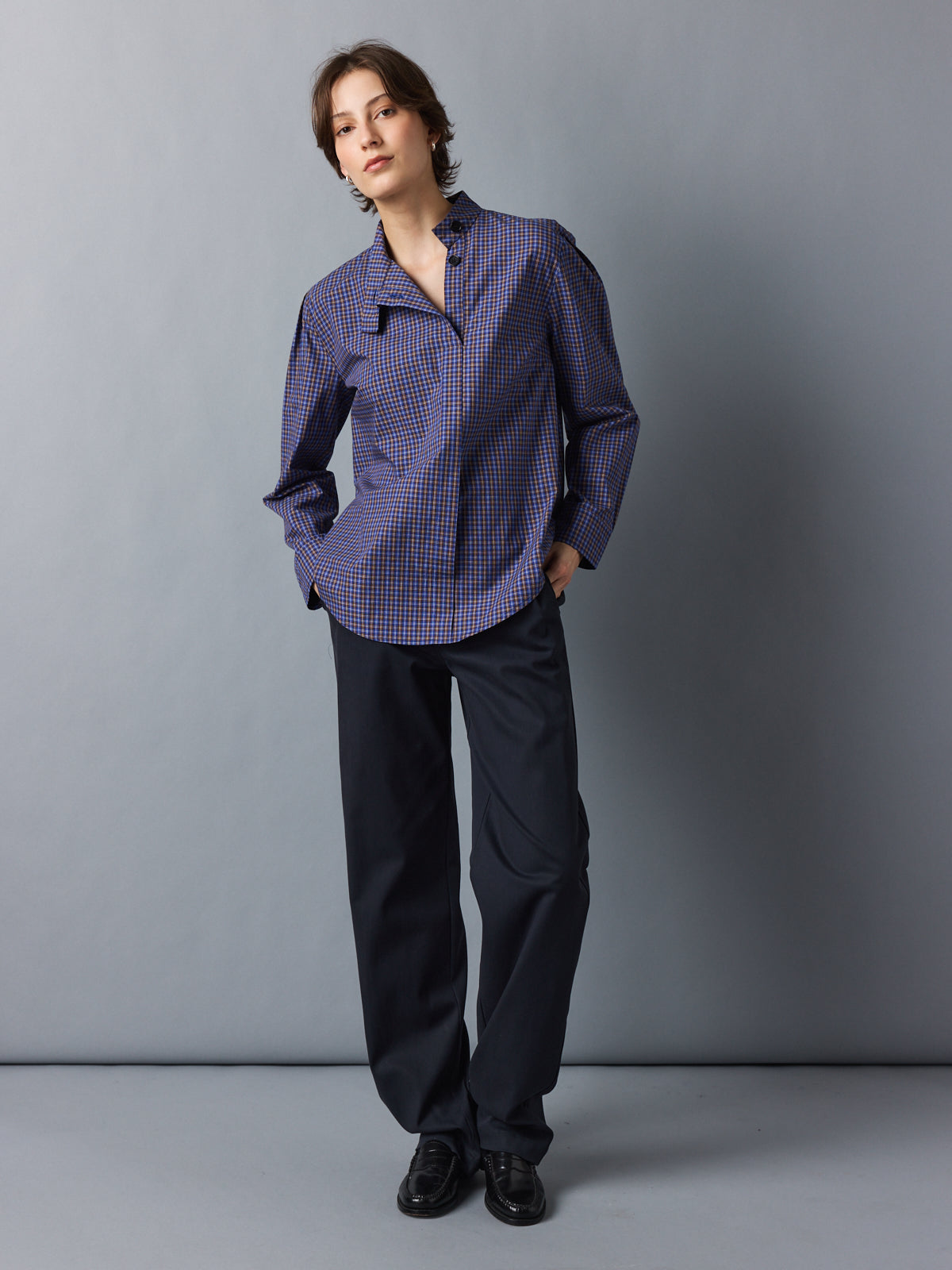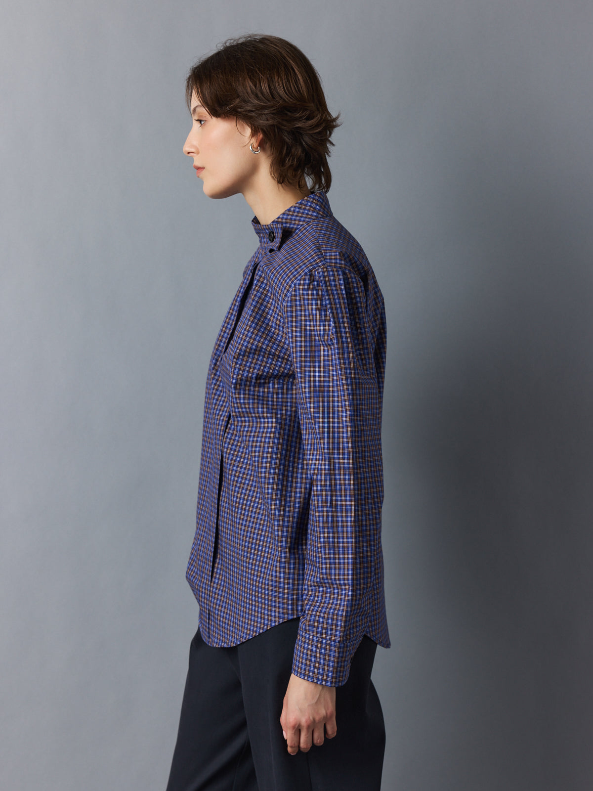 A fabric that catches the eye. This shirt is cut from pure cotton in a small-scale check of royal blue, warm brown, and ecru, a striking but wearable combination. The relaxed silhouette, asymmetric neckline, and subtle shoulder folds bring modern ease to the bold pattern.