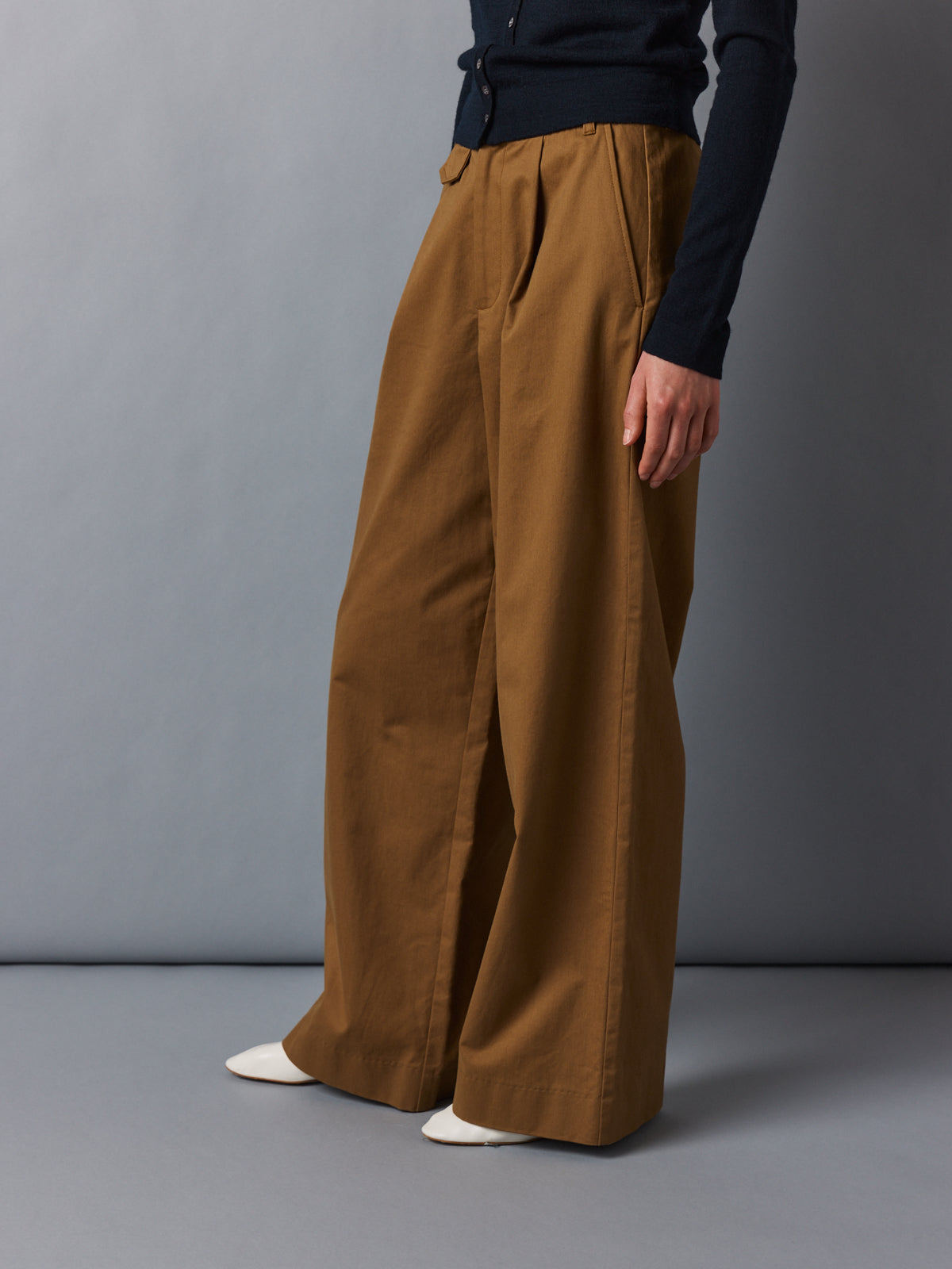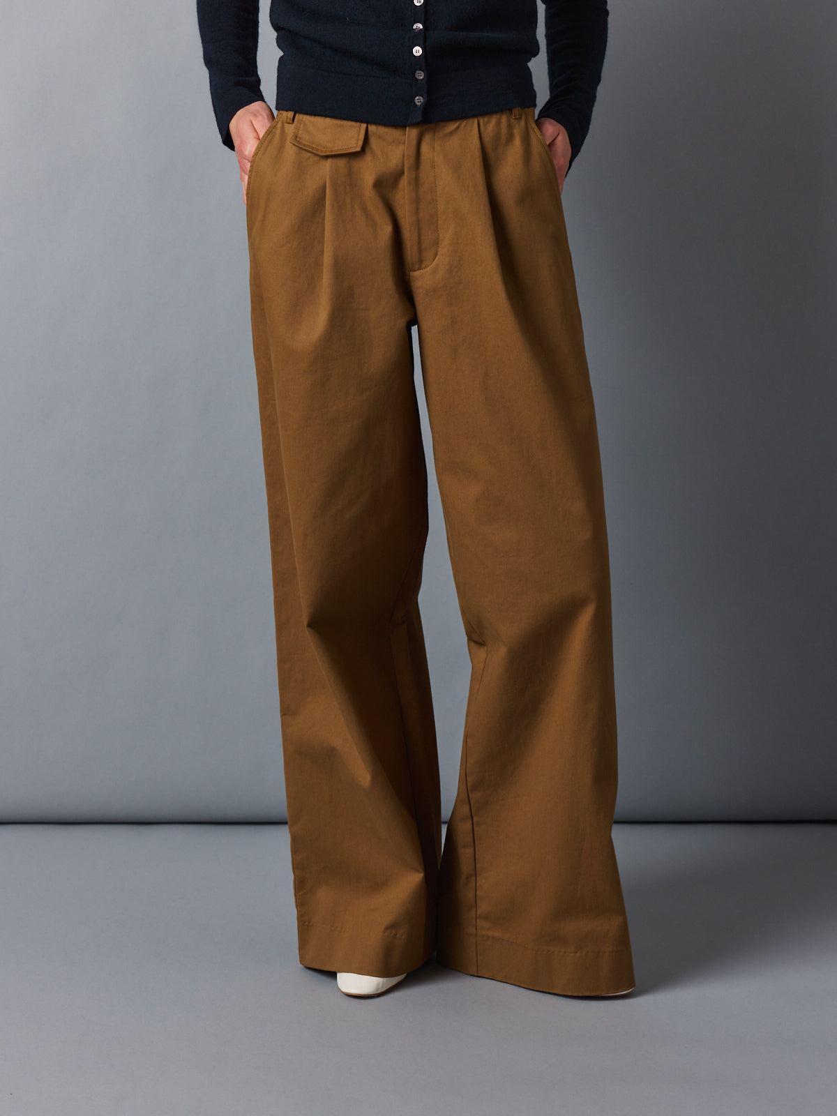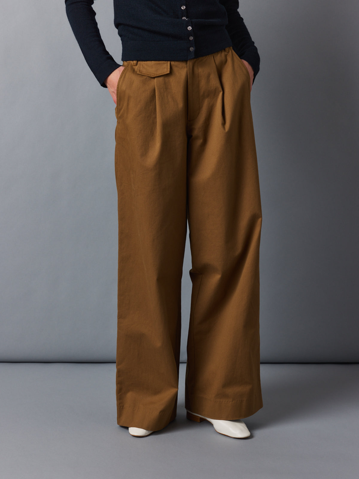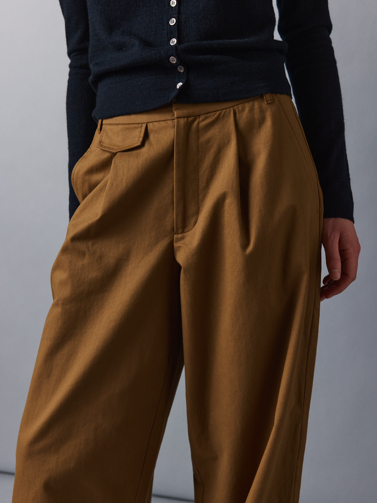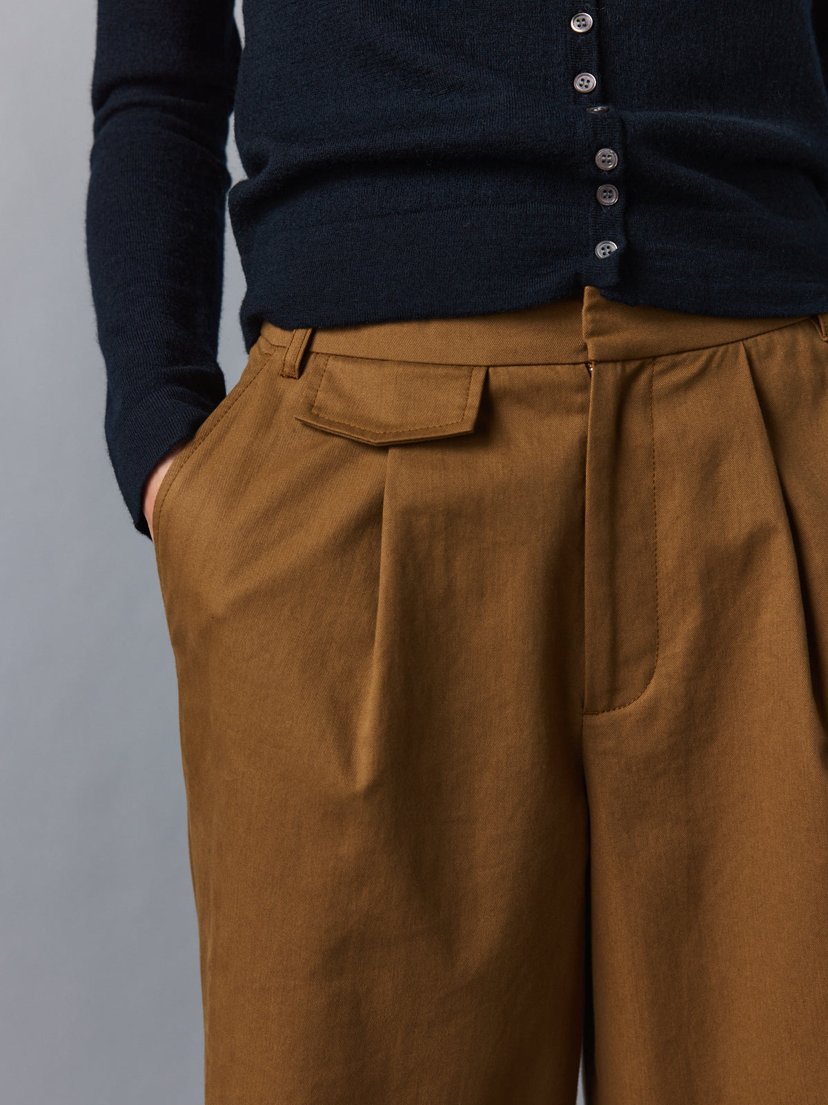 Tailored for presence, these high-rise trousers feature a wide leg, single pleats, and a front flap pocket, balancing function with refinement. Cut from soft cotton in warm camel, the fabric has a peach-skin feel that adds structure and depth.