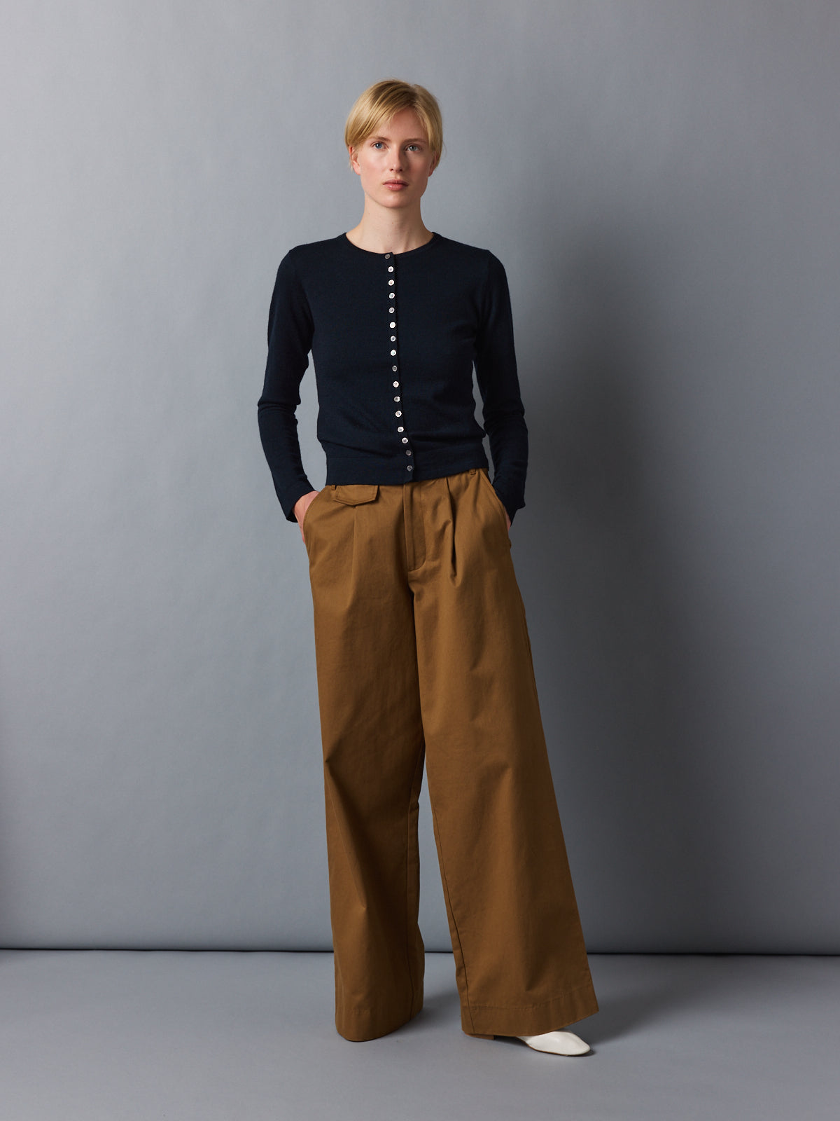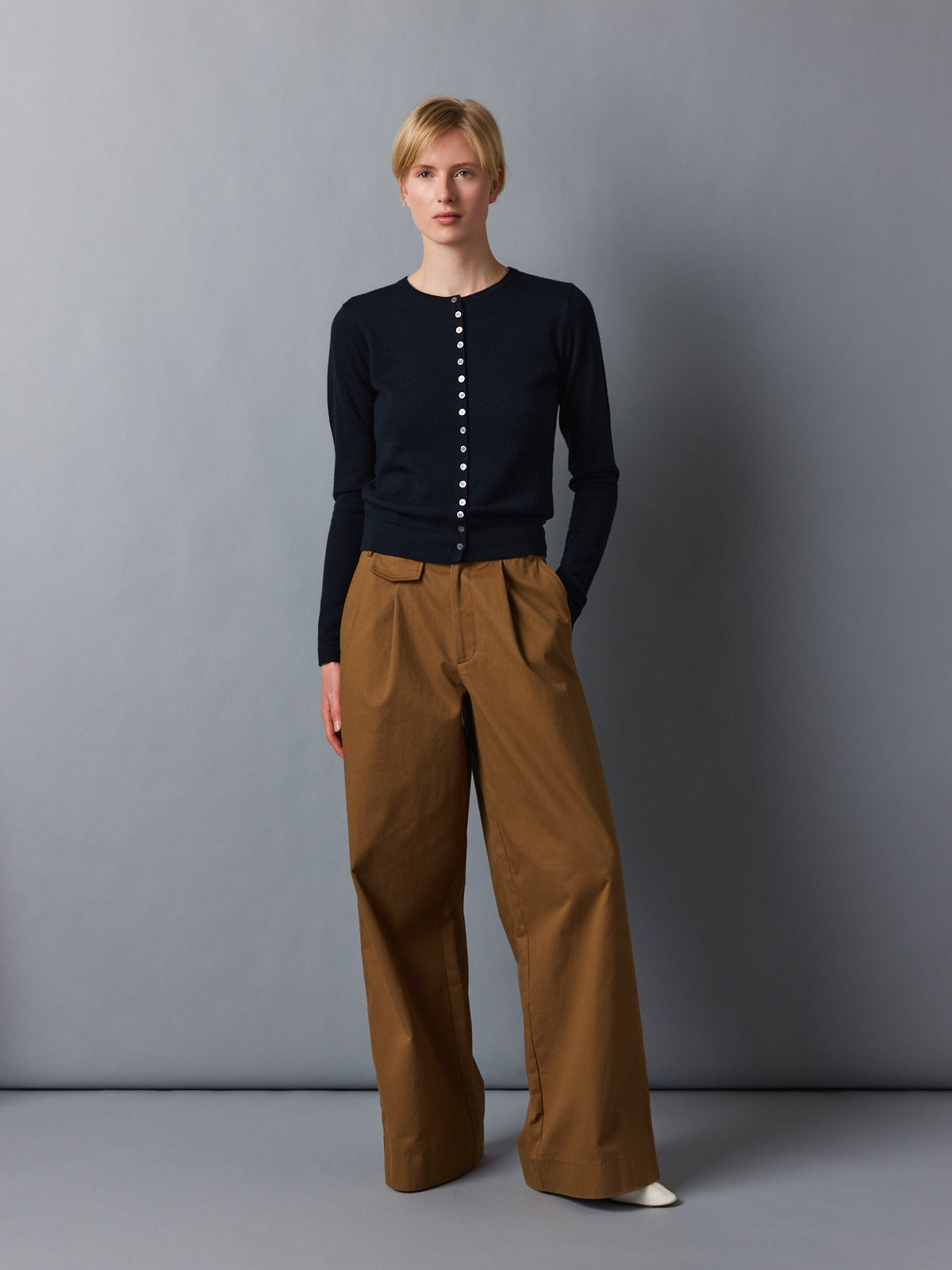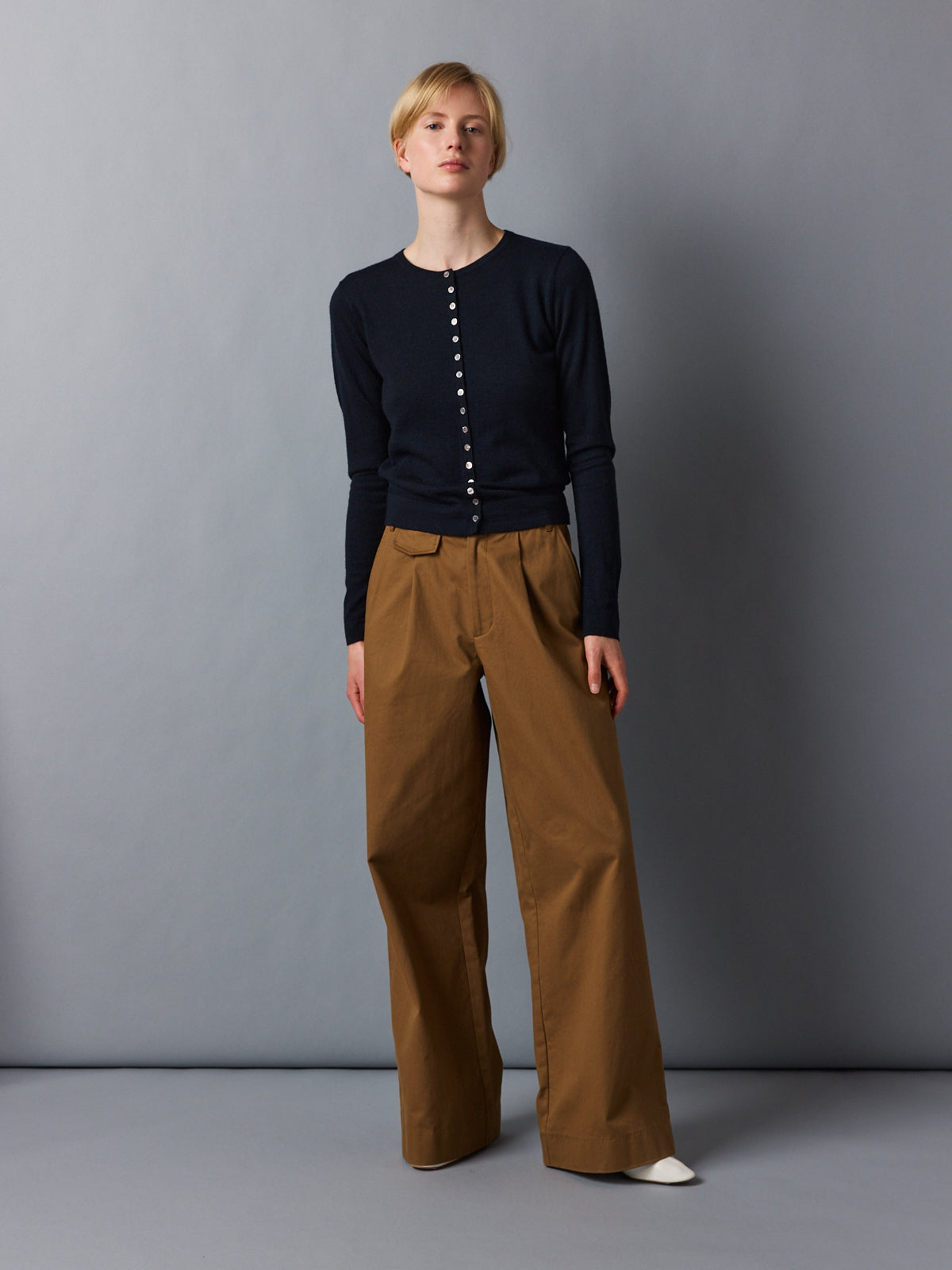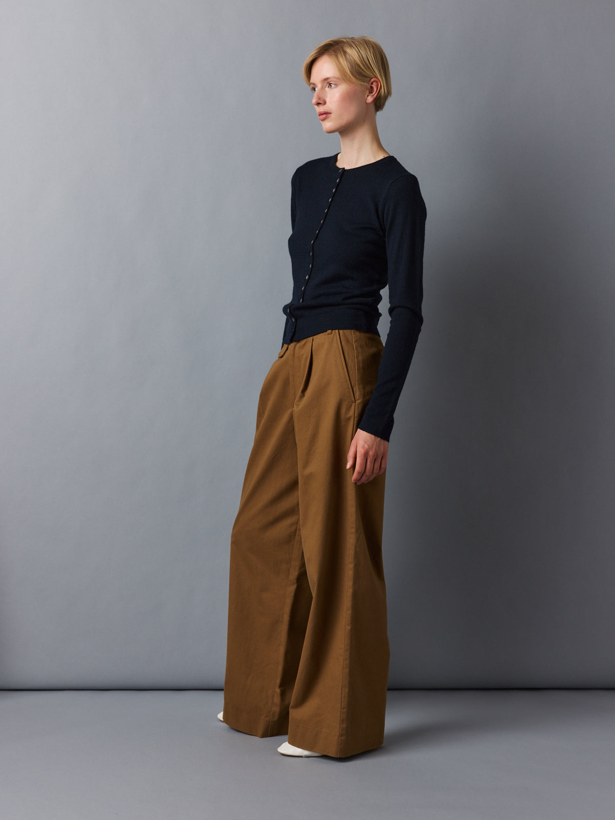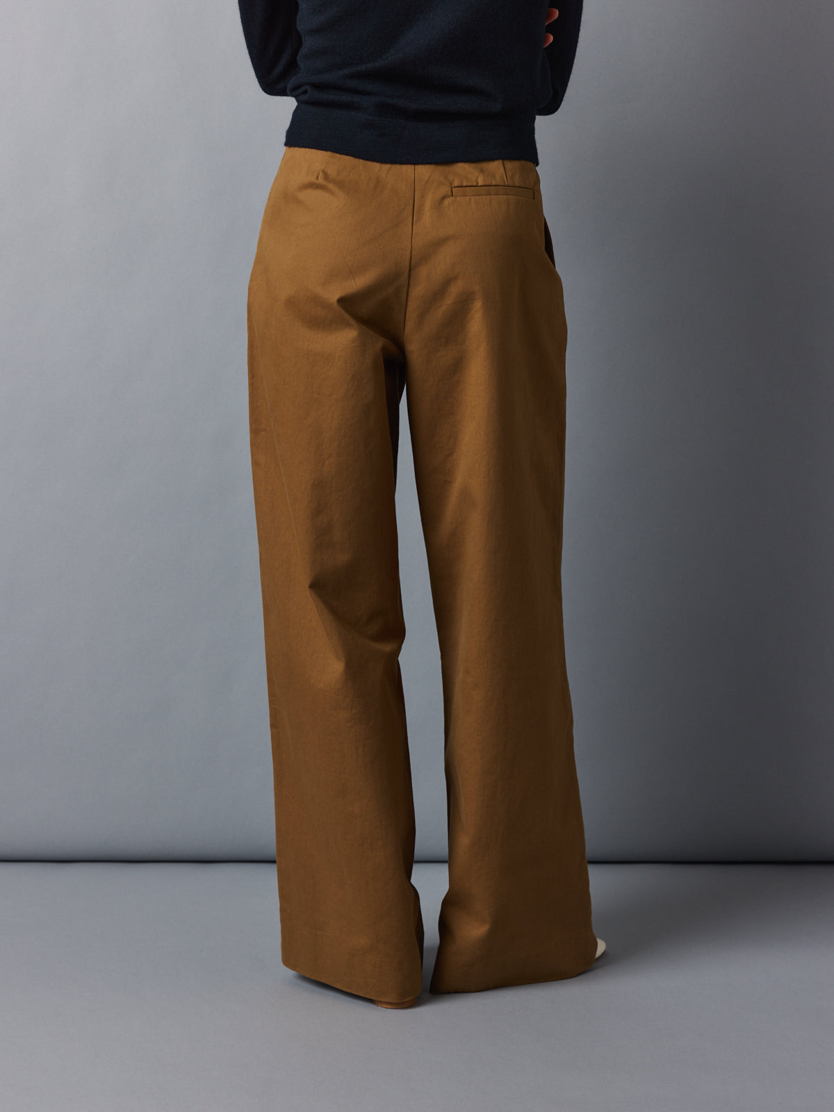 Tailored for presence, these high-rise trousers feature a wide leg, single pleats, and a front flap pocket, balancing function with refinement. Cut from soft cotton in warm camel, the fabric has a peach-skin feel that adds structure and depth.