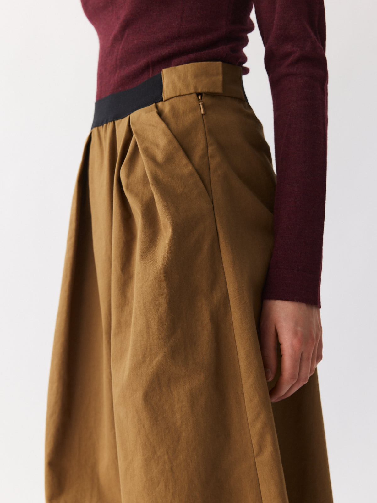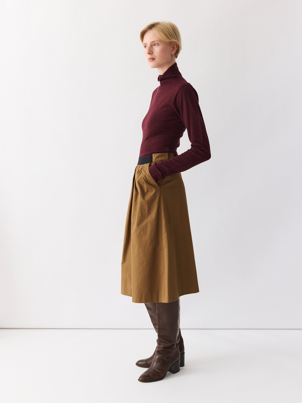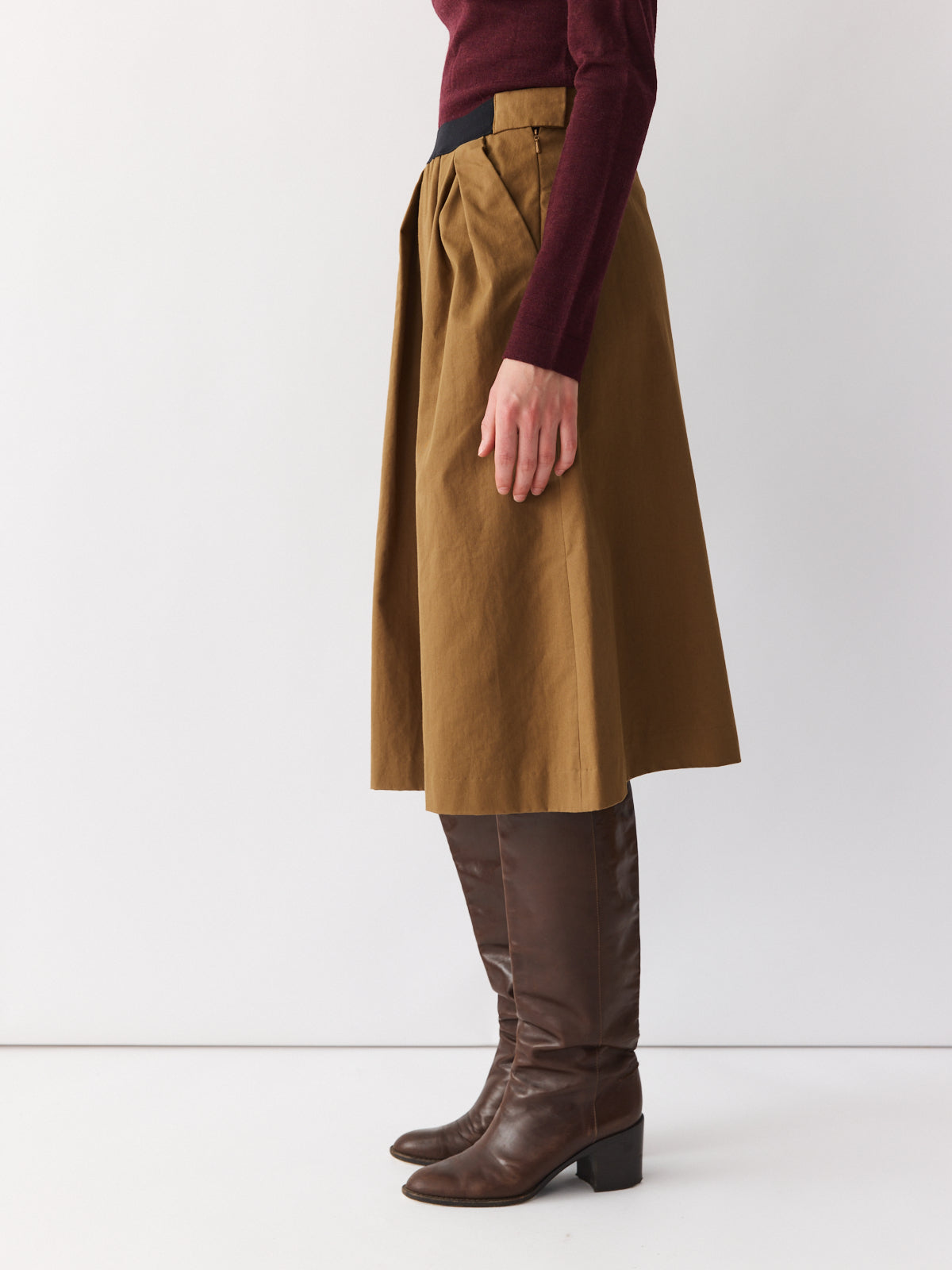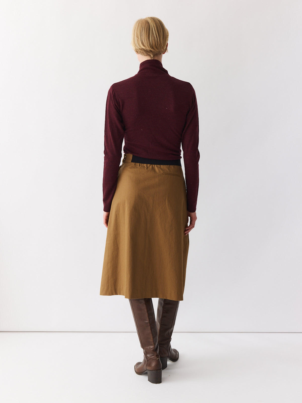 This midi skirt is cut from warm camel cotton with a peach-skin finish, structured, and soft. The high-rise waist and wide, flared silhouette are framed by a black waistband and neat pockets. A mid-season staple that works year-round: light with cottons, layered with knits.