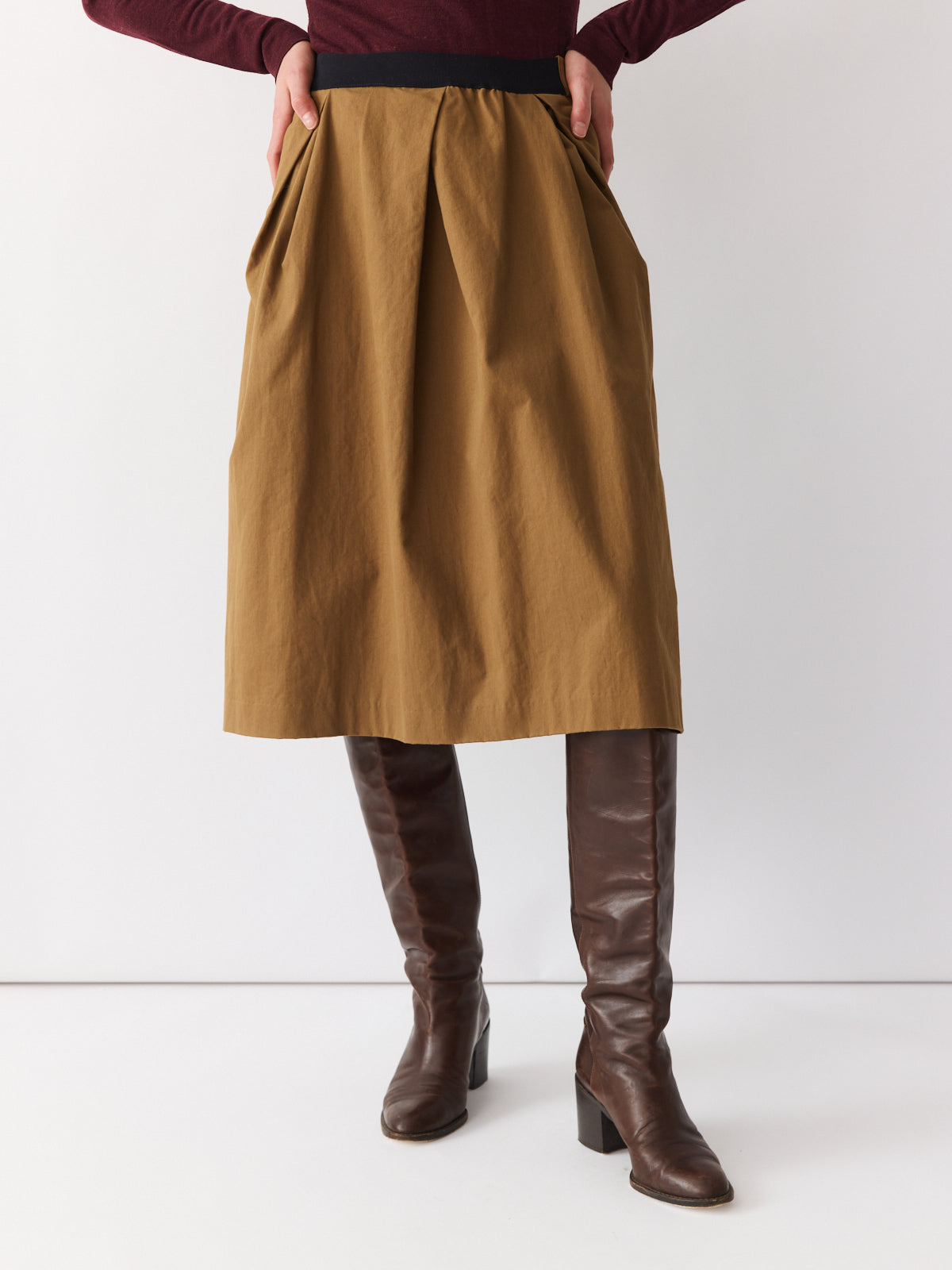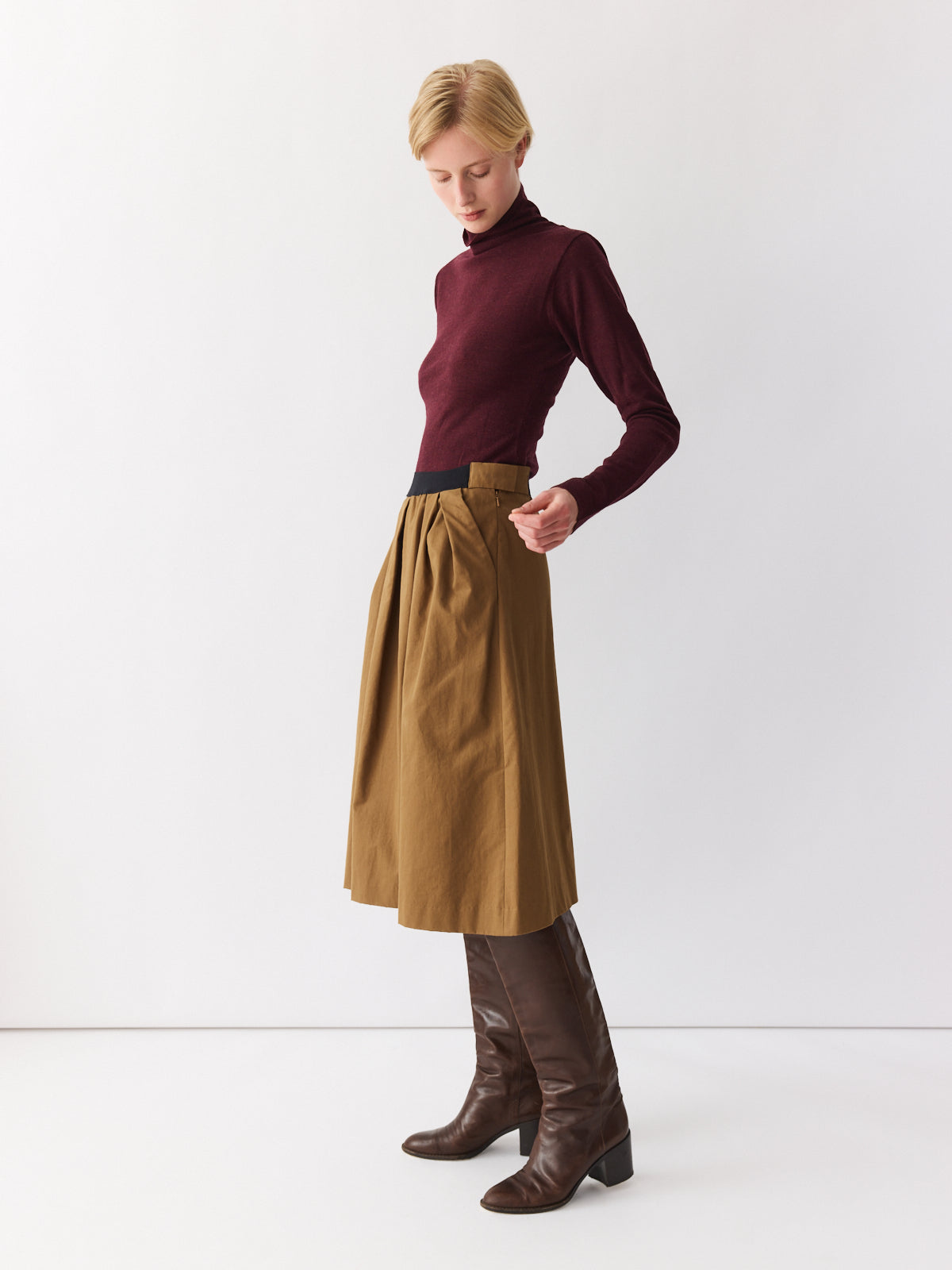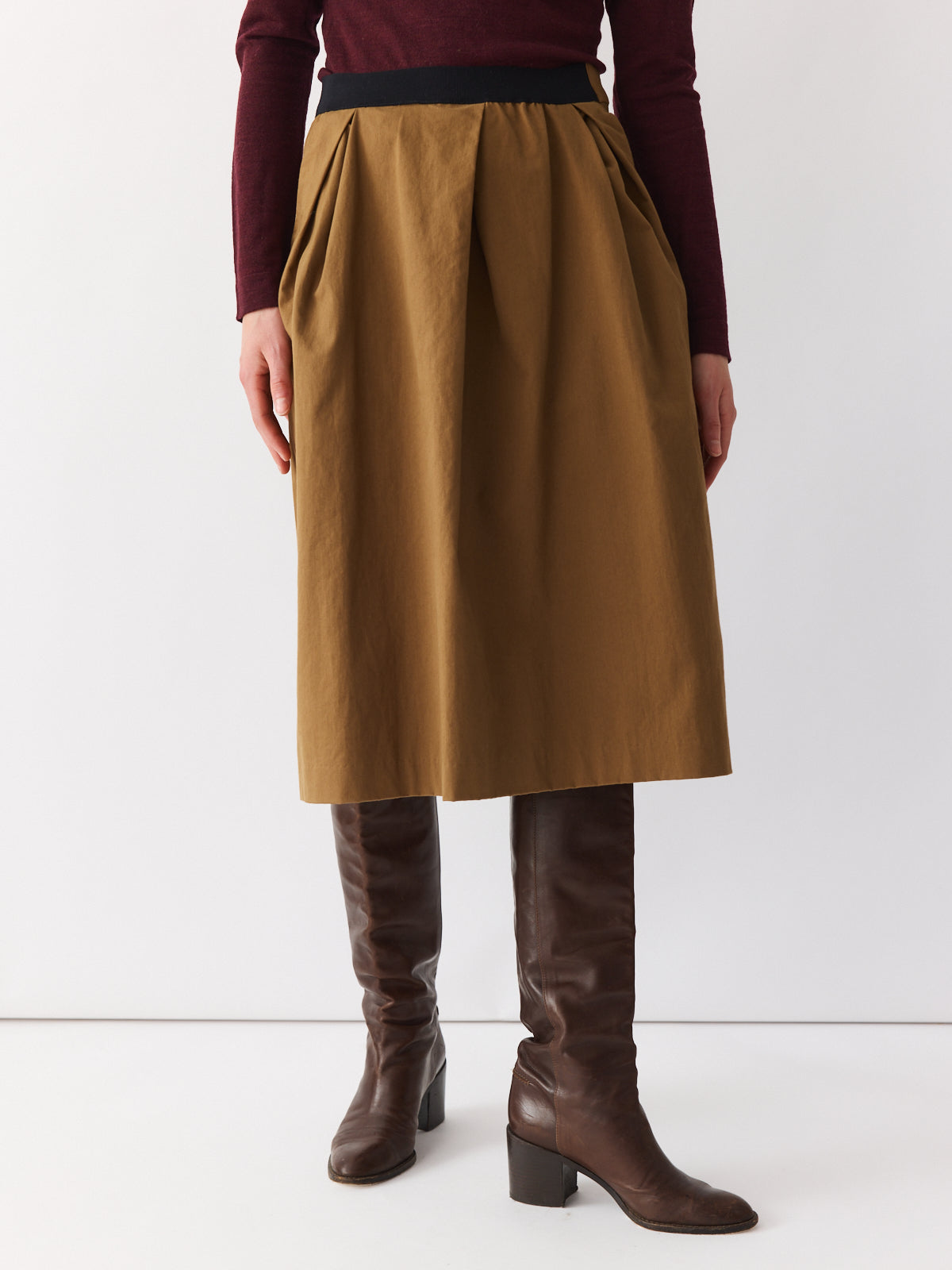 This midi skirt is cut from warm camel cotton with a peach-skin finish, structured, and soft. The high-rise waist and wide, flared silhouette are framed by a black waistband and neat pockets. A mid-season staple that works year-round: light with cottons, layered with knits.