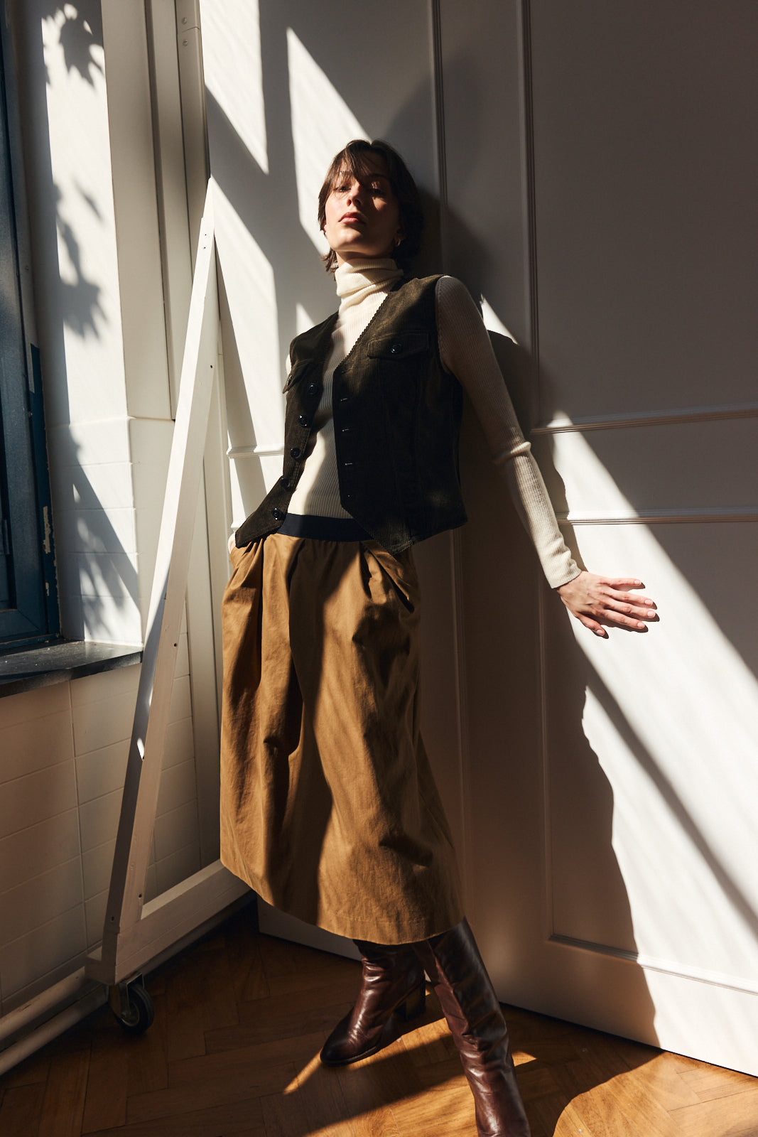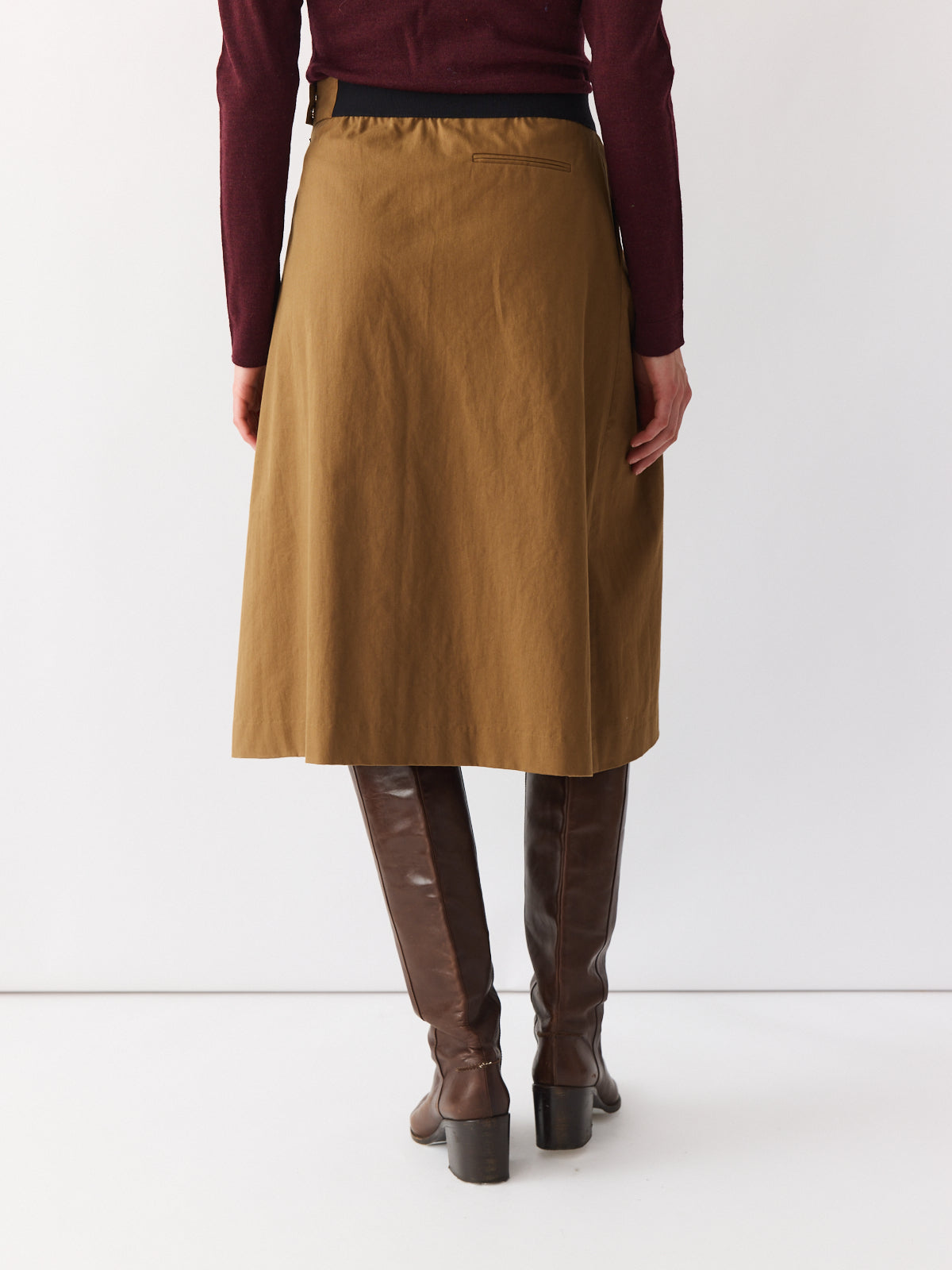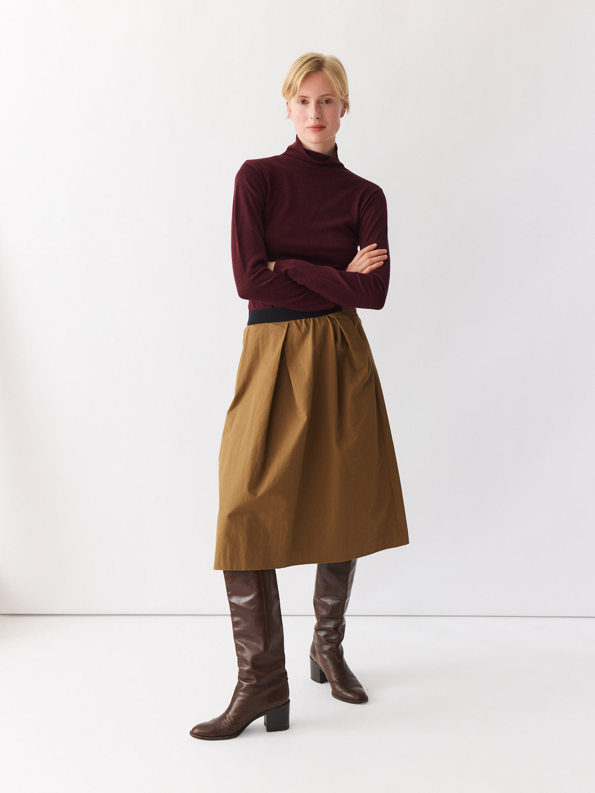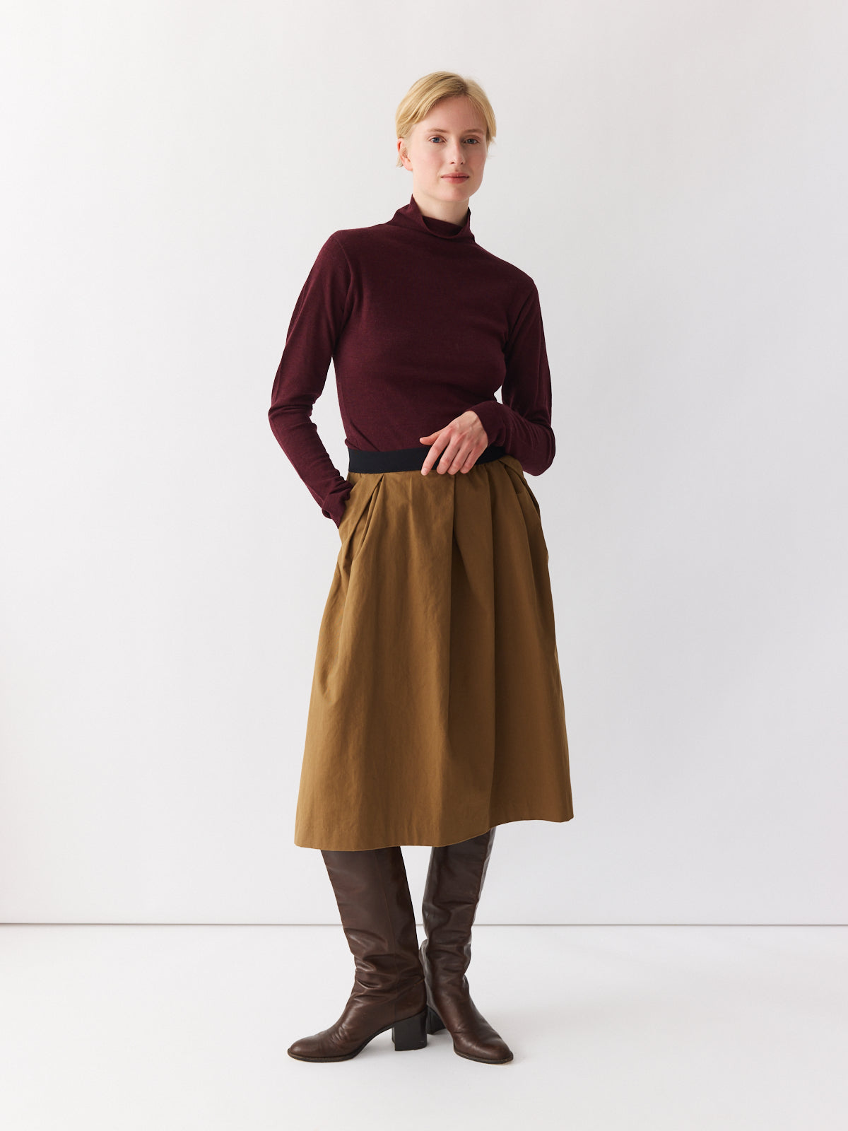 This midi skirt is cut from warm camel cotton with a peach-skin finish, structured, and soft. The high-rise waist and wide, flared silhouette are framed by a black waistband and neat pockets. A mid-season staple that works year-round: light with cottons, layered with knits.