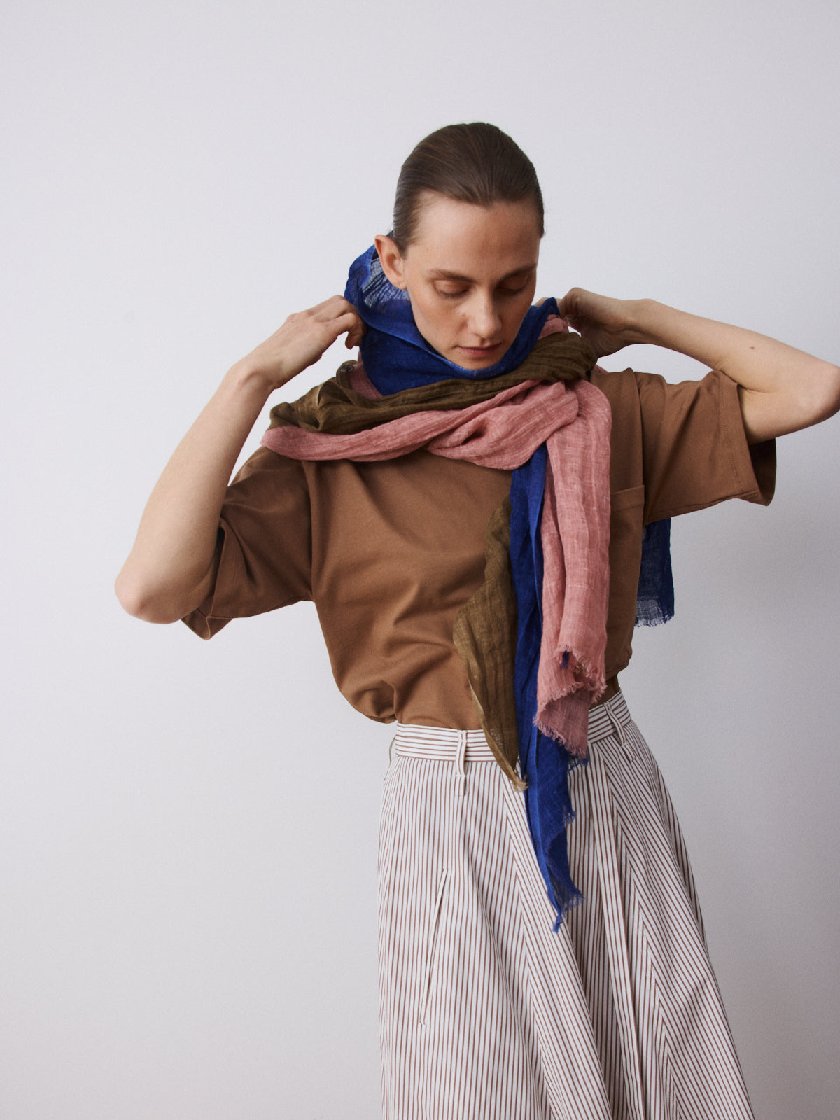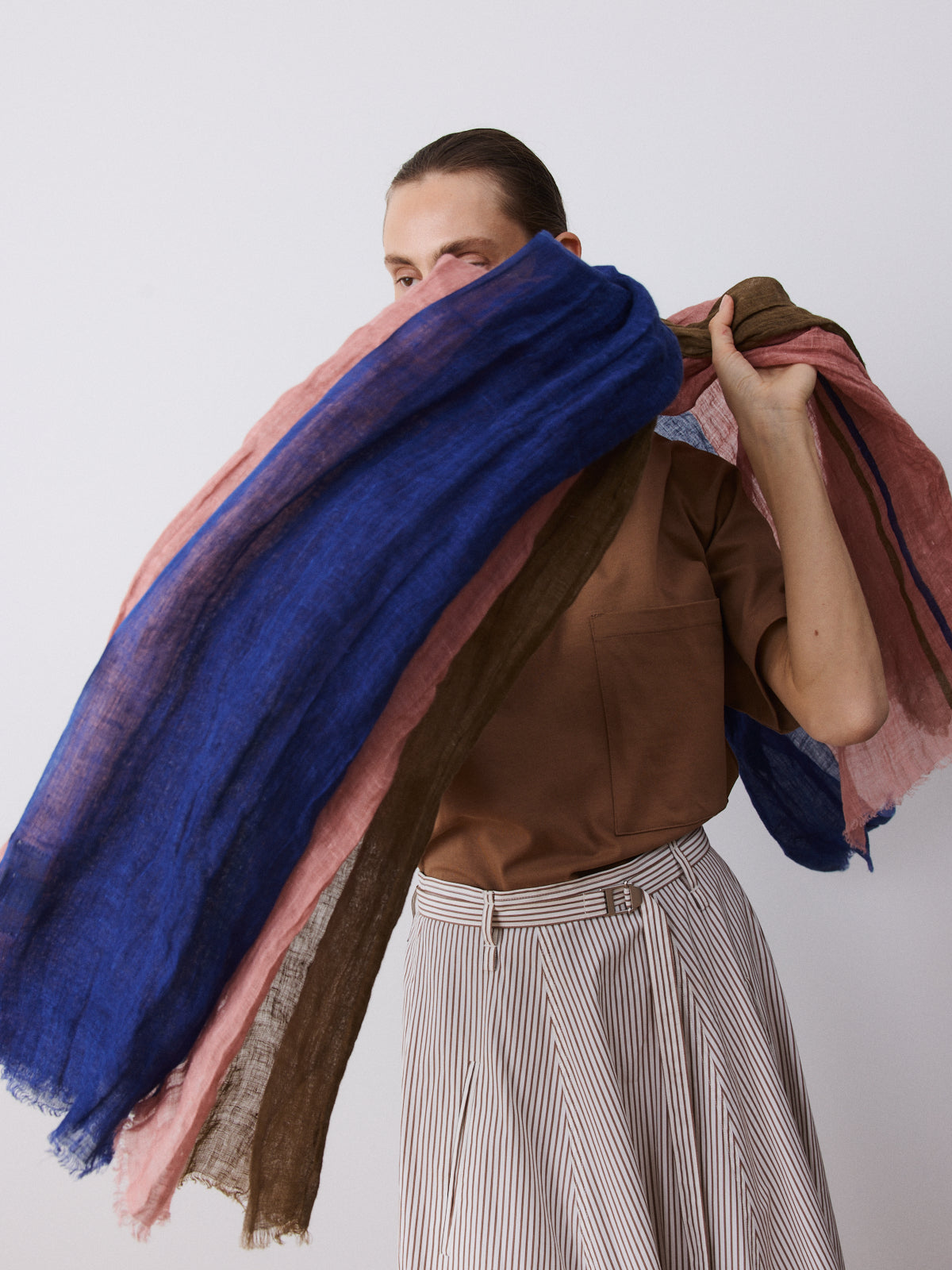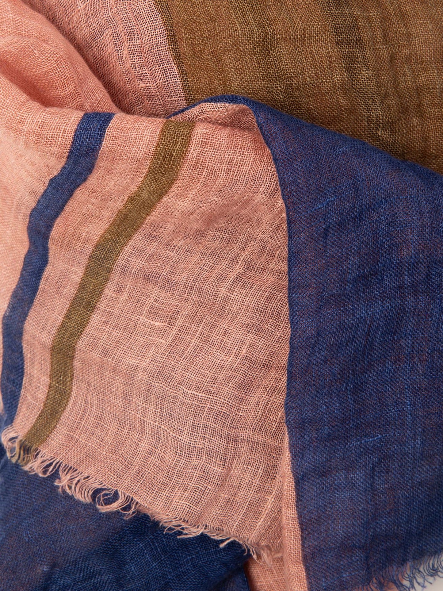A printed linen scarf in blue, khaki and pink, designed by Lovat & Green. Defined by its graphic colour pattern and light linen texture, it can be worn as a scarf or sarong, adding a seasonal point of colour to everyday dressing.