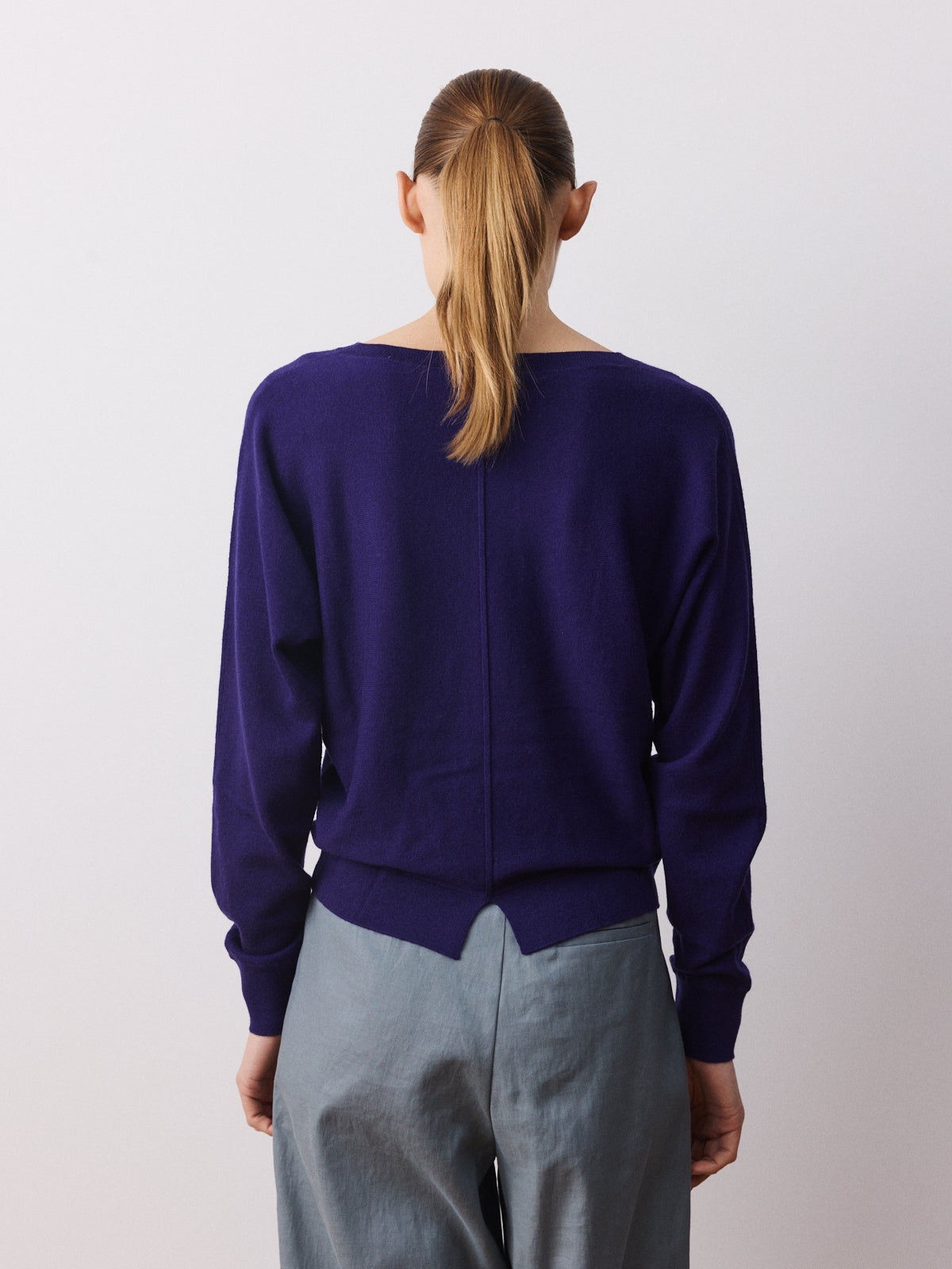 A carry-over V-neck sweater defined by its material and relaxed shape. Knitted from a merino wool and cotton blend in purple with a fluid surface and soft, cosy feel. Designed with long sleeves, dropped shoulders, a double-layer V-neck and a back slit at the waistband.