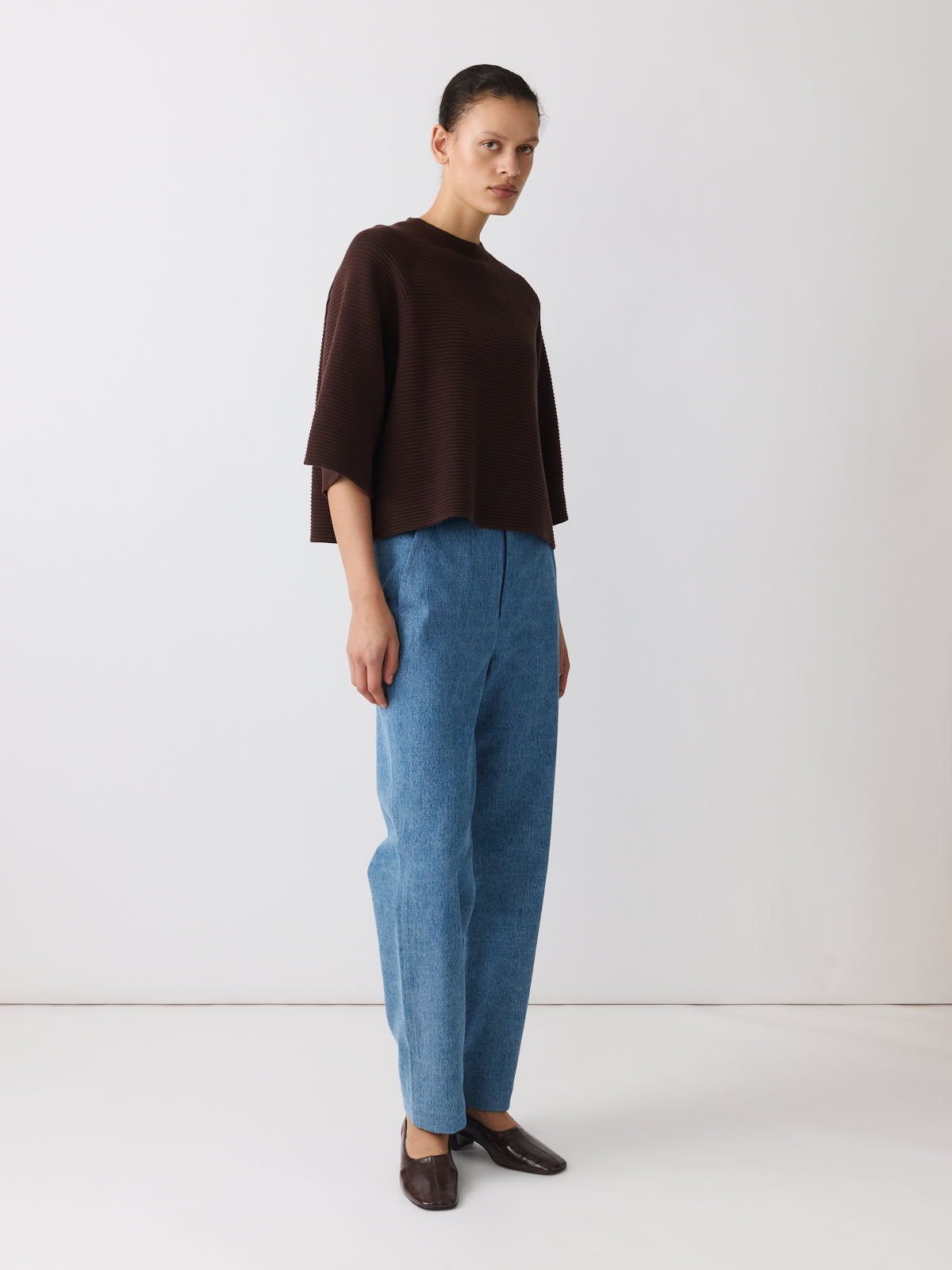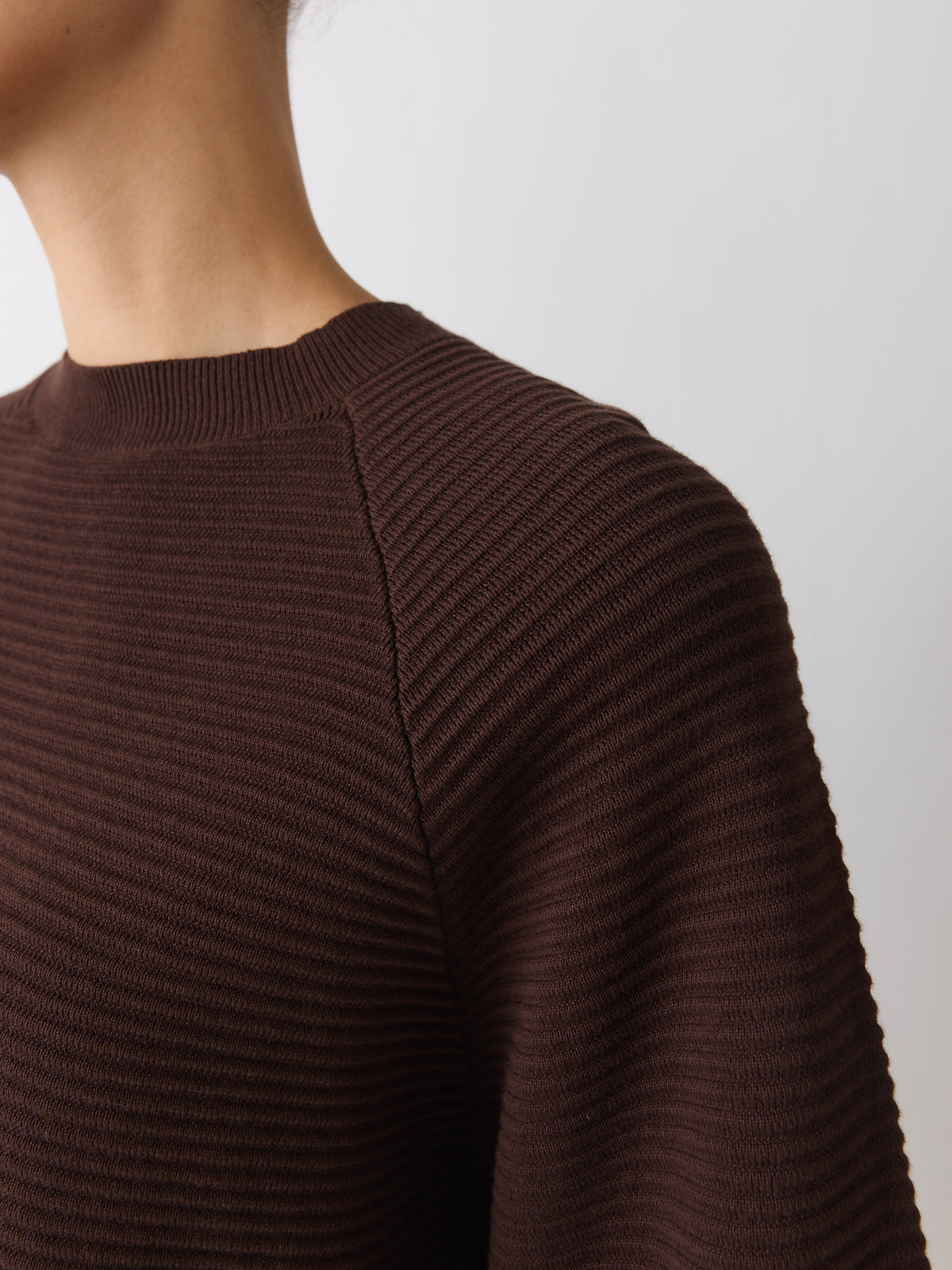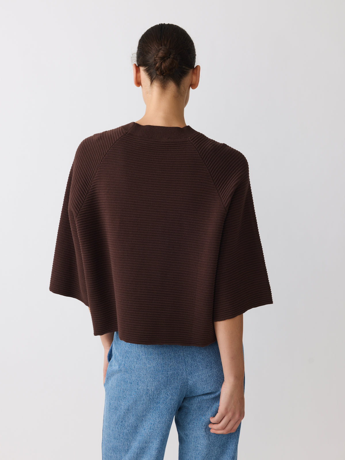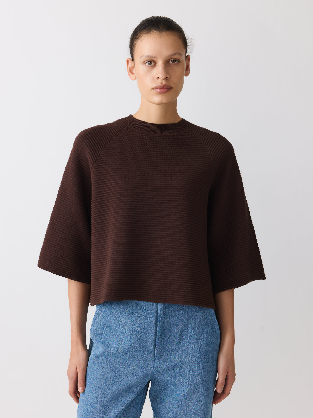 A summer sweater in deep coffee brown, this heavy cotton style feels different in tone and texture. Knitted with a structured surface and ripple stitch technique, it features raglan shoulders, wide 3/4 sleeves, a crew neckline and a voluminous silhouette.