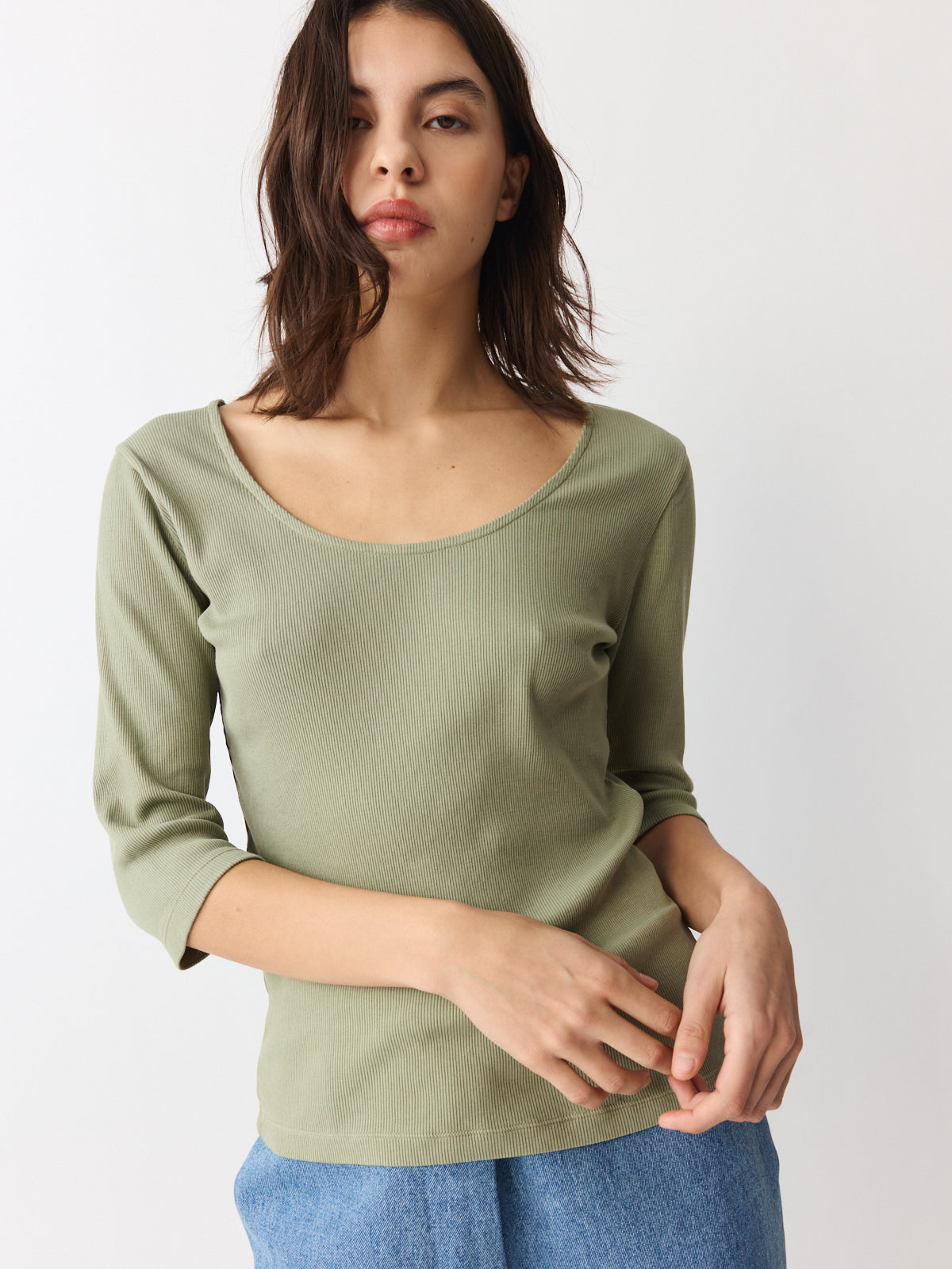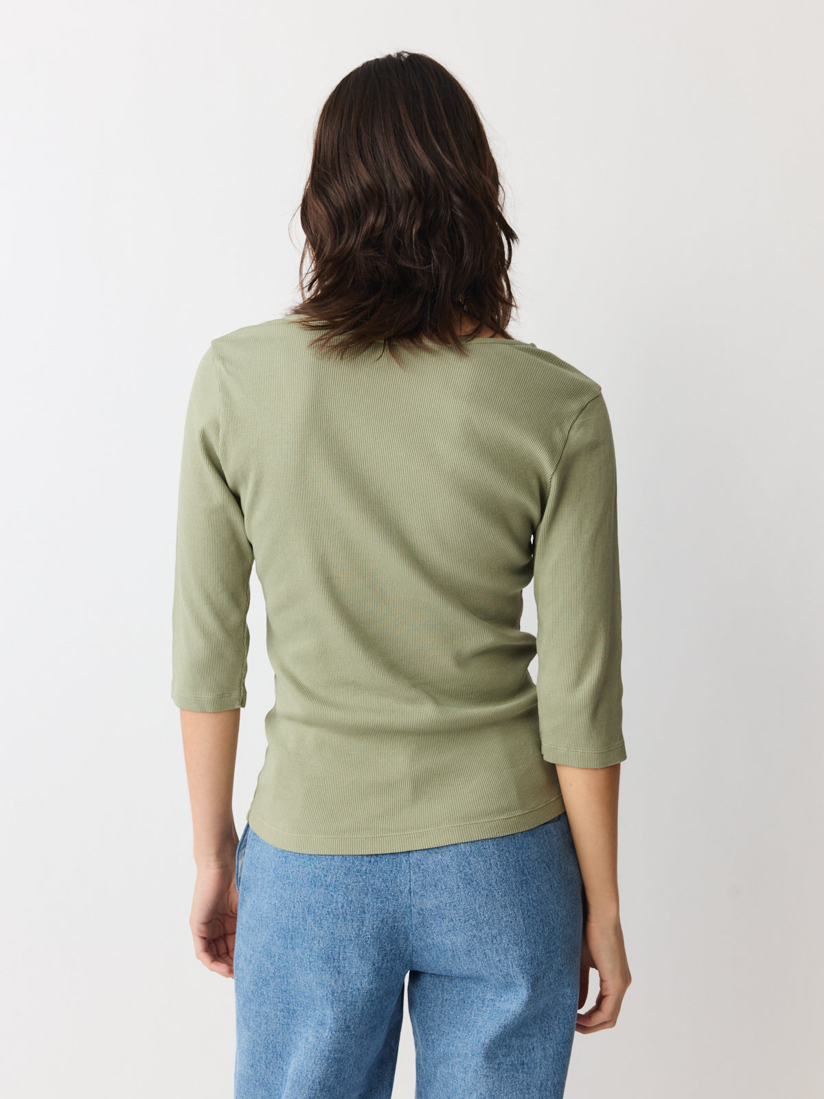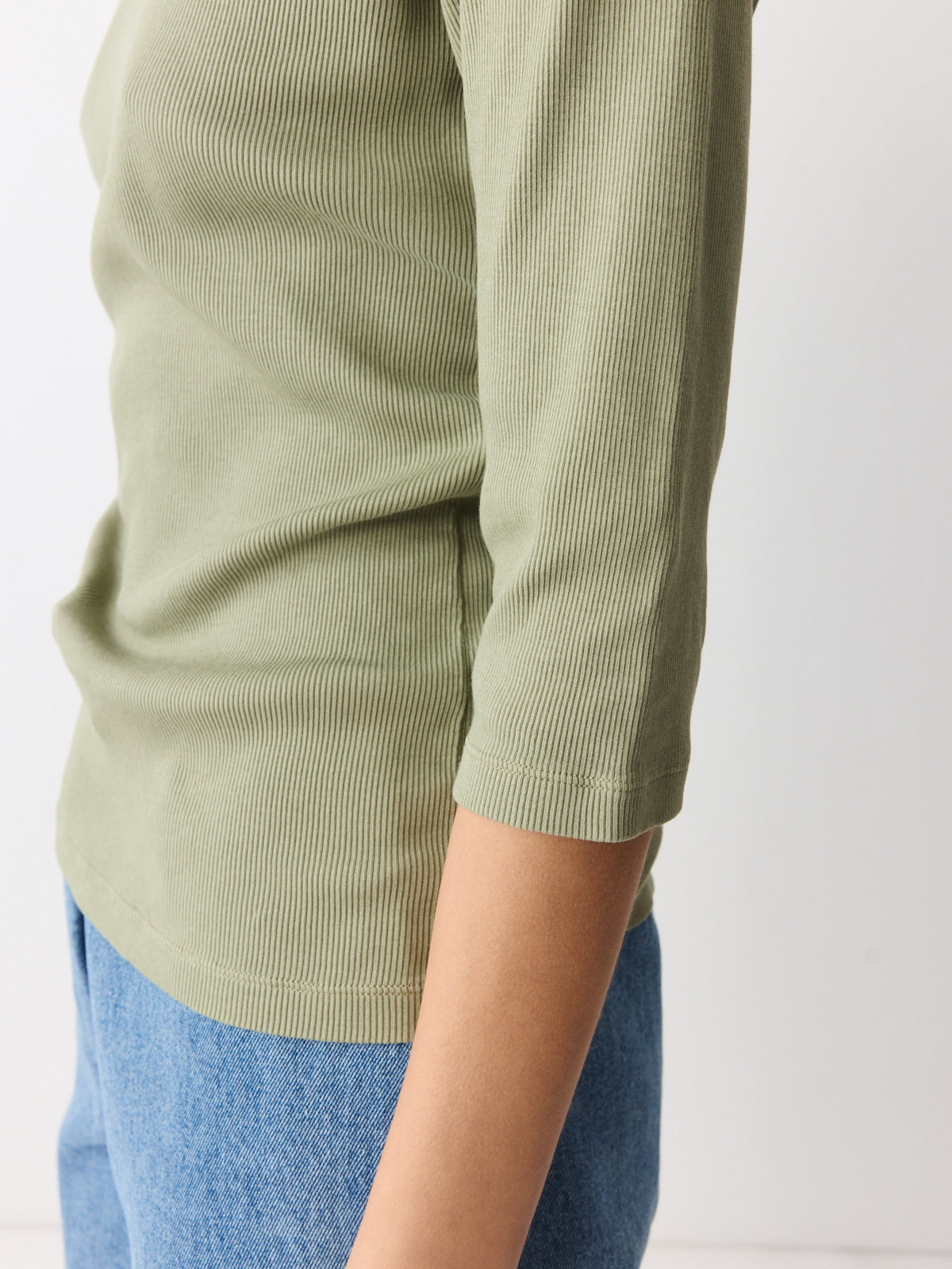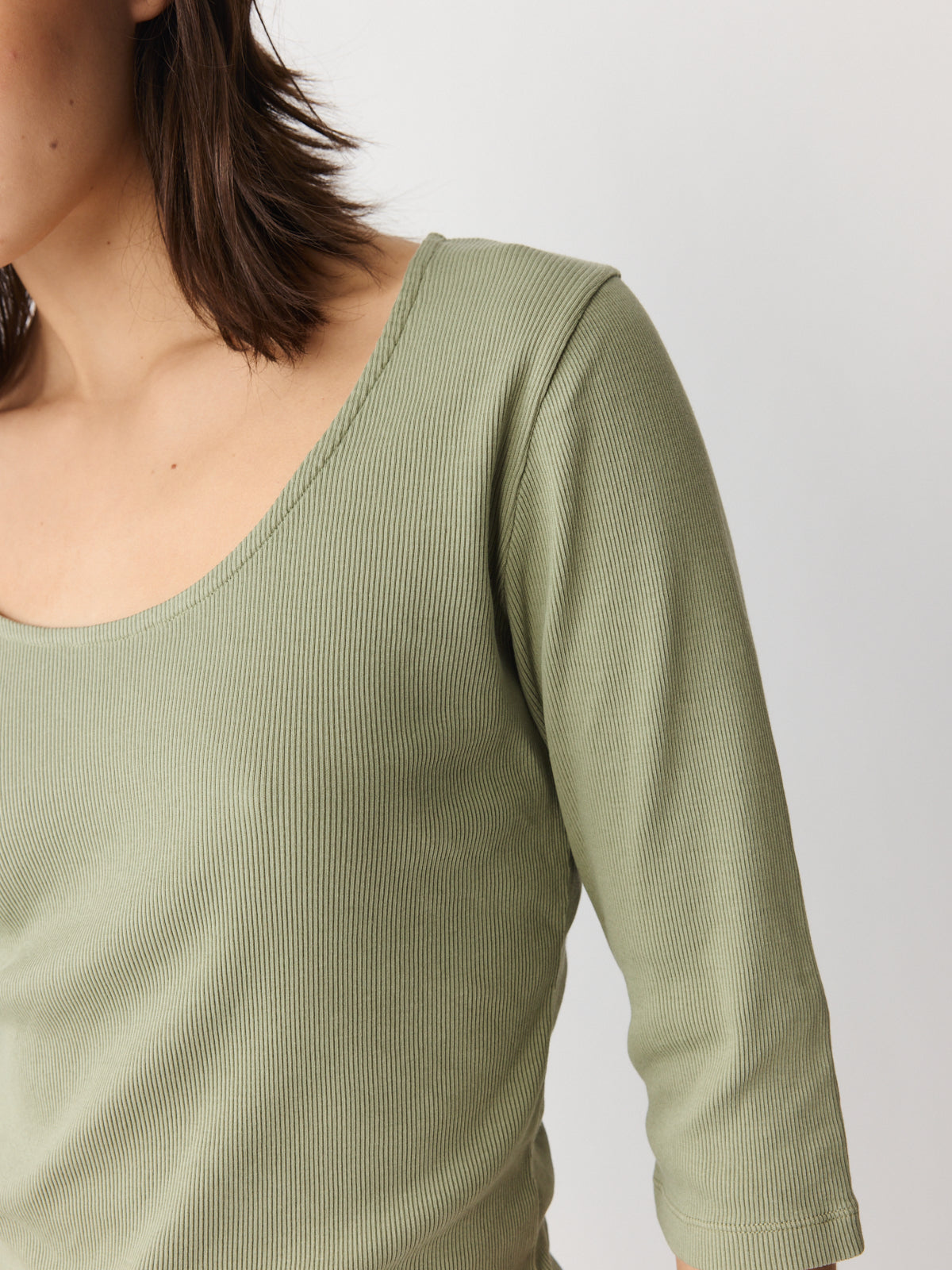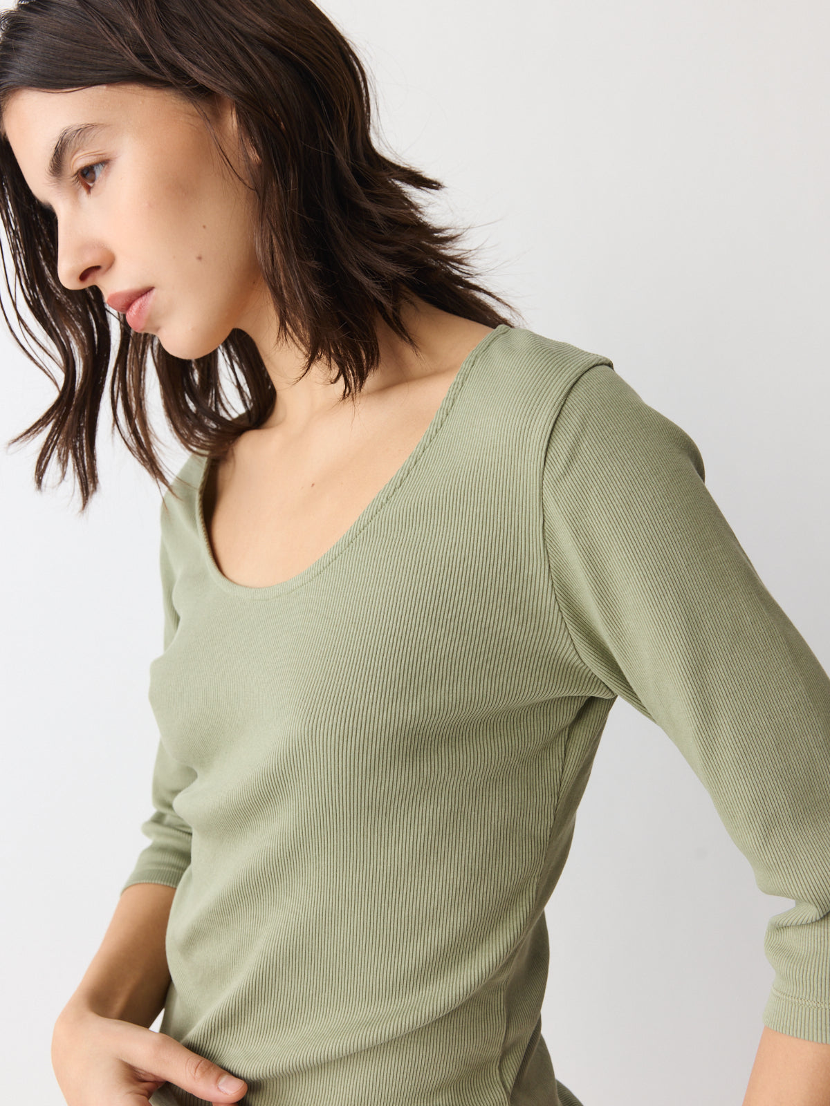 A feminine everyday T-shirt in eucalyptus green, this organic cotton style is defined by its deep round ballet neckline and fine rib texture. Made from 100% cotton, it features 3/4 sleeves, neat shoulders and a regular fit.