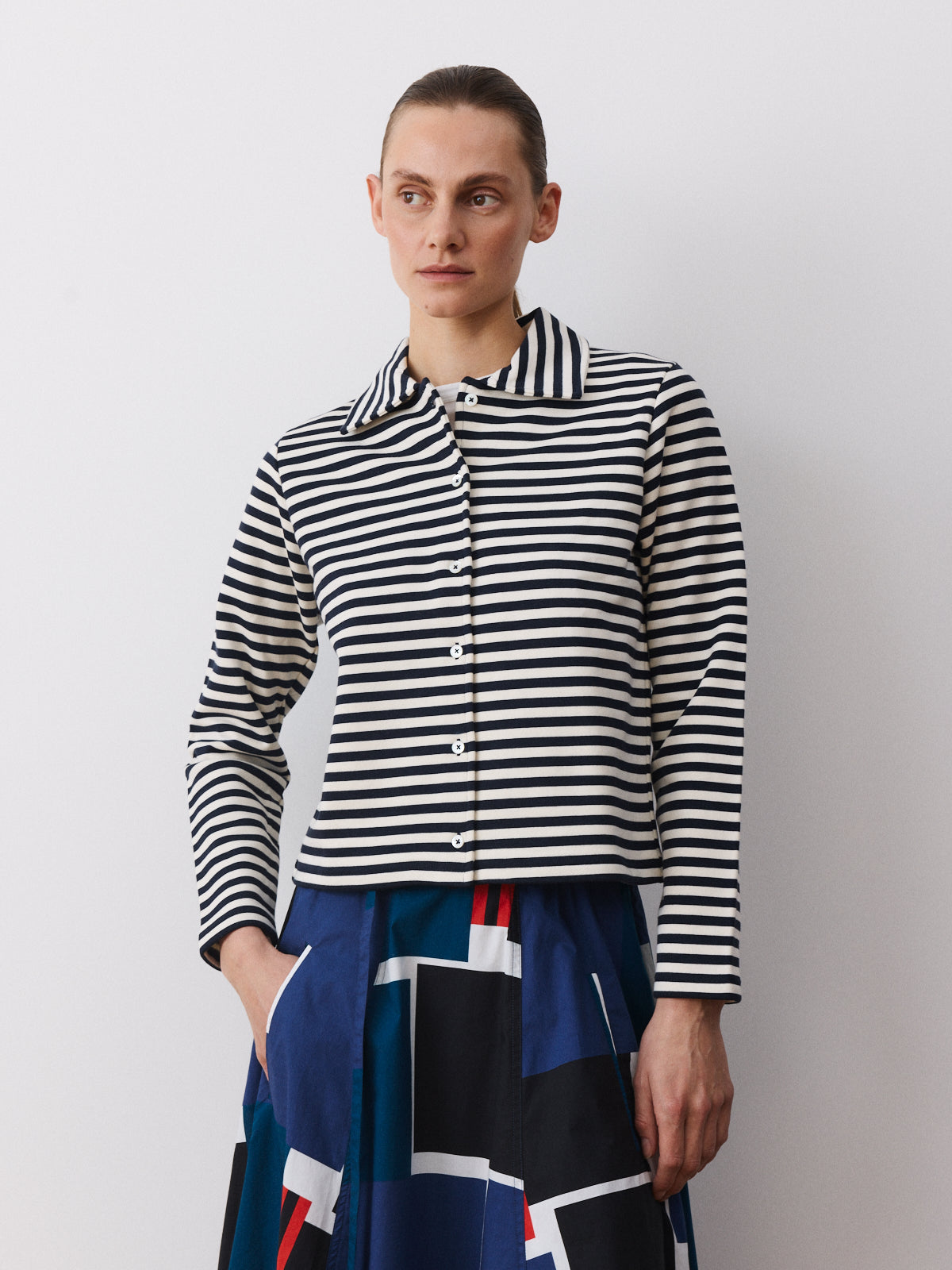 A refined take on the classic polo. This long-sleeved striped shirt pairs a generous collar with a straight fit and dark blue–white stripes in thick organic cotton. The fabric’s structured ease offers a confident silhouette with a clean, graphic rhythm.