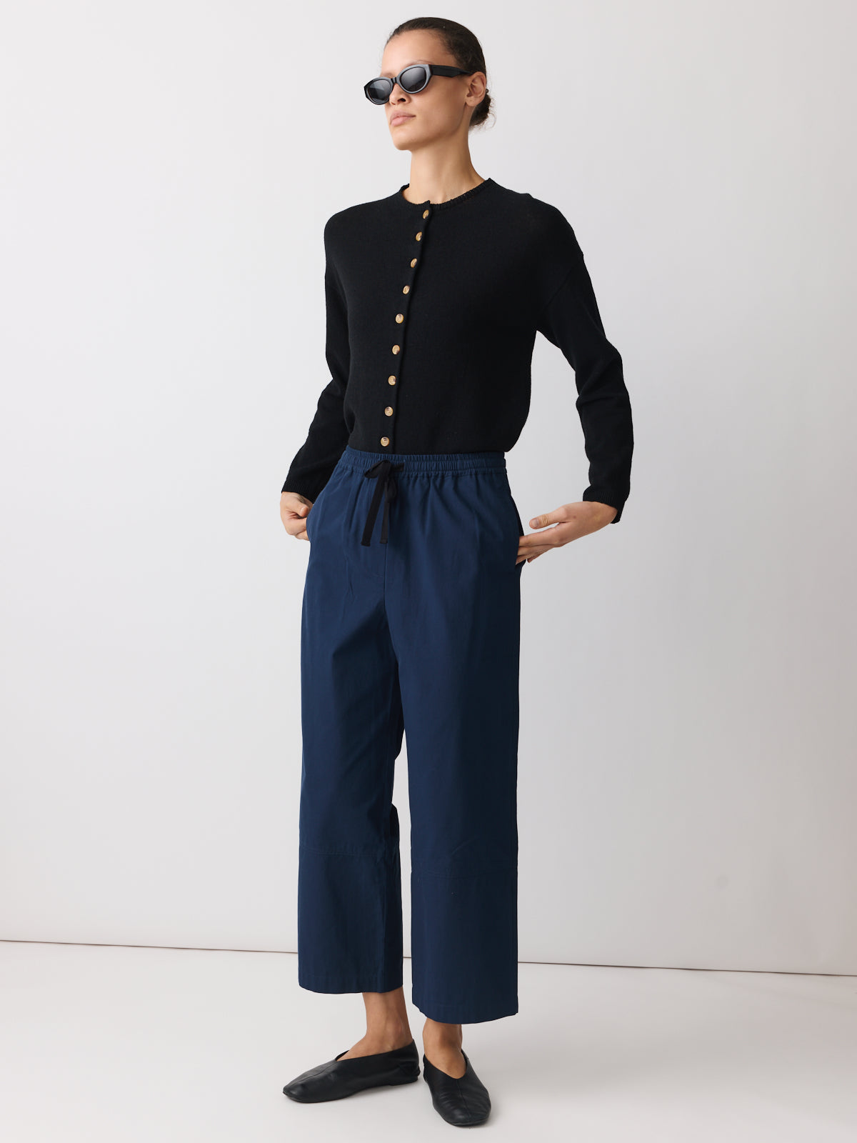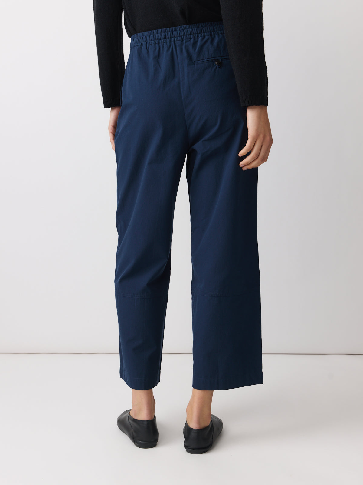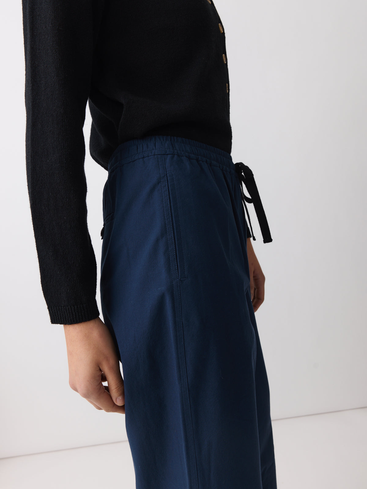 This pair of trousers is a comfortable wardrobe basic. Cut from a garment-dyed woven fabric in deep navy with a matte finish. Designed with a mid-rise, straight leg to the ankle and an elasticated waistband with black drawstring.