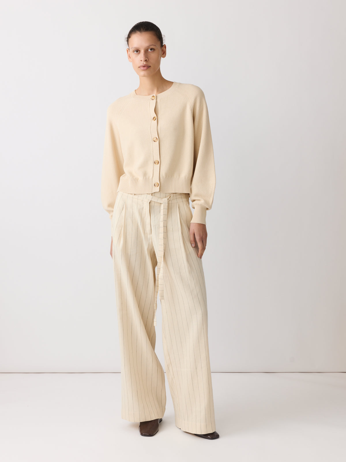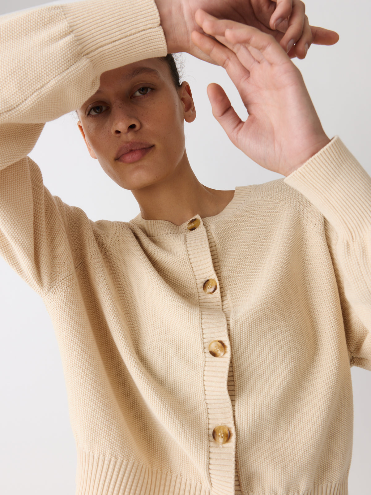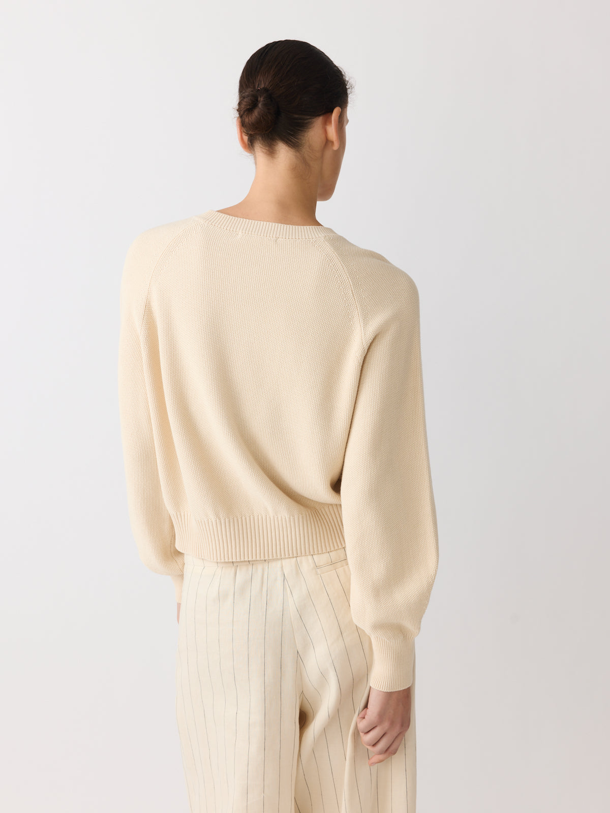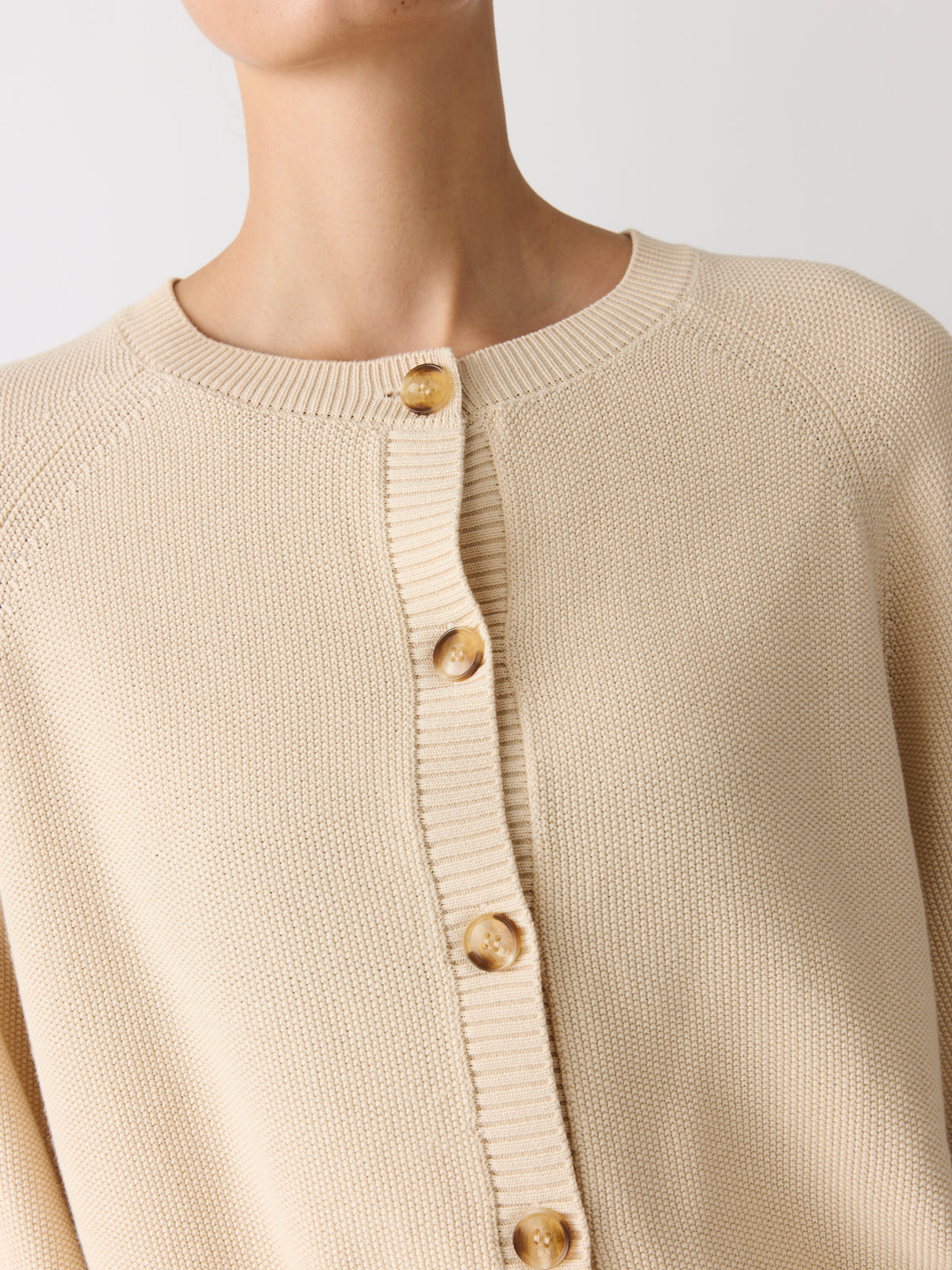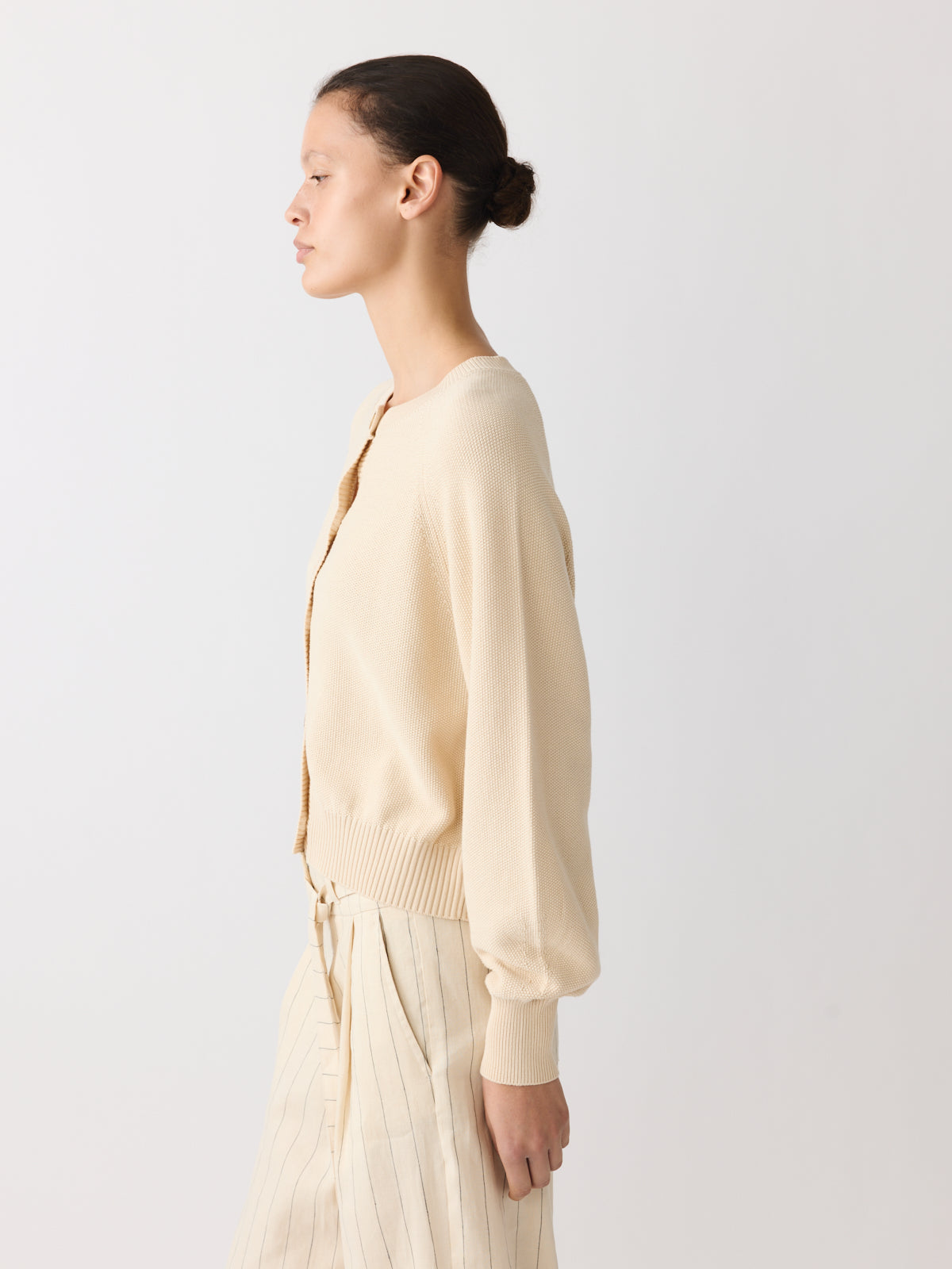This cardigan is cut from a cotton and rayon piqué knit in soft vanilla cream. Designed with long balloon sleeves, raglan shoulders, a round neckline and a slightly fitted waistband.