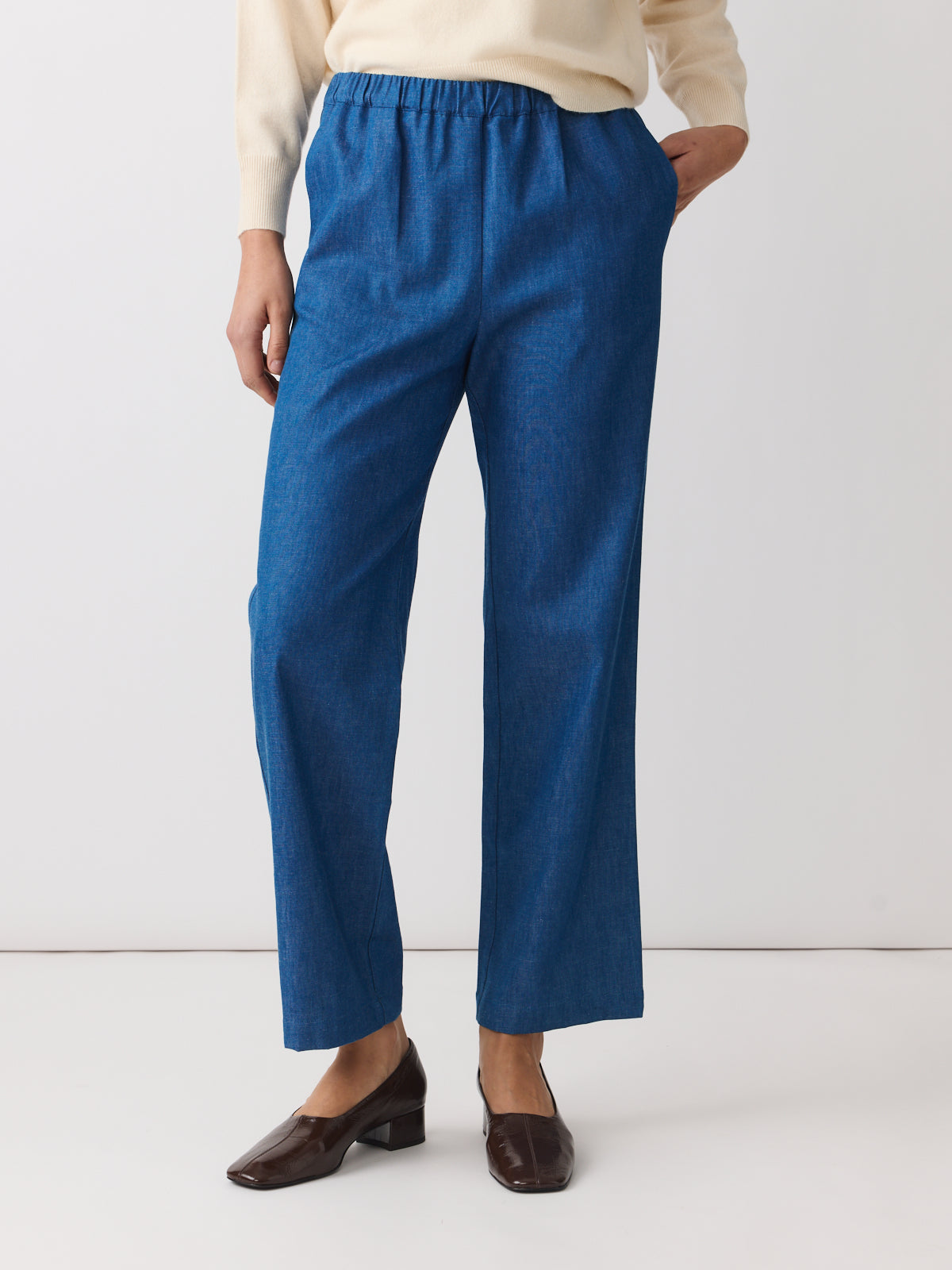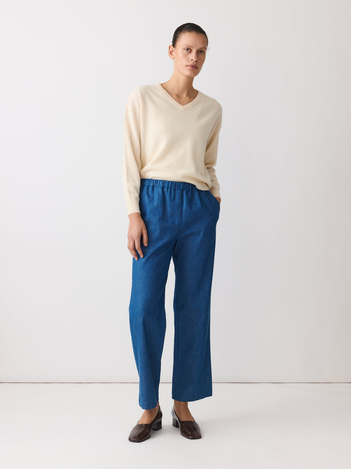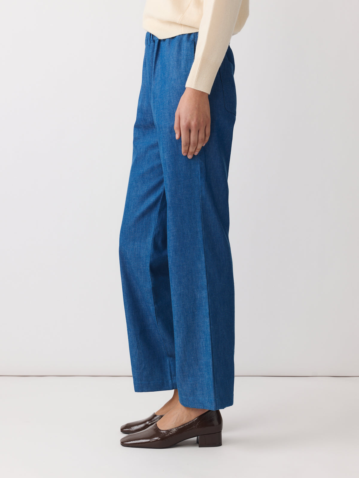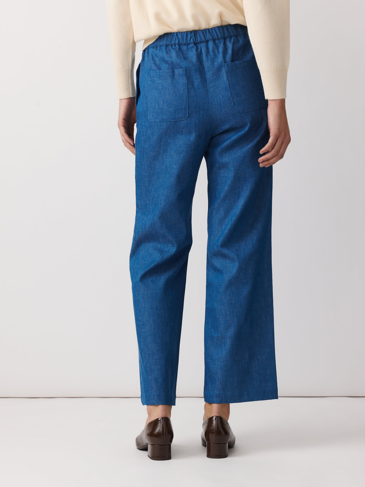 Relaxed in feel, these denim trousers are inspired by homewear silhouettes for everyday comfort. Cut from a lightweight cotton denim with a soft handle and easy drape, they feature a mid-rise, straight leg to the ankle and a fully elasticated waistband.