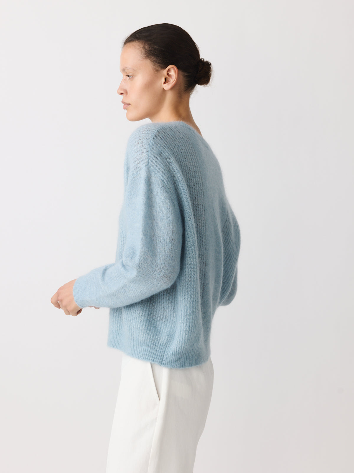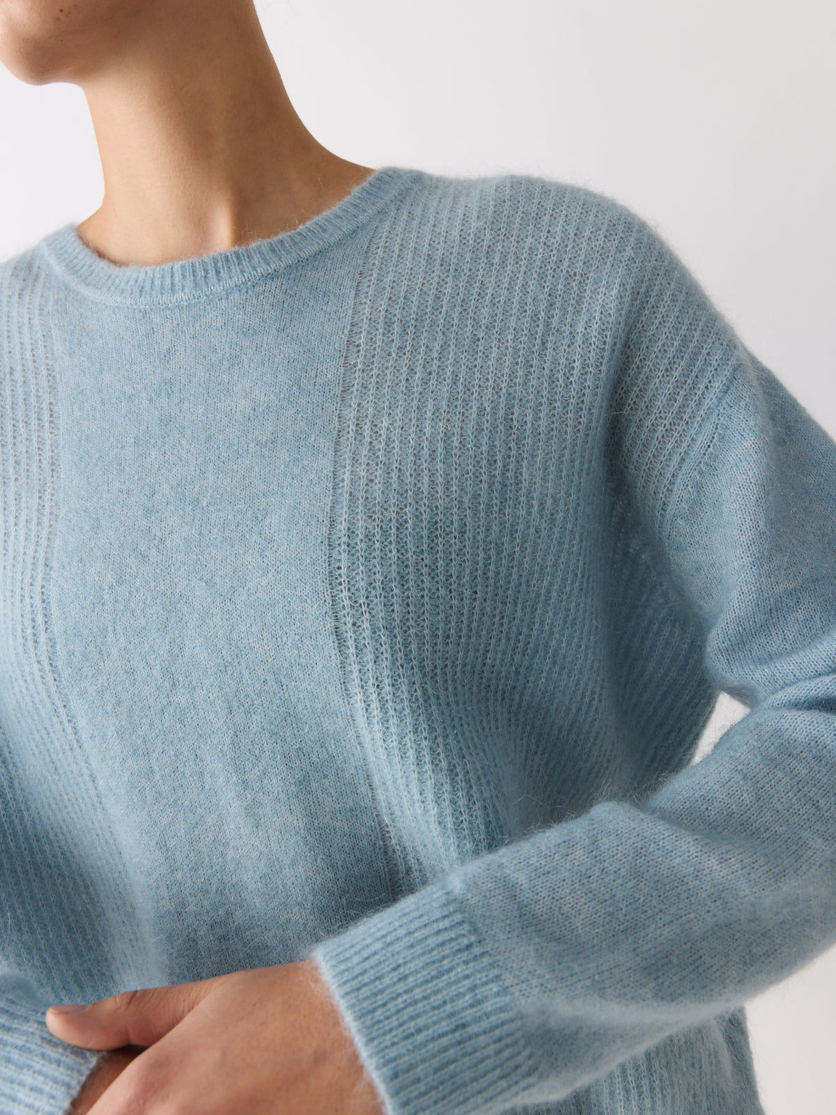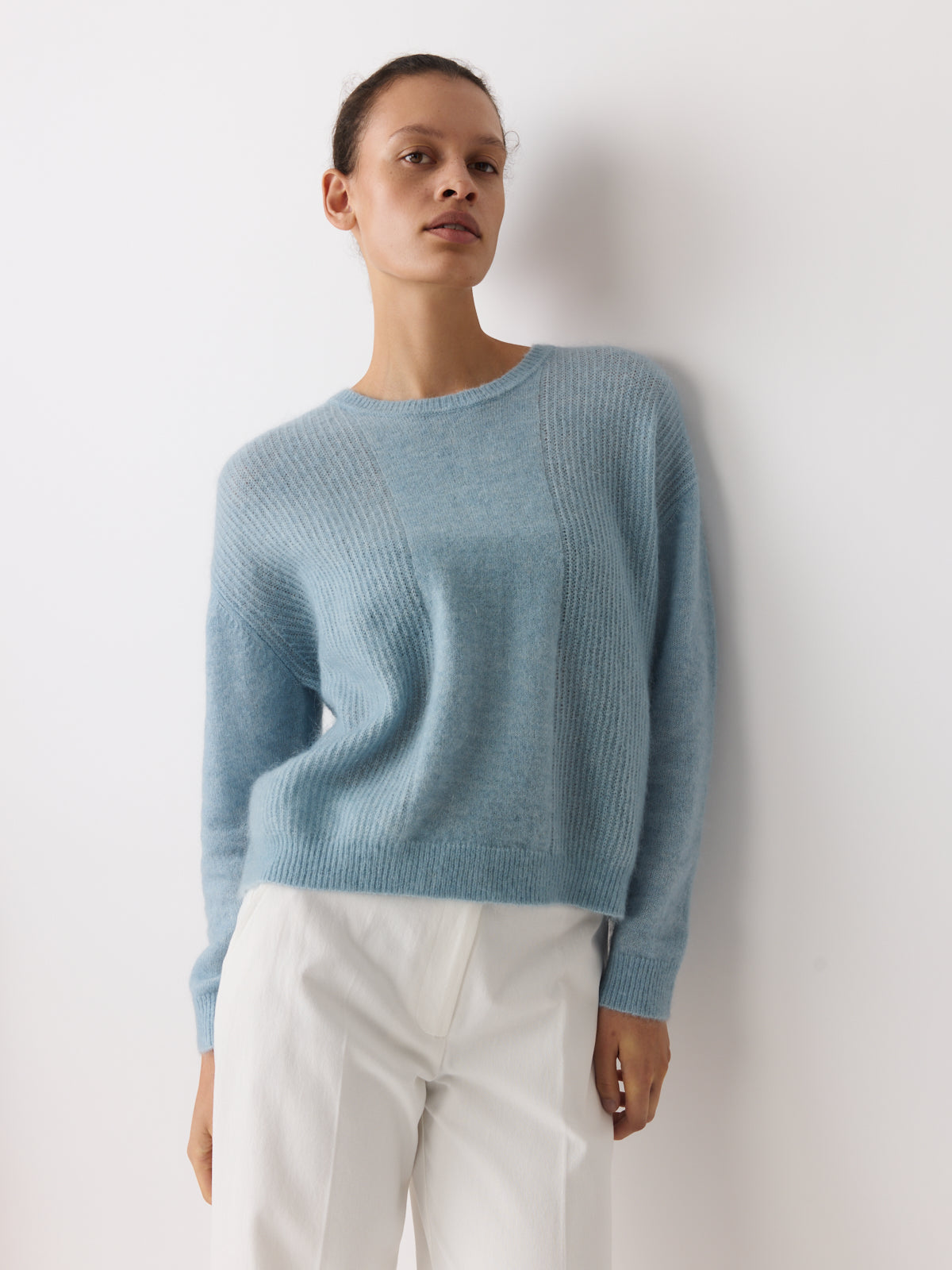 A boxy, cropped sweater defined by its light baby blue tone and textured ribs. Knitted from a mohair blend with an airy, fuzzy surface and cosy look. Designed with dropped shoulders, long sleeves and elaborate rib-knit variations across the body.