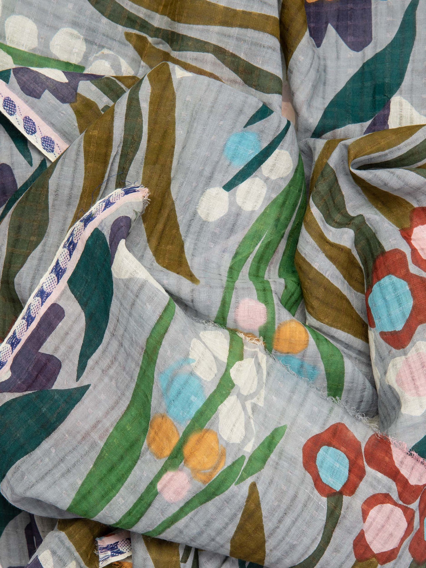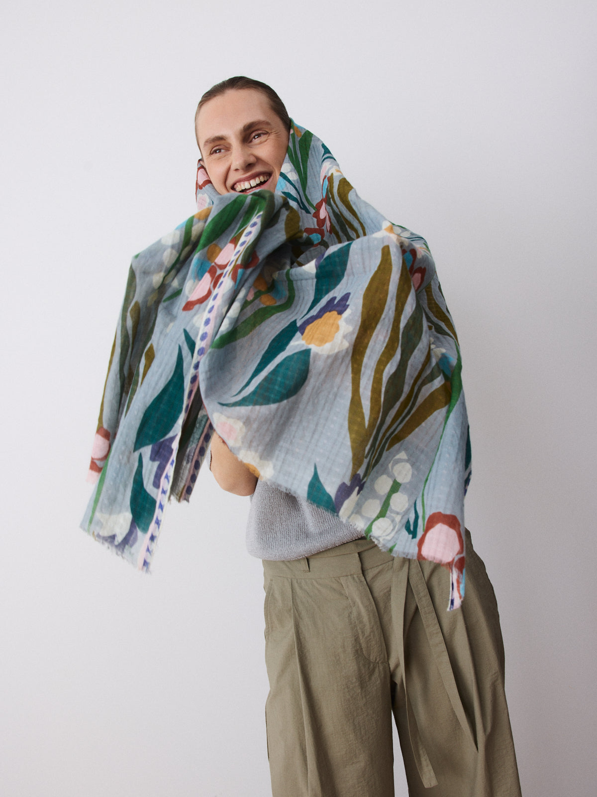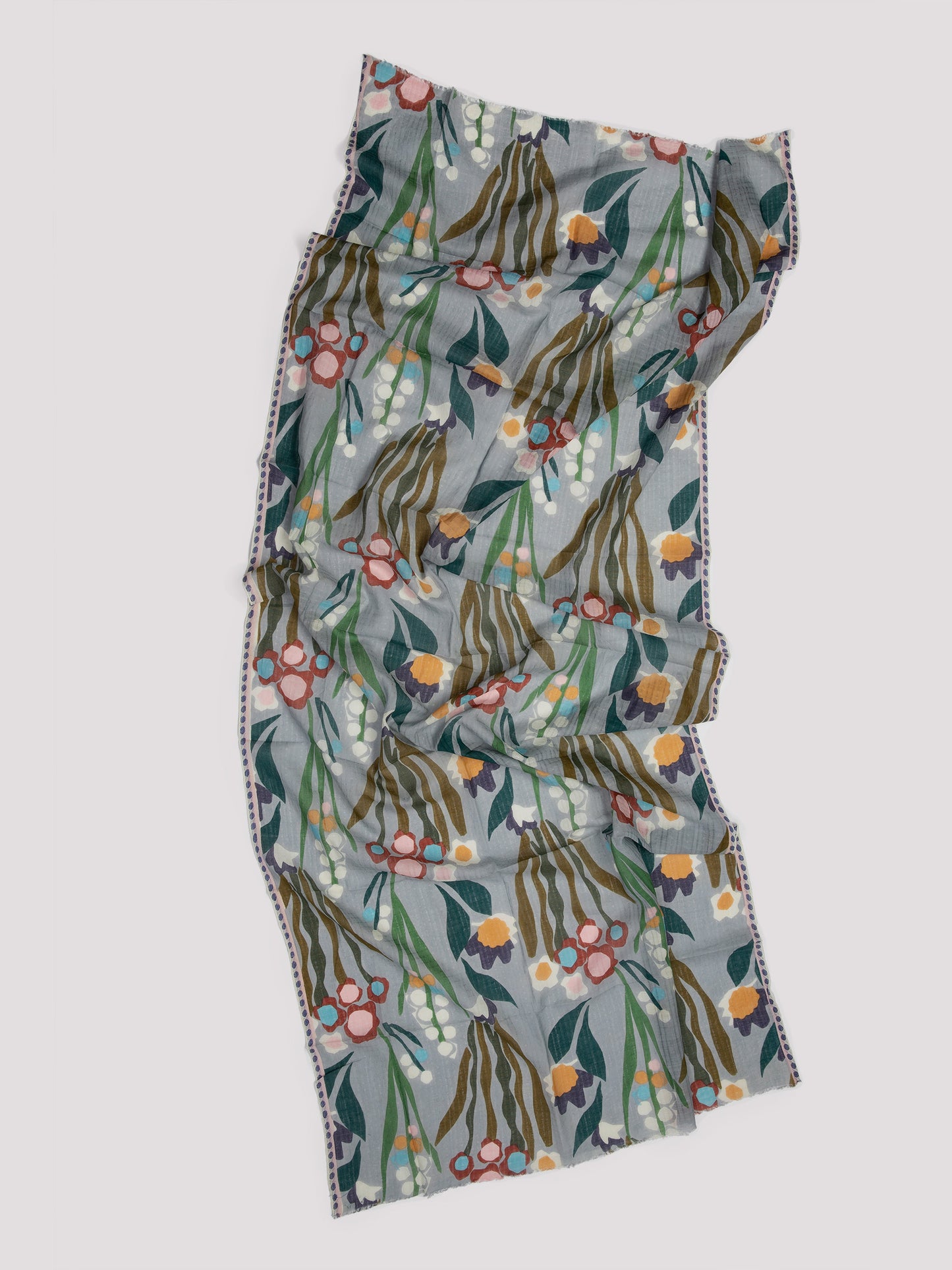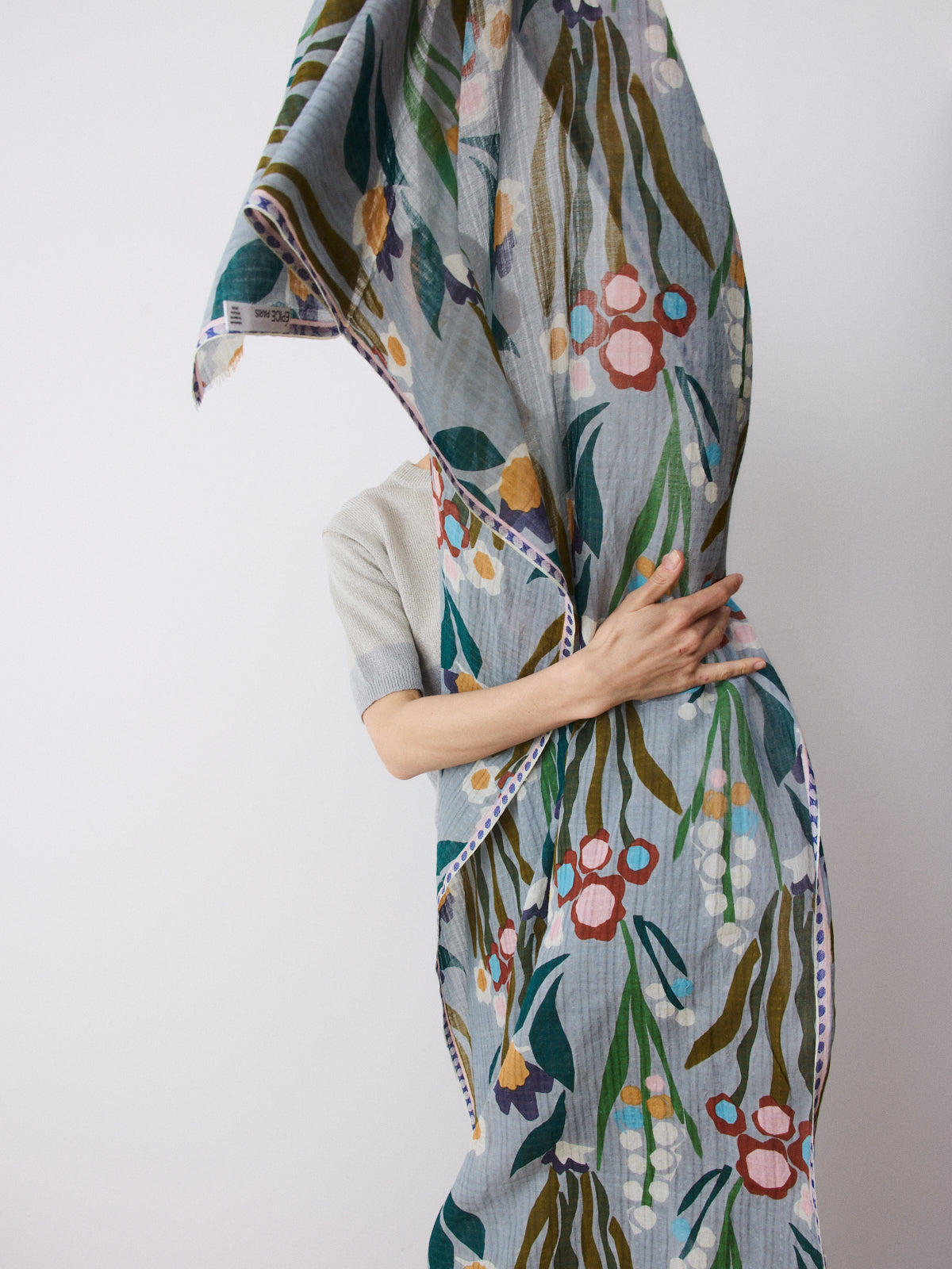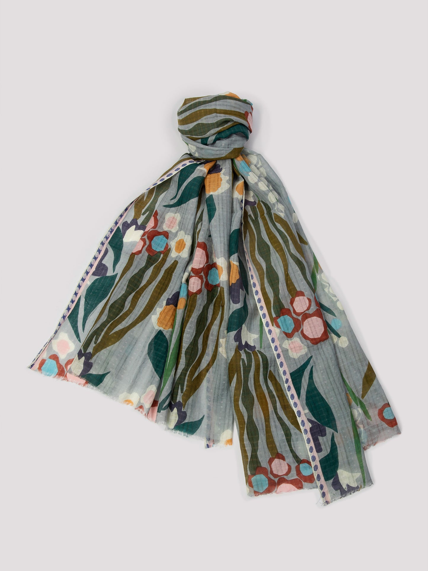 A printed scarf by ÉPICE Paris, defined by an abstract floral motif. Set on a stormy grey base with a green undertone, it is punctuated with tones of green and brown for the stems, alongside accents of orange, white, stone red, pink and blue. The handwoven grid weave gives it a fluid, airy drape.