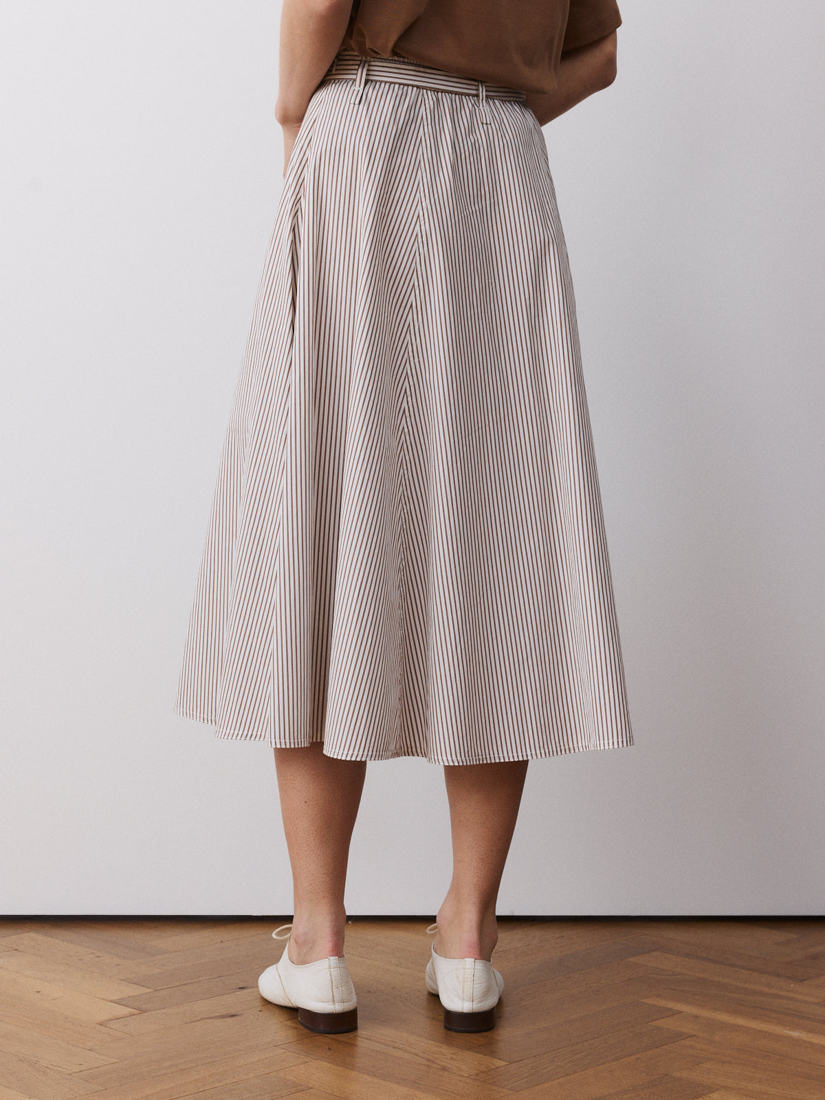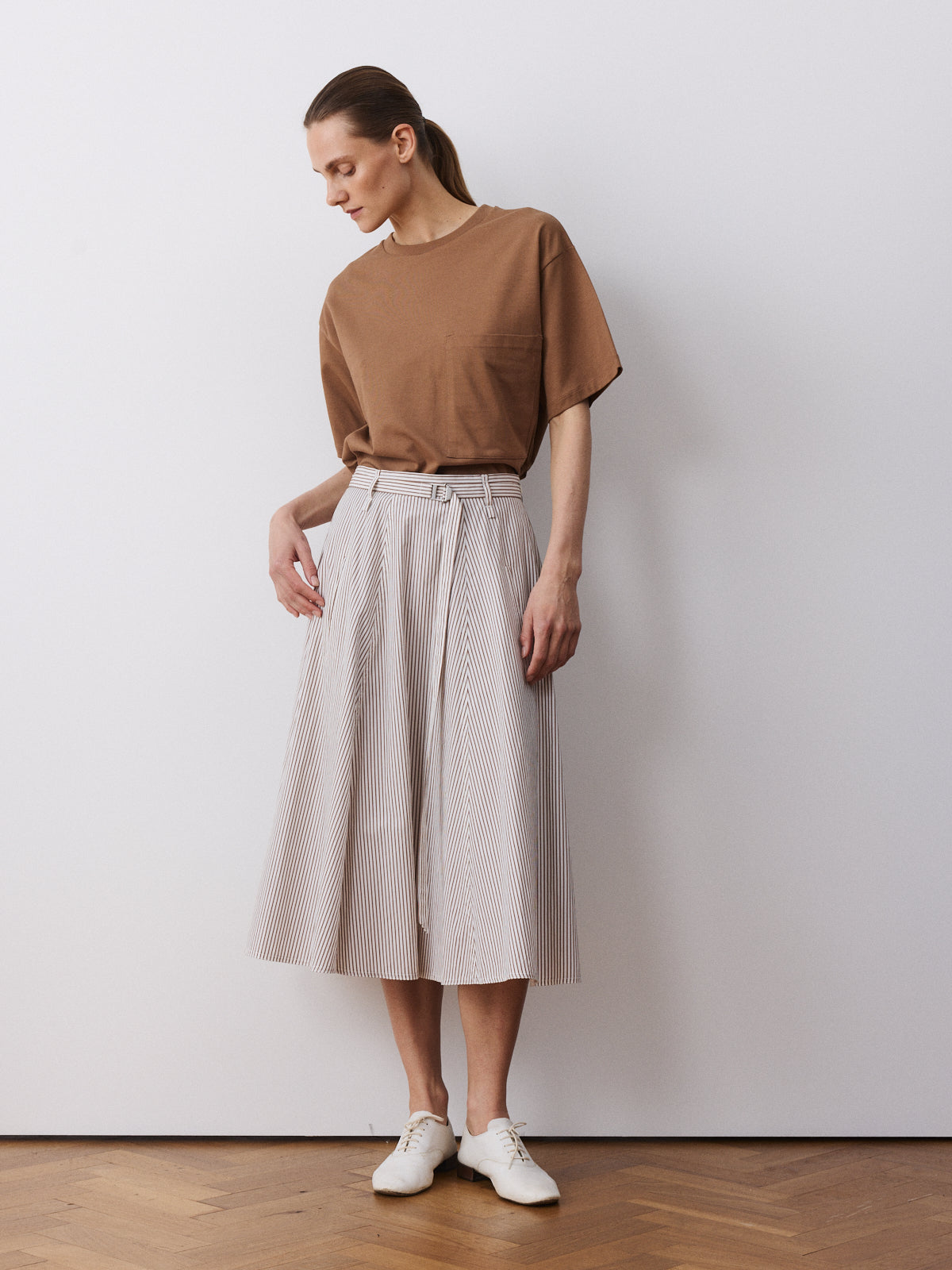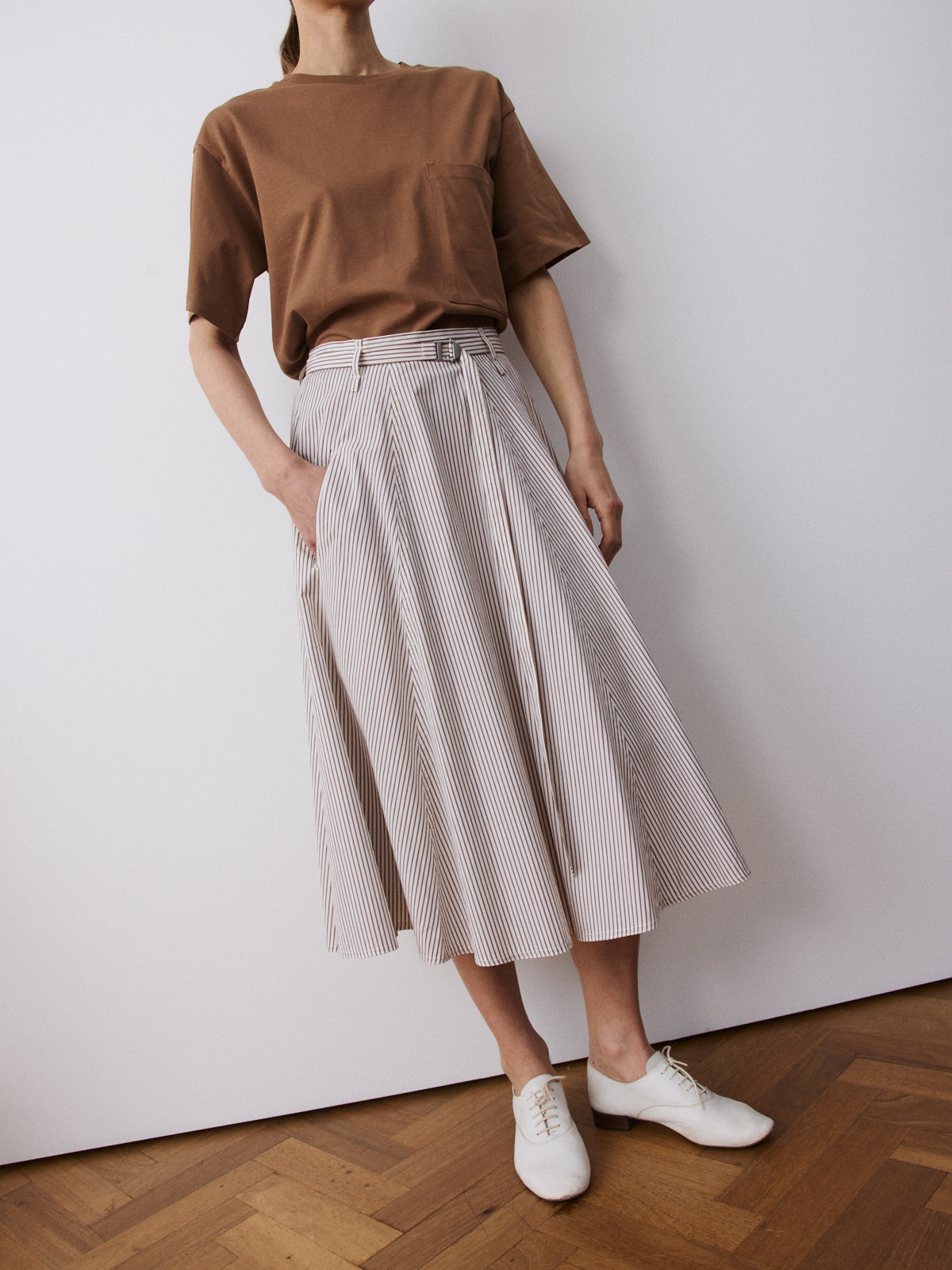 Lightweight and expressive, this midi skirt is designed for summer days. Cut with a high-rise and clean lines, it plays with proportion and movement. The ecru base, marked by a fine brown stripe, gives the piece a graphic, summery character.